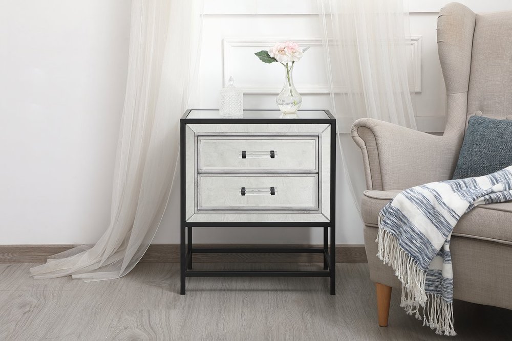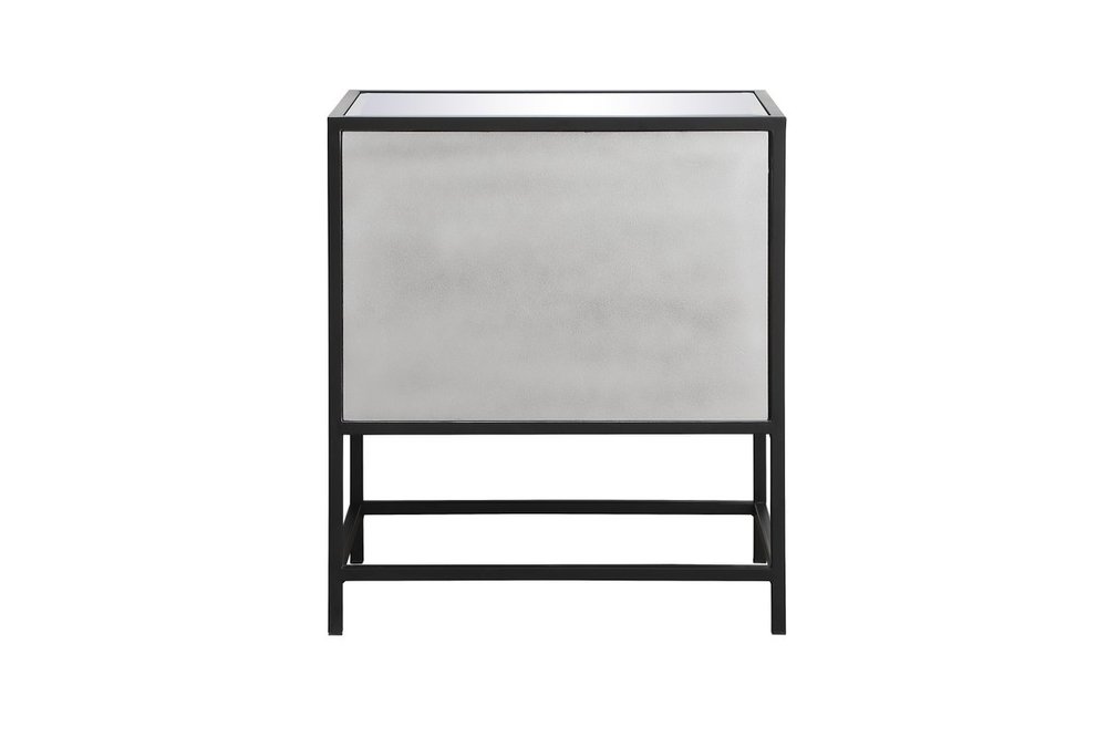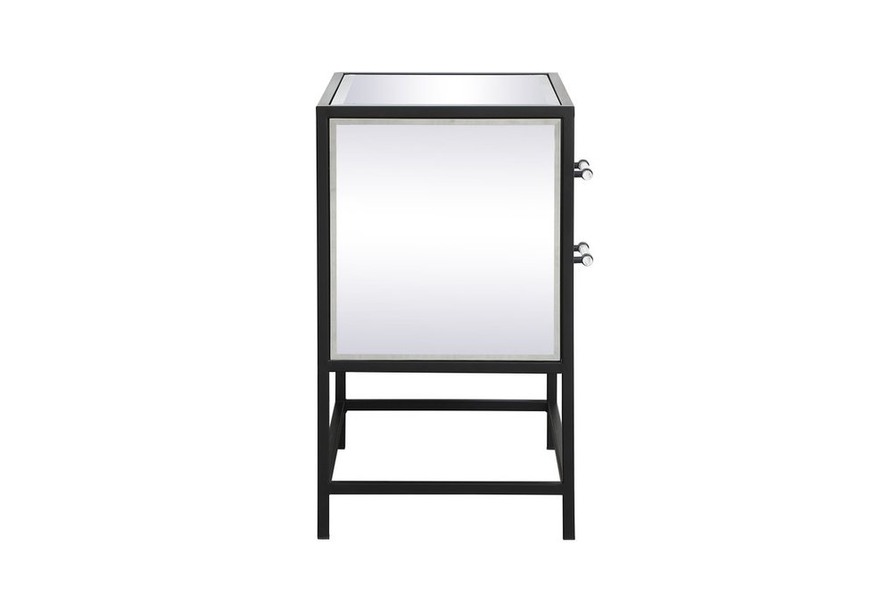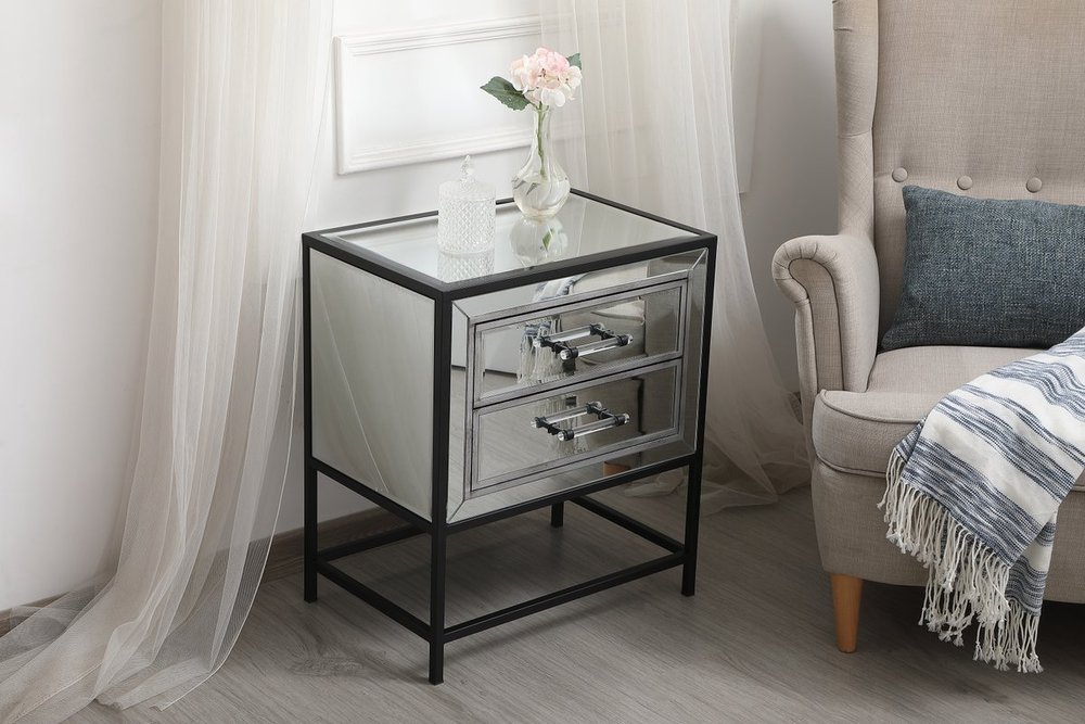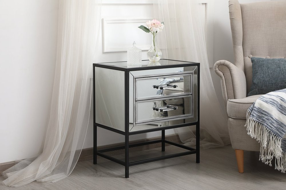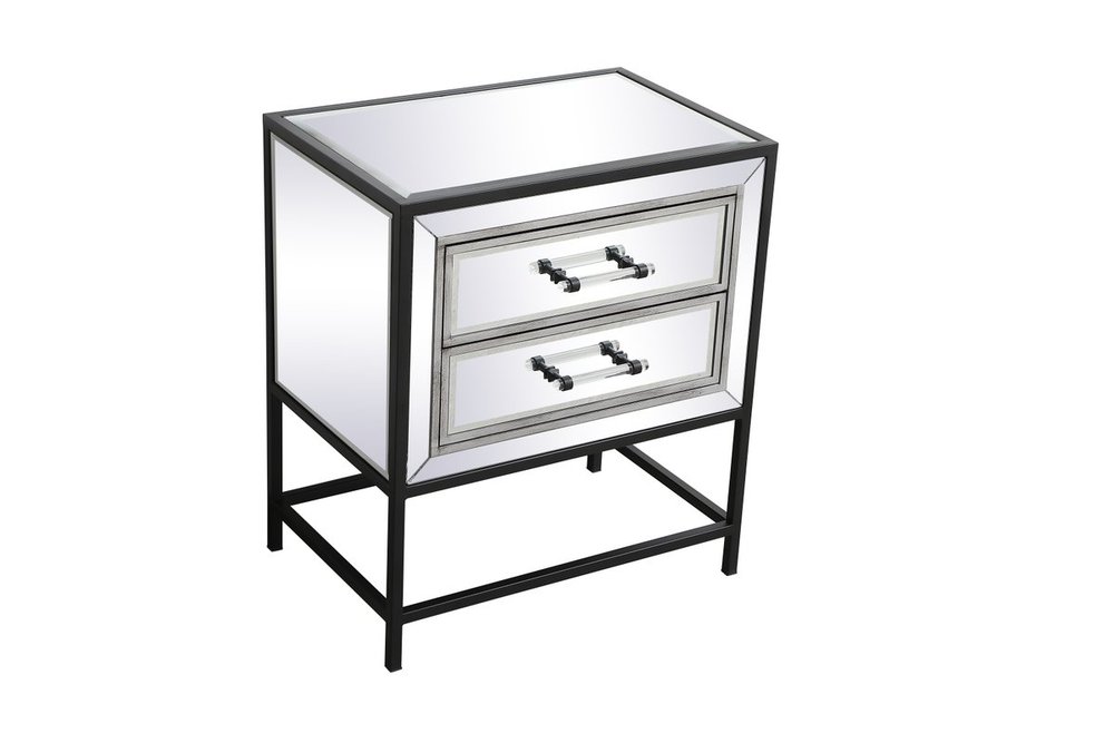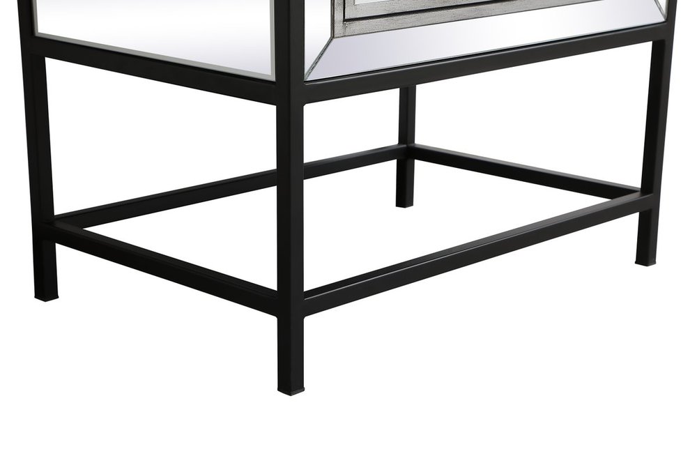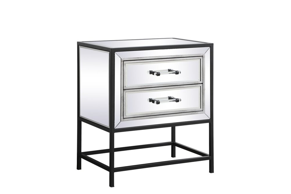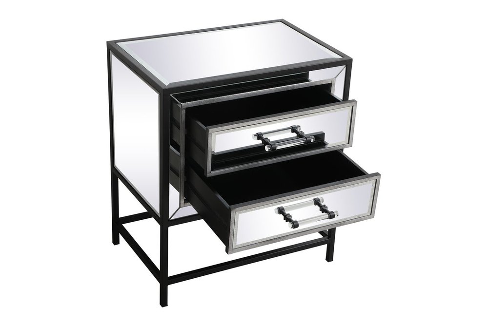 The Beau collection mirrored furniture in a black finish will add lovely sophistication and complement any living room or bedroom area, while utilizing its charm and function to provide you with ample storage spaces. Clear acrylic handle gently adorn the mirrored panel and contrasting black metal legs, allowing for you to store away your essentials.