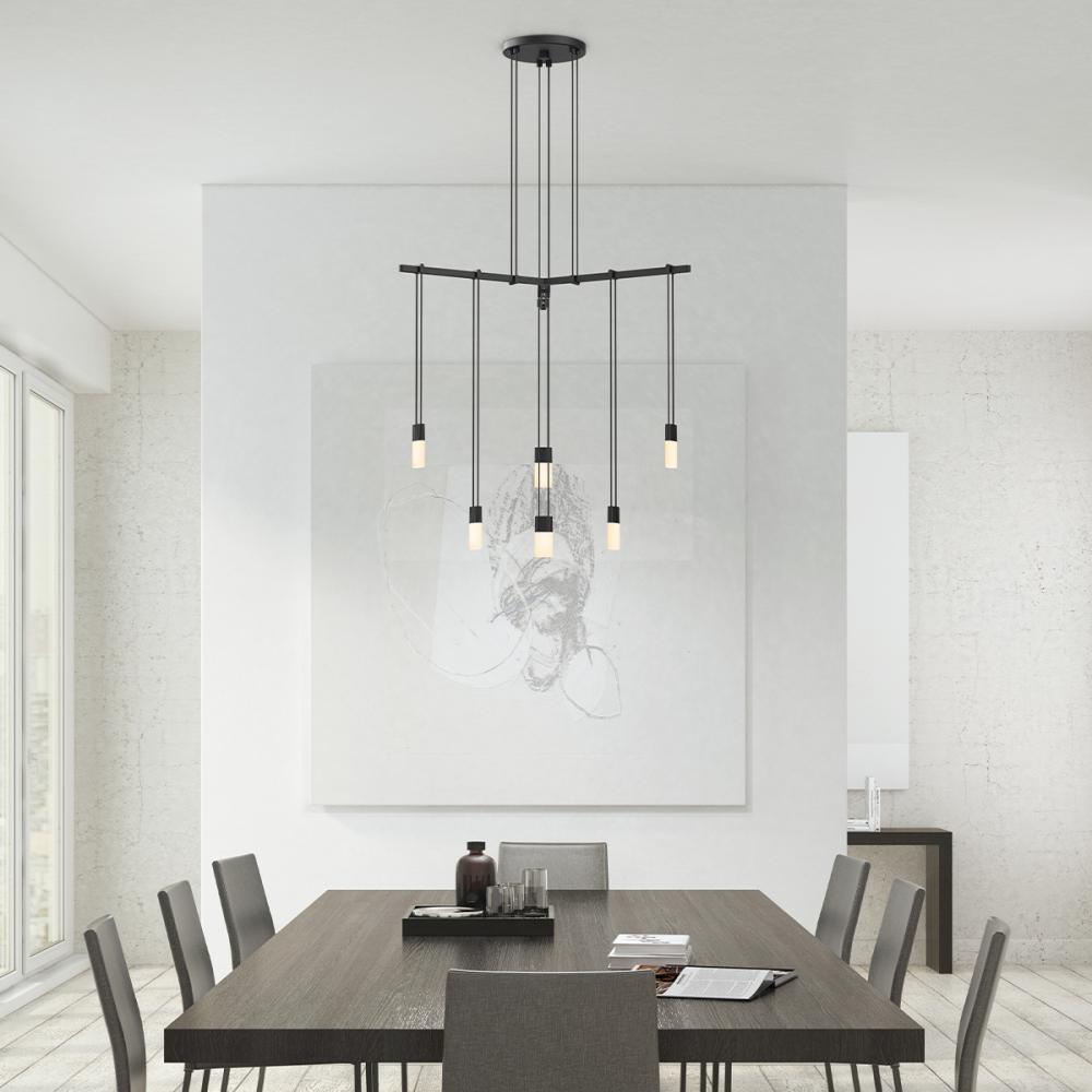 Chiclet Luminaires suspended at staggered heights from a 120-degree Tri-Bar form this luminous array of minimalistsimplicity.