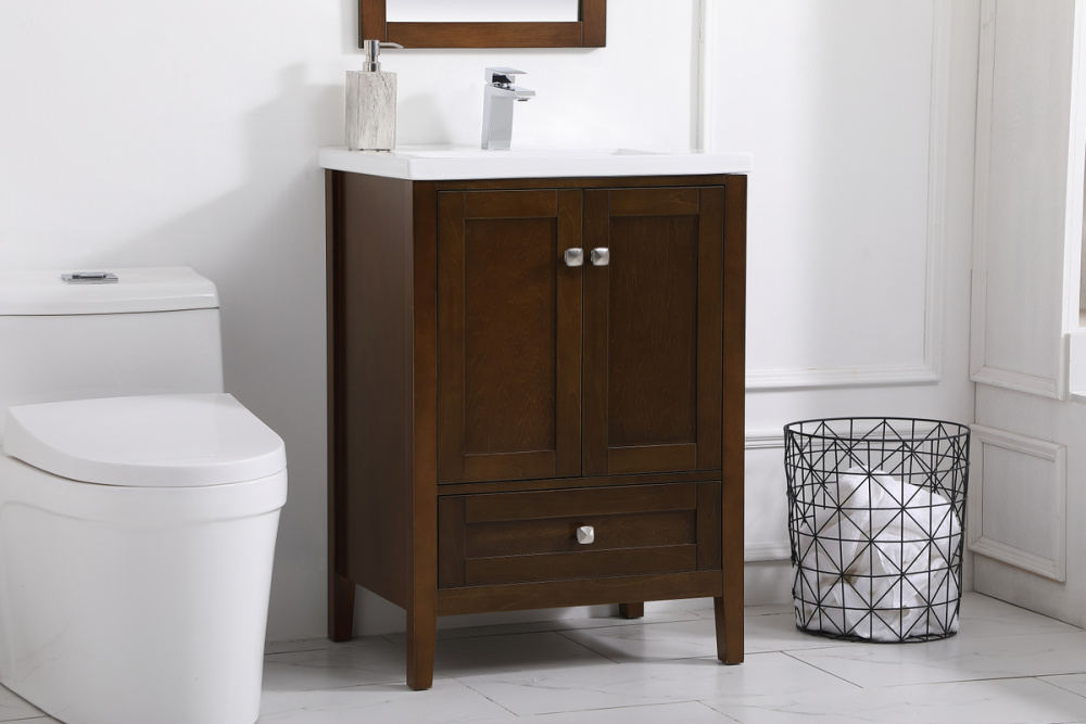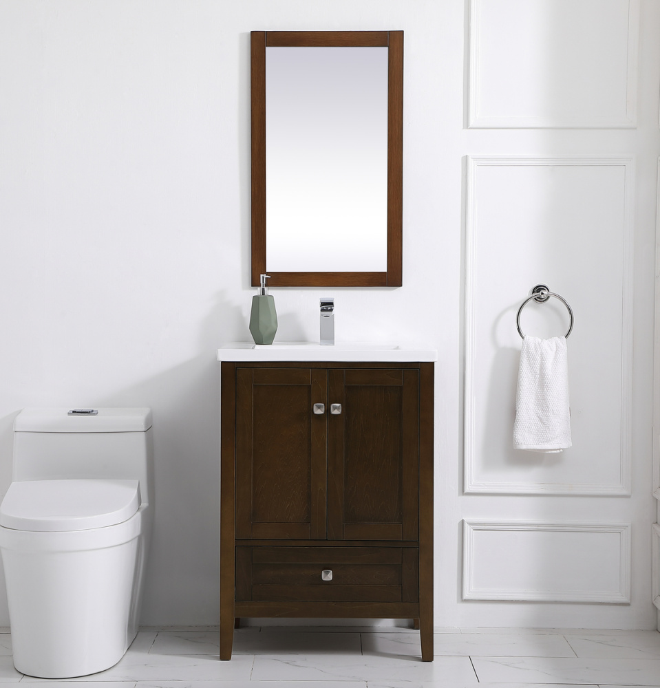Featuring a “chic and unique” rectangular resin countertop and sink, our “Aqua” vanity in antique coffee finish will naturally augment and beautify your guest or office bathroom! We’ve designed this vanity with high-grade resin, ensuring non-stain, scratch resistant, maintenance-free use. With ample storage space behind 2 “straight-line” doors—accented by brushed steel door knobs— (the cabinet frame and tapered legs are also solid wood), this vanity merges form and function magnificently. Measurements: W24” x D18” x H34”. The cabinet is constructed of kiln-dried solid wood and MDF, the drawer are installed with soft close under mount slides for easy closing, and the resinn top comes with a Single faucet hole, the faucets shown are not included. Comes completely assembled with expertly engineered packing.