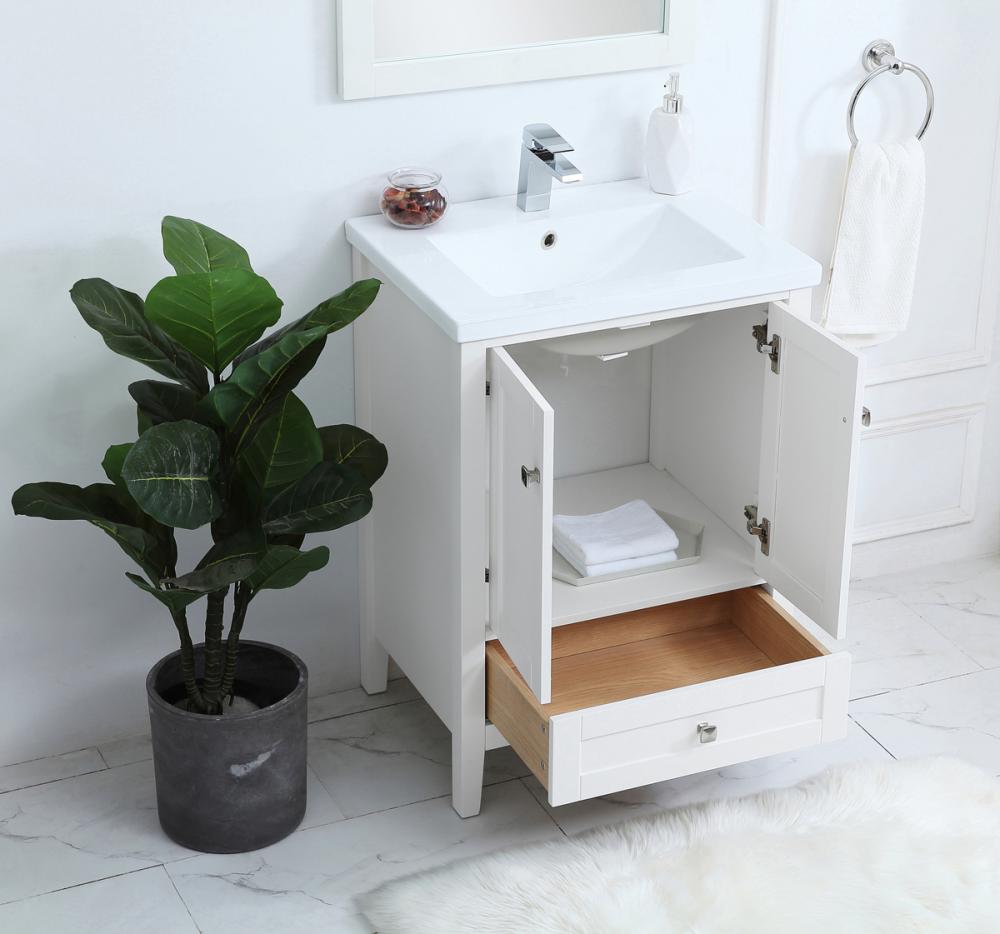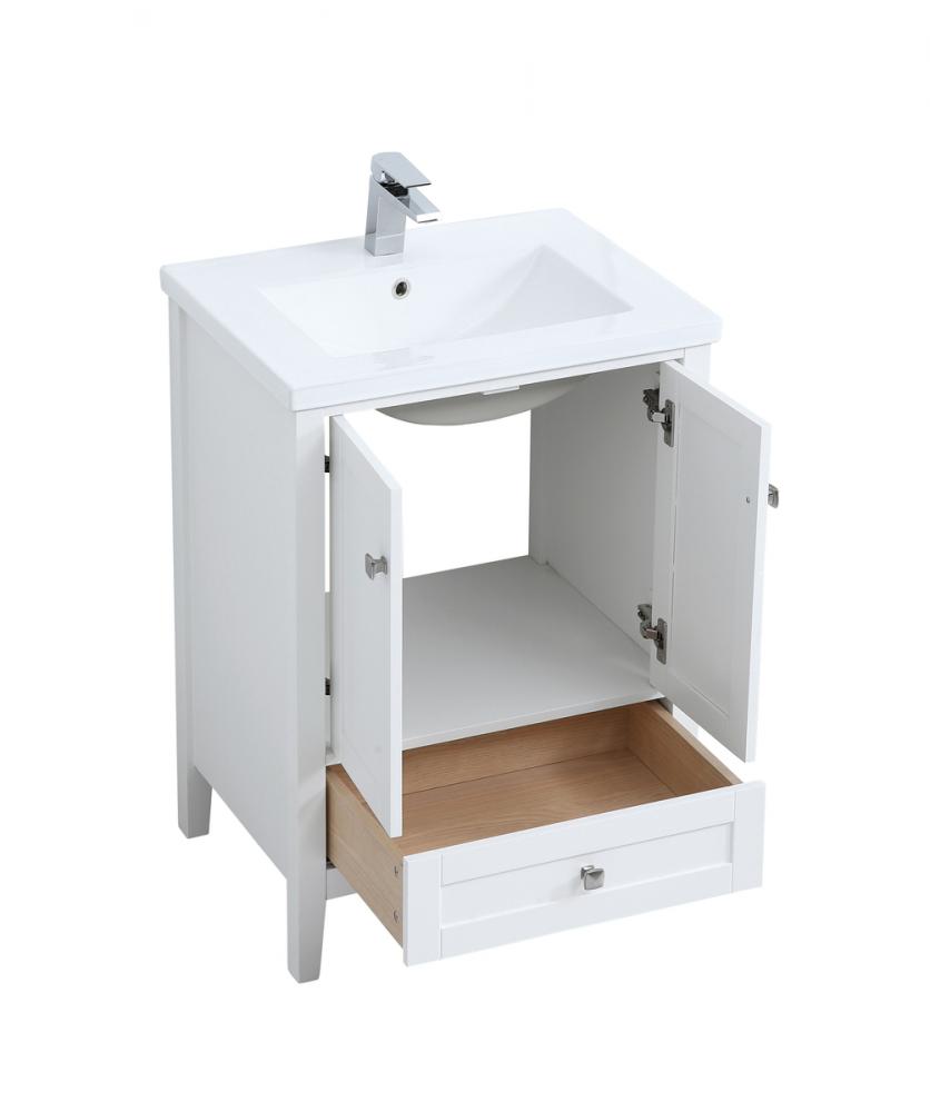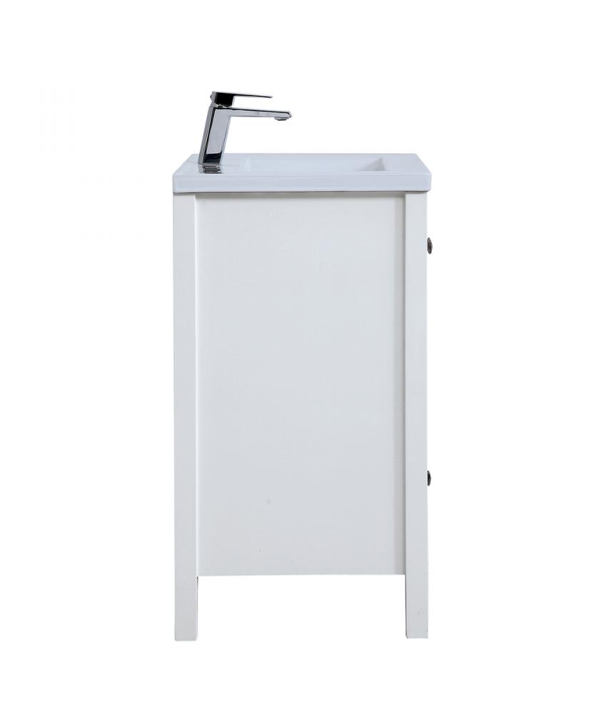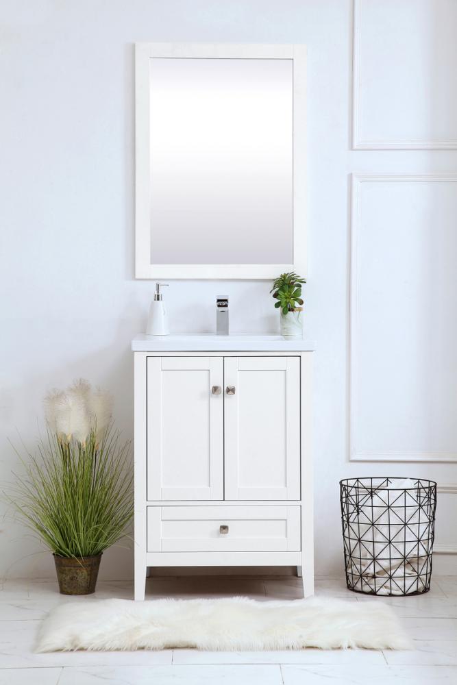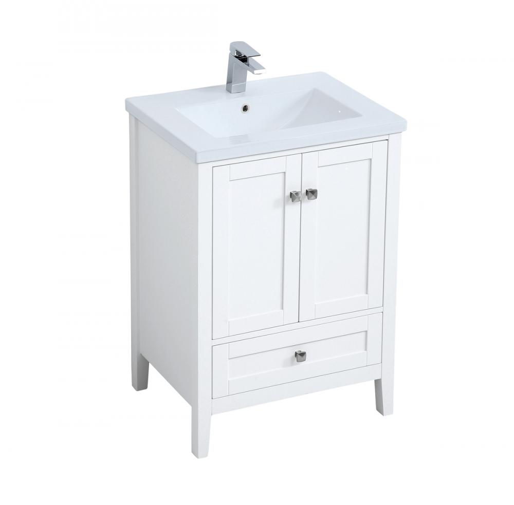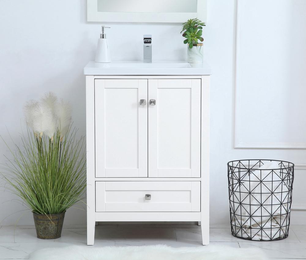 Featuring a “chic and unique” rectangular resin countertop and sink, our “Aqua” vanity will naturally augment and beautify your guest or office bathroom! We’ve designed this vanity with an abundance of high-grade resin, ensuring non-stain, scratch resistant, maintenance-free use. With ample storage space behind 2 “straight-line” doors—accented by brushed steel finish knobs—and within the solid wood drawer (the cabinet frame and tapered legs are also solid wood), this vanity merges form and function magnificently. · Measurements: W24” x D18” x H34” · white resin rectangular countertop · Single faucet hole, ready to install · white resin rectangular sink · 2 soft-closing doors, 1 solid wood drawer with soft-closing undermount slides · Constructed of kiln-dried solid wood and MDF · Faucets shown are not included. Cabinet comes completely assembled—resin countertop easily attached to cabinet. Expertly engineered packing.
