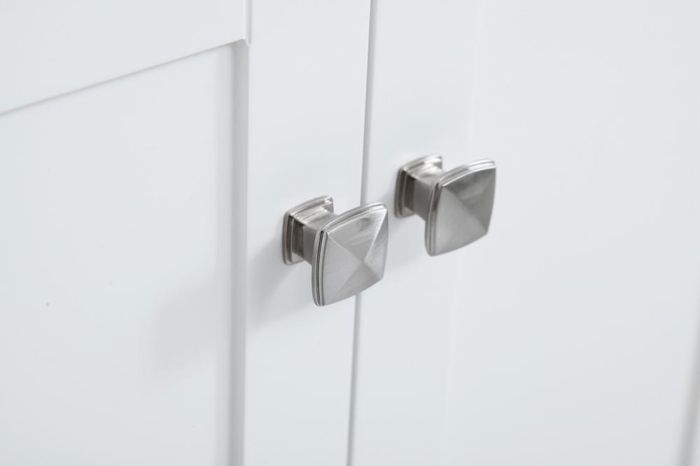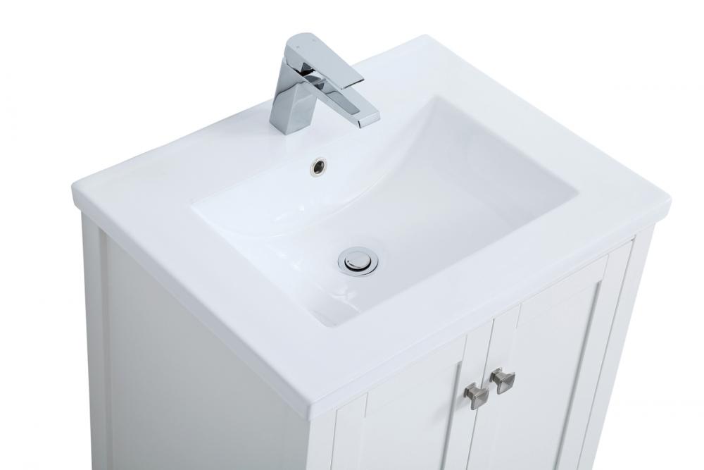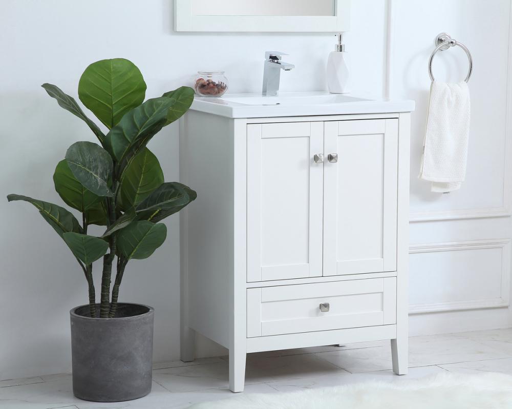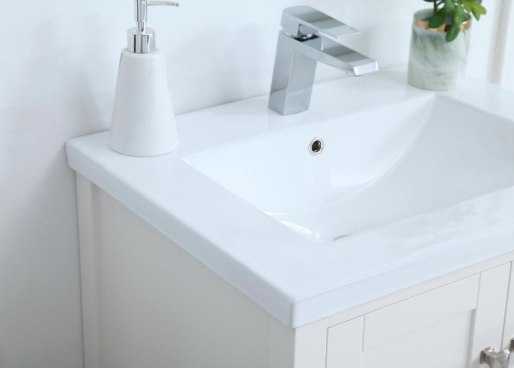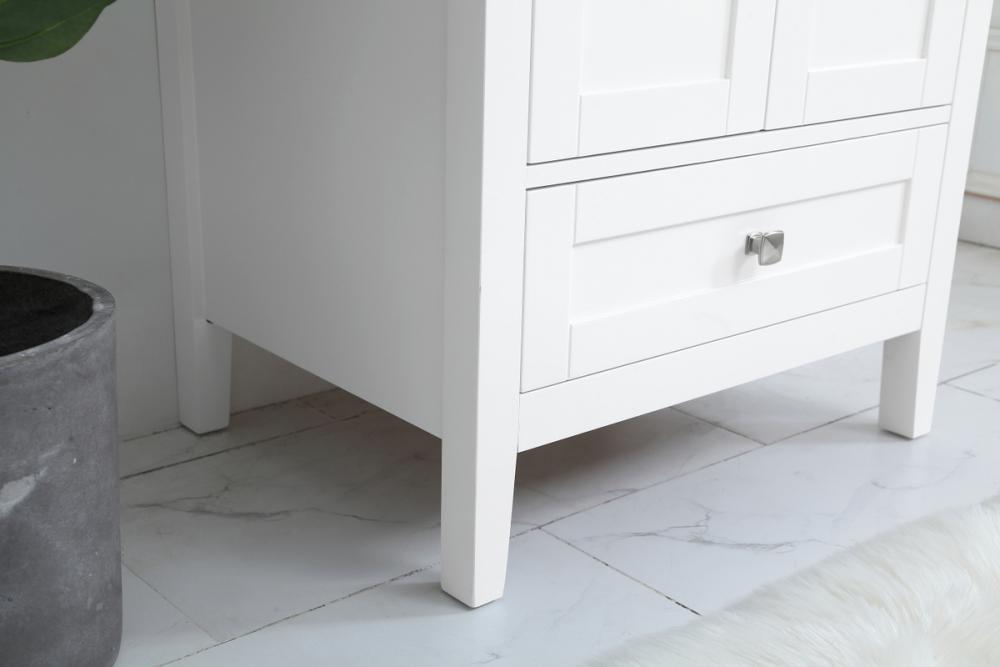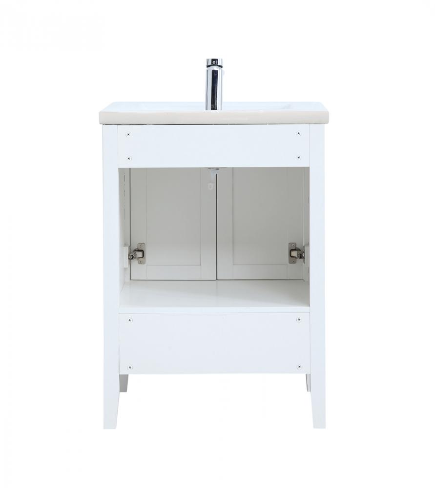 Featuring a “chic and unique” rectangular resin countertop and sink, our “Aqua” vanity will naturally augment and beautify your guest or office bathroom! We’ve designed this vanity with an abundance of high-grade resin, ensuring non-stain, scratch resistant, maintenance-free use. With ample storage space behind 2 “straight-line” doors—accented by brushed steel finish knobs—and within the solid wood drawer (the cabinet frame and tapered legs are also solid wood), this vanity merges form and function magnificently. · Measurements: W24” x D18” x H34” · white resin rectangular countertop · Single faucet hole, ready to install · white resin rectangular sink · 2 soft-closing doors, 1 solid wood drawer with soft-closing undermount slides · Constructed of kiln-dried solid wood and MDF · Faucets shown are not included. Cabinet comes completely assembled—resin countertop easily attached to cabinet. Expertly engineered packing.
