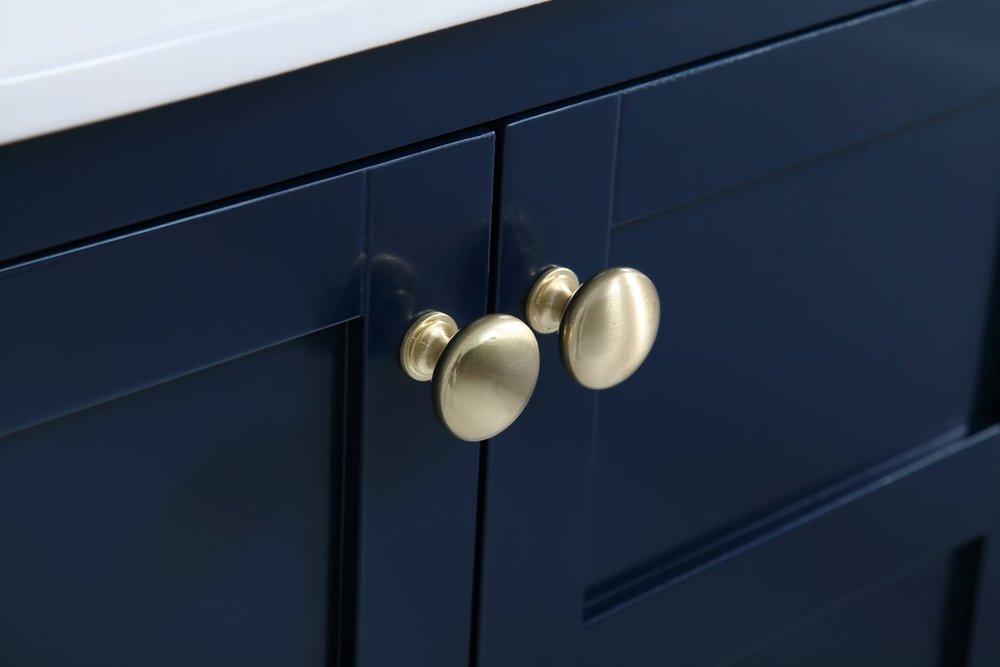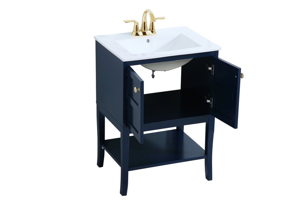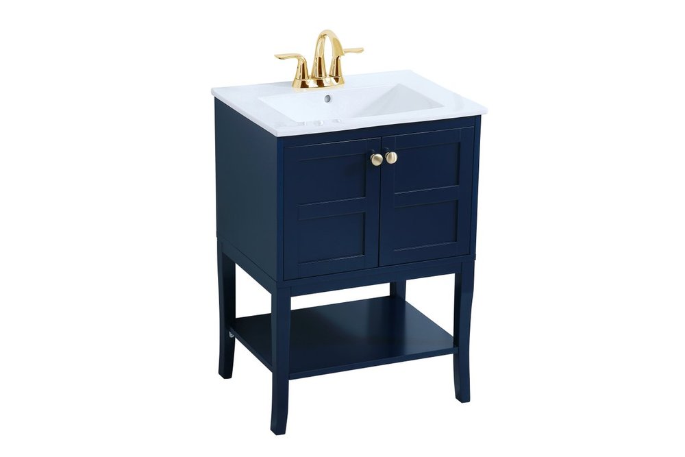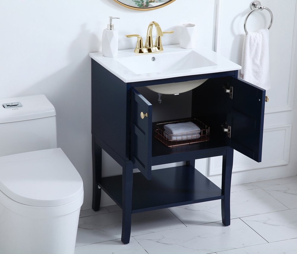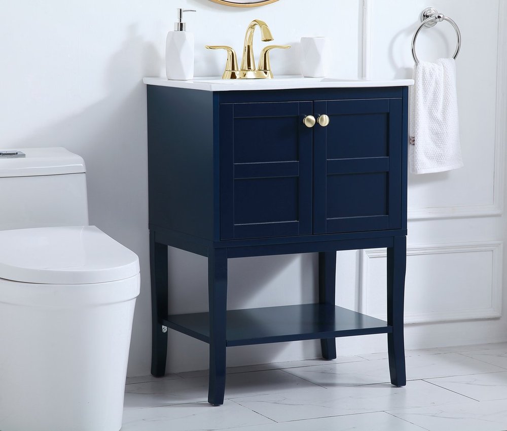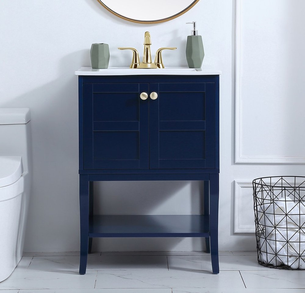 Designed with simple beauty and clean lines in mind , the Mason vanity will surely bring a unique flair to the modern day guest or office bathroom. Its transitional design features 2 framed doors and an open shelf for your additional bathroom essential, topped with a modern white porcelain counter top with an integrated sink, which ensure non stain, scratch resistance and maintenance free use. the cabinet is painted in modern blue, accented with round gold door knobs, and build by solid wood frame, with graciously curved legs.