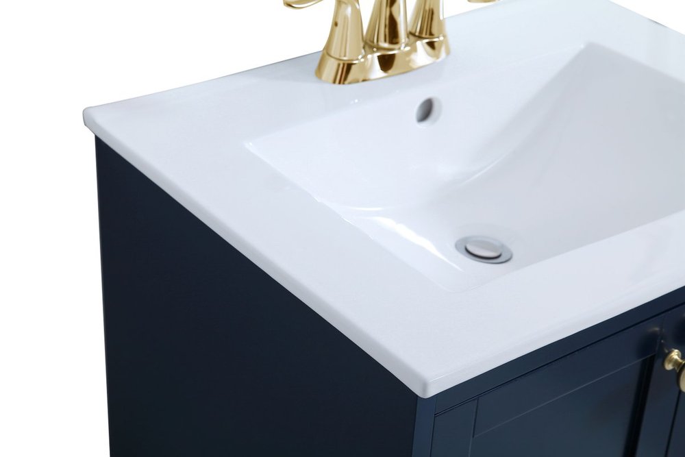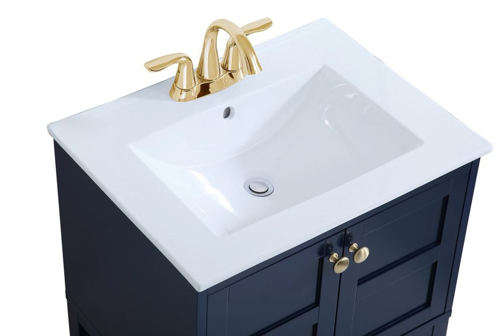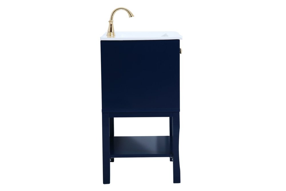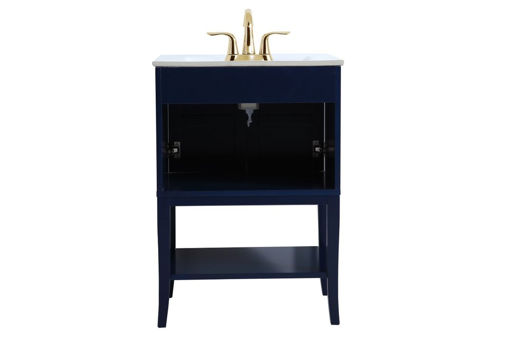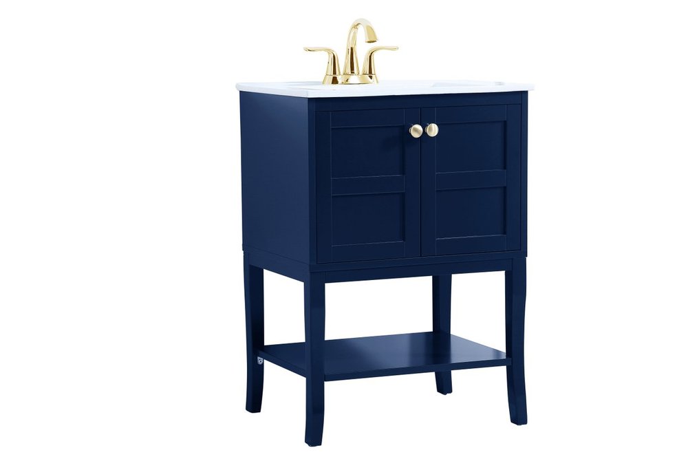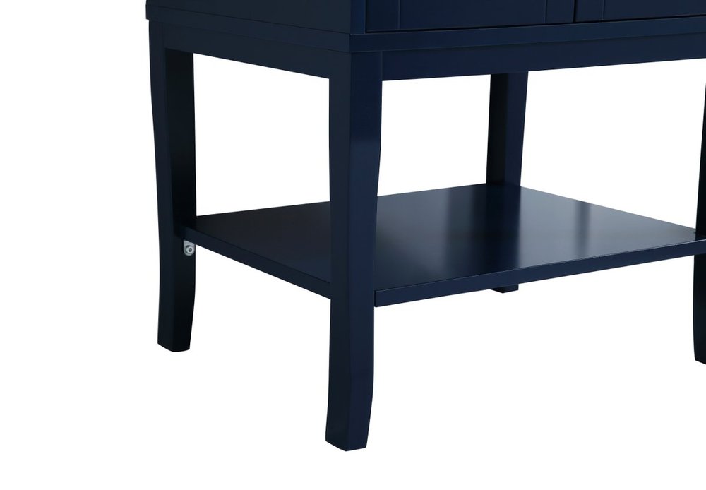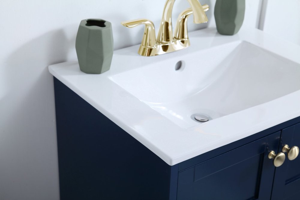 Designed with simple beauty and clean lines in mind , the Mason vanity will surely bring a unique flair to the modern day guest or office bathroom. Its transitional design features 2 framed doors and an open shelf for your additional bathroom essential, topped with a modern white porcelain counter top with an integrated sink, which ensure non stain, scratch resistance and maintenance free use. the cabinet is painted in modern blue, accented with round gold door knobs, and build by solid wood frame, with graciously curved legs.
