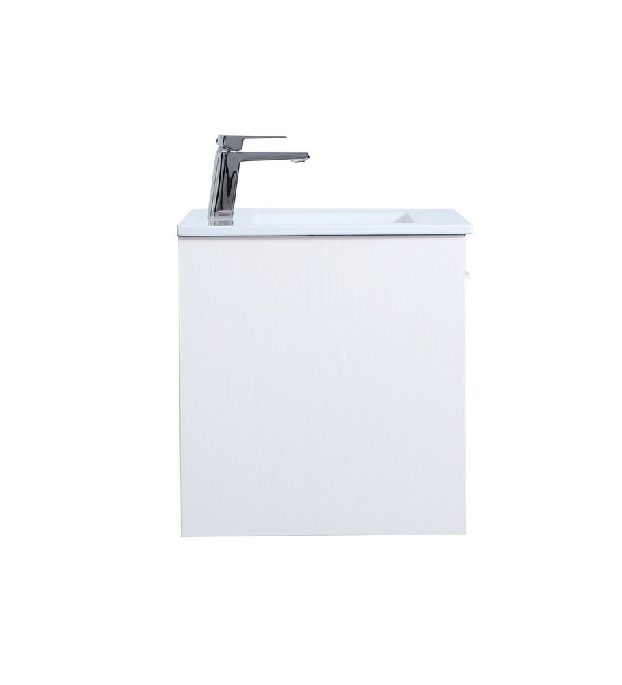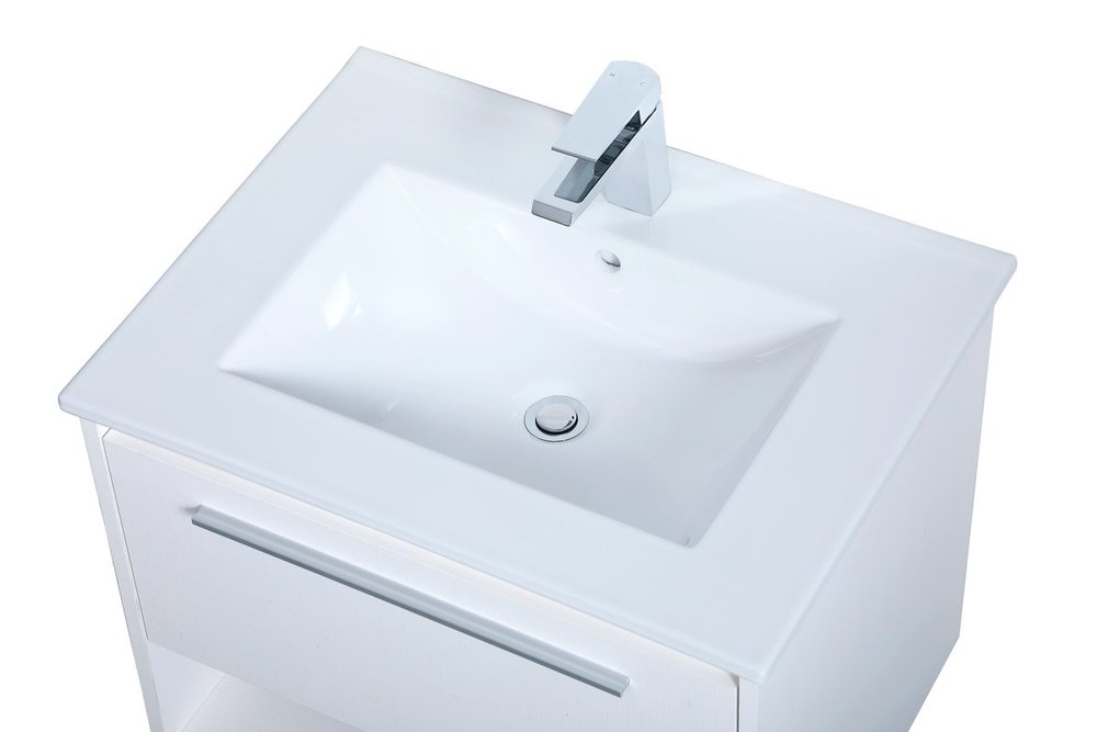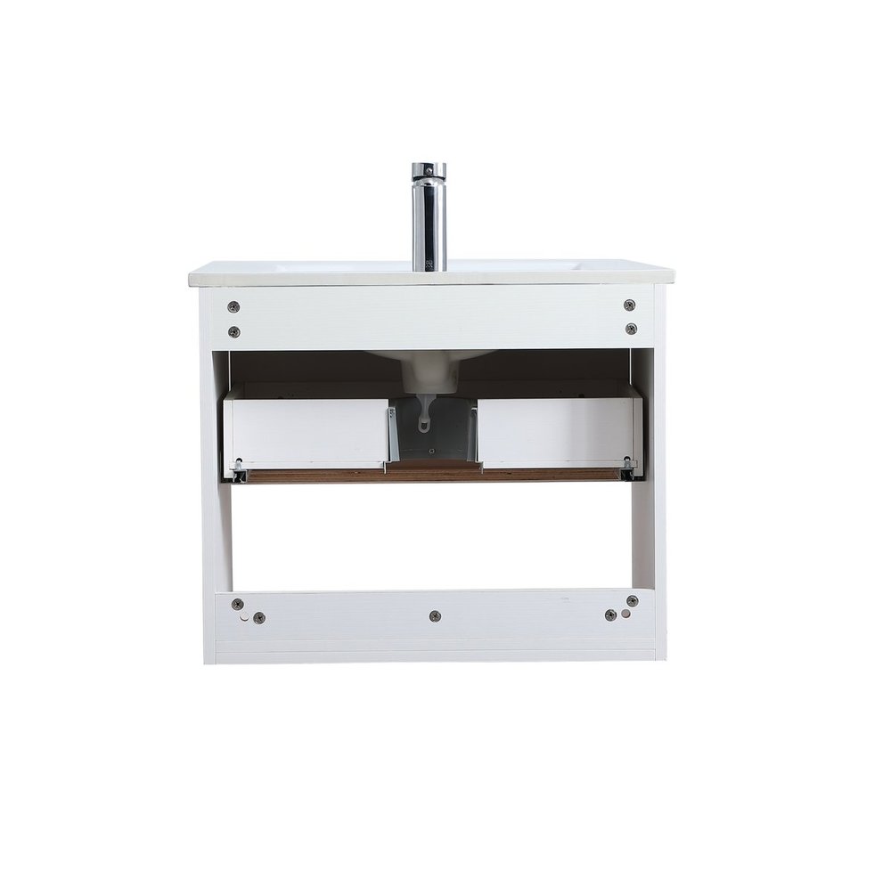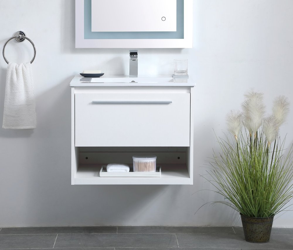 Save space and make your bathroom appear bigger with this 24" floating vanity in a white finish. Its minimal design will have you in awe, while its clean lines will leave your room feeling fresh and uncluttered. The Single u-drawer pulls out for storage while the open space below allows you to place extra towels or various other essentials.