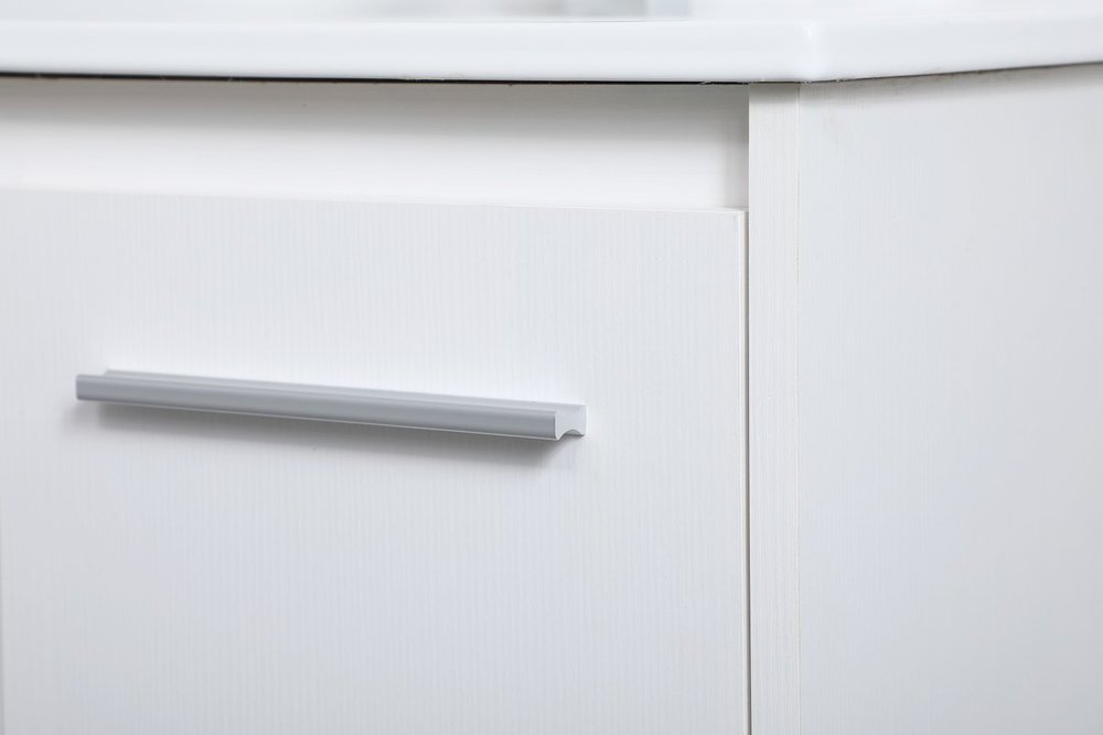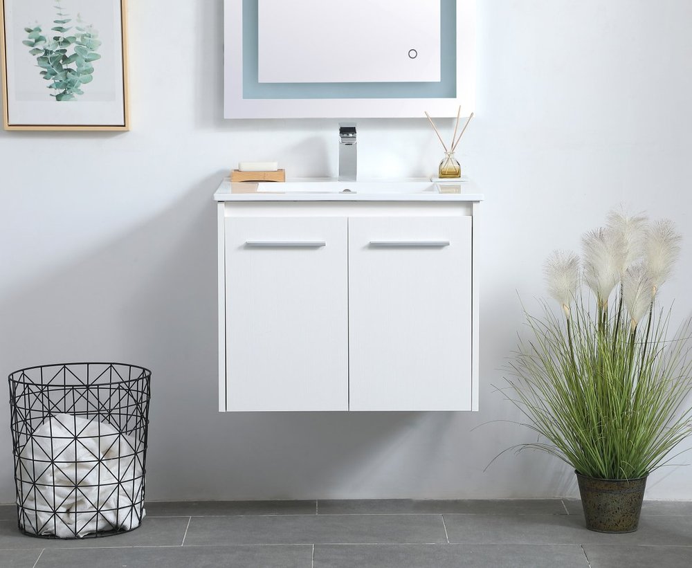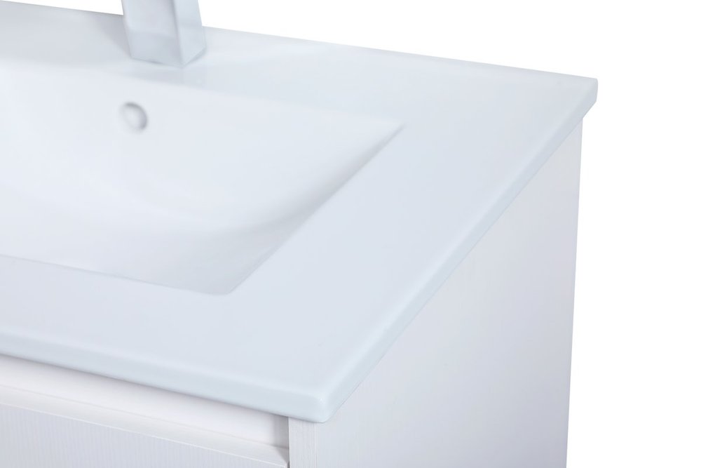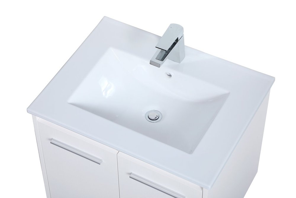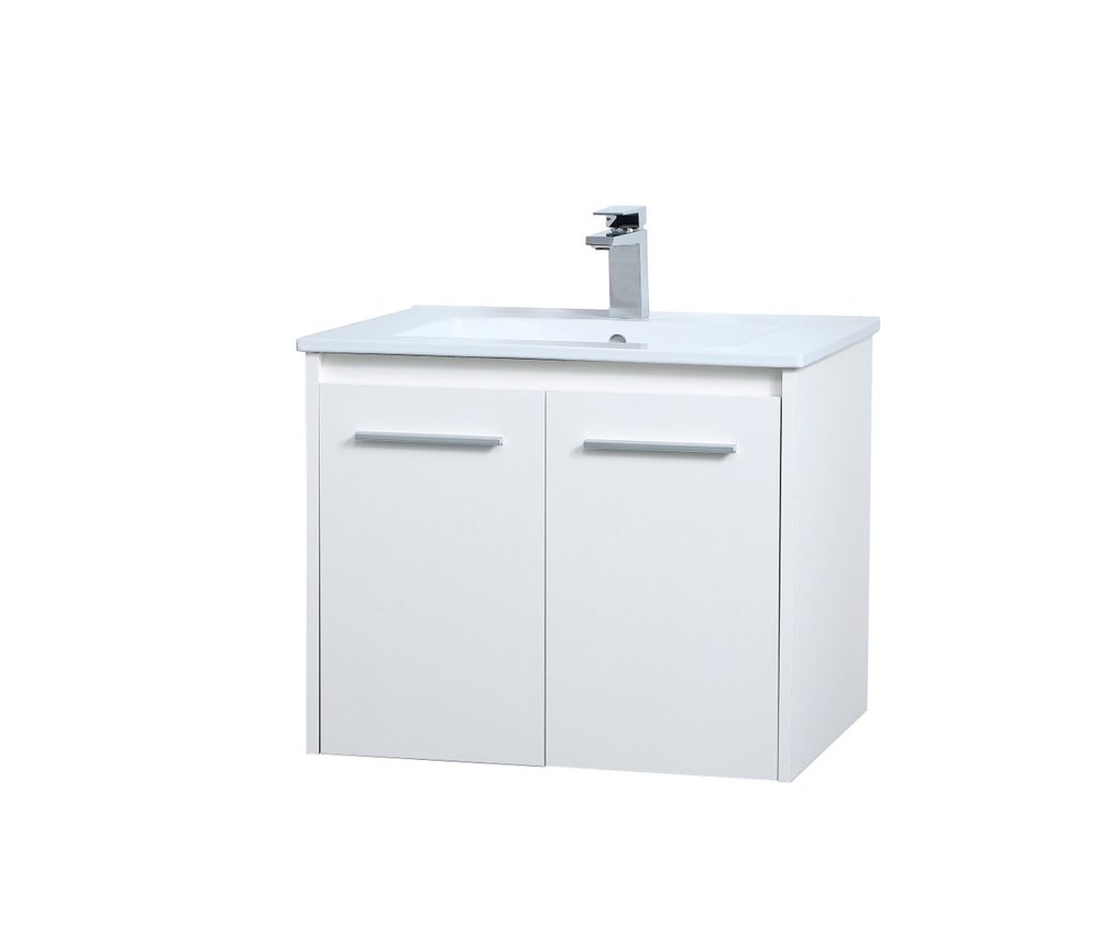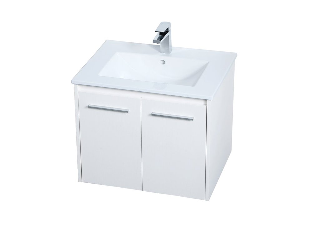 The contemporary simplicity of this 24" floating vanity in a white finish will help open the space and add stunning modern flair to your bathroom or powder room. The open space below makes it easy to show off your tiles and to clean the floor with ease--it's also the perfect place for a hamper. Double doors open to reveal plentiful of storage pace to store all of your bathroom miscellany. The clean lines that permeate through the design will surely create a fresh look in your home.