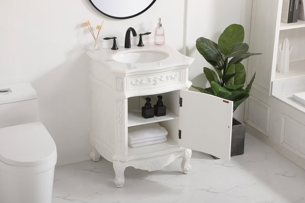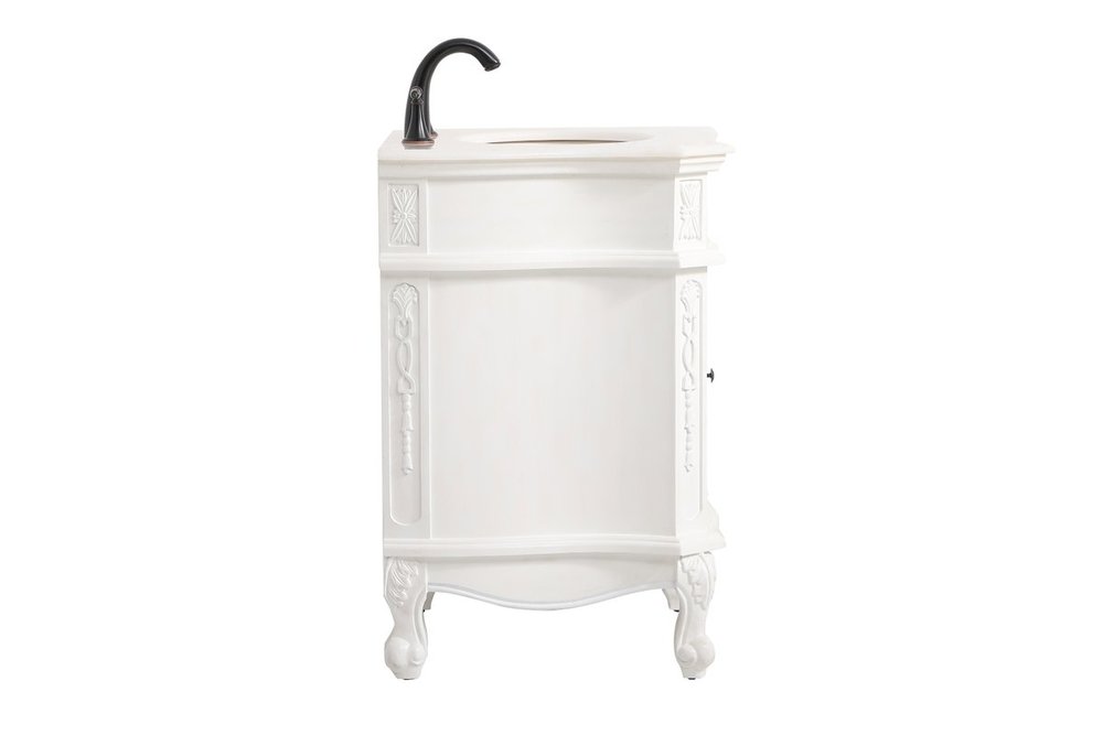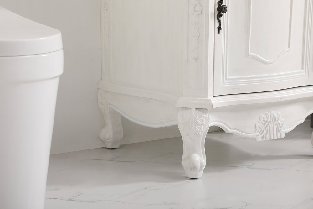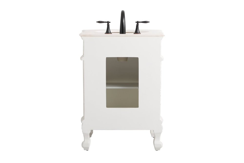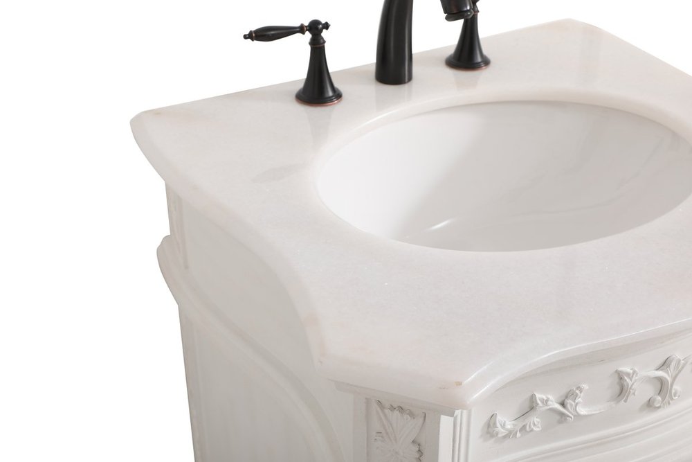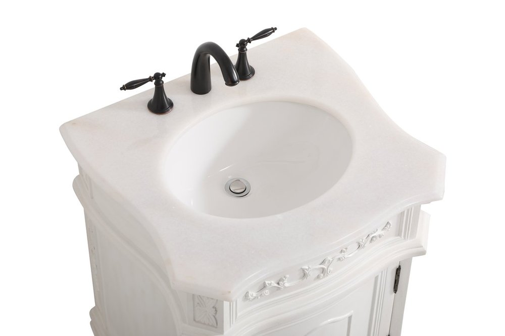 Create a refined and relaxing bath space with this traditional design vanity, presenting its ornate lines. This vanity, crafted of solid poplar wood and engineered wood panels, provides ample storage within its soft-close cabinet door, accentuated with metal hardware. Rounding out the design is an off-white marble with some brown veining in the stone. Comes with a white porcelain under-mount oval sink. Ships fully assembled.
