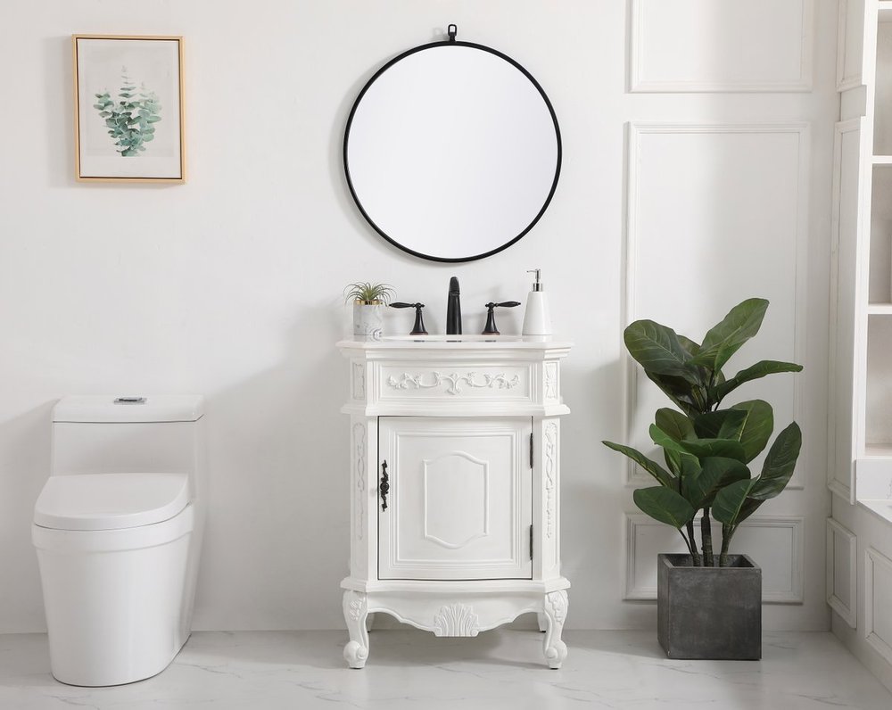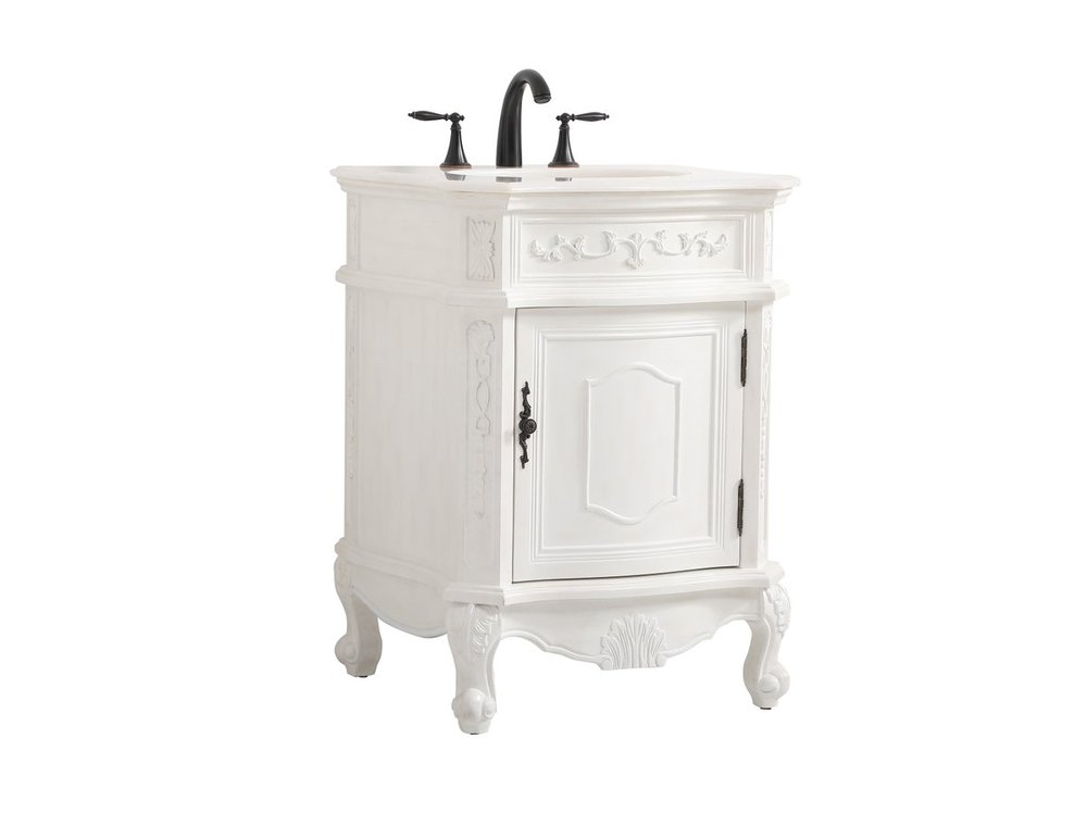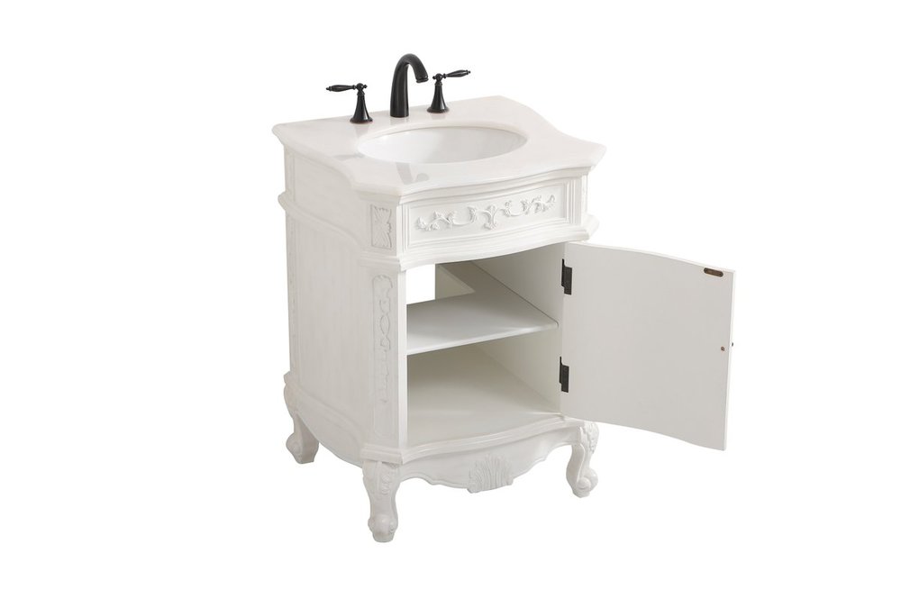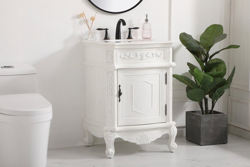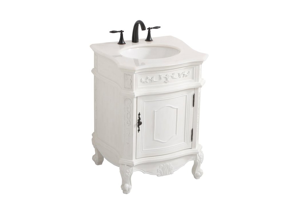 Create a refined and relaxing bath space with this traditional design vanity, presenting its ornate lines. This vanity, crafted of solid poplar wood and engineered wood panels, provides ample storage within its soft-close cabinet door, accentuated with metal hardware. Rounding out the design is an off-white marble with some brown veining in the stone. Comes with a white porcelain under-mount oval sink. Ships fully assembled.