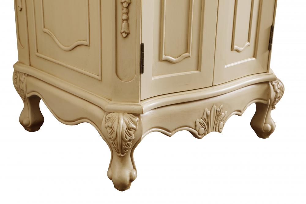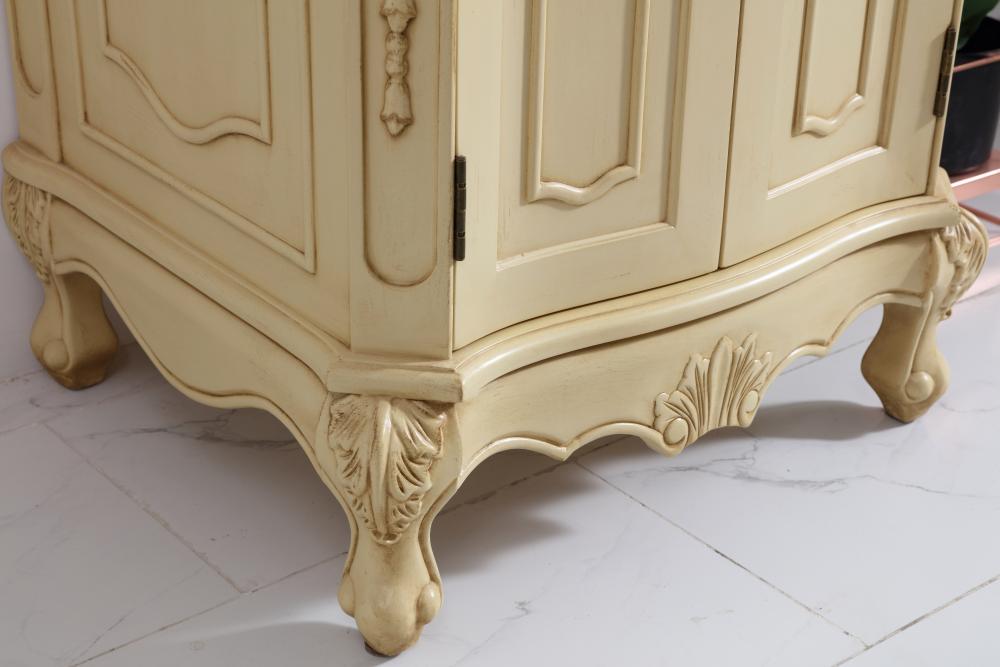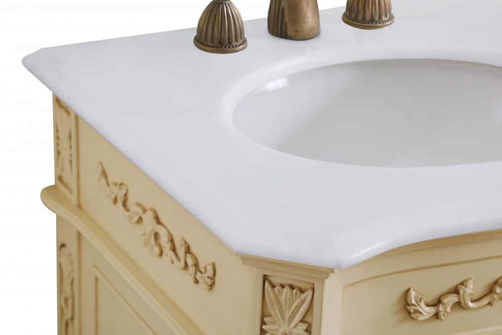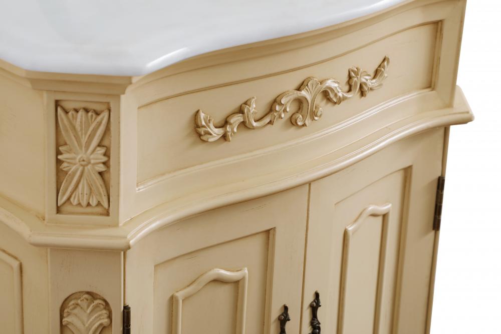 This superb balance of timeless tradition and opulent beauty in a engineered marble-topped vanity will certainly enhance the aesthetics of any home or office bathroom! Featuring an ivory white durable engineered marble countertop complimenting the hand painted cabinet with a delicate carved floral design, stands on stylishly carved solid wood French scroll feet. Don't let the design fool you, the engineered marble countertop and porcelain undermount sink allows for space to get ready, while the antique bronze hardware allows you to discover storage spaces with ease. You and your guests will marvel at this vanity that will both store away your bathroom essentials and enhance the aesthetics of your room.