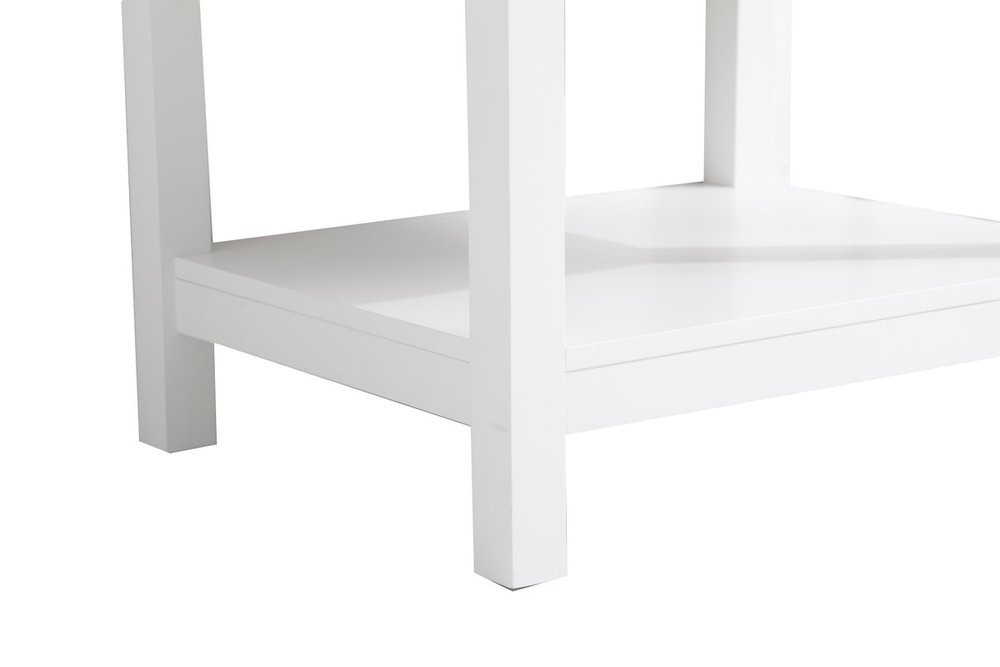 Make the most of your space with this 24" traditional style bathroom vanity. Its traditional style is able to complement many aesthetics with its white finish, Calacatta engineered marble countertop, and the contemporary slender brushed nickel handle bar that sits on the upper false drawer and the lower u-shaped drawer, allowing you to store an assortment of bathroom essentials. The lower shelf makes it the perfect space to hold new towels for your guests. This compact vanity ensures both form and function in your bathroom or powder room for you and your guests.
