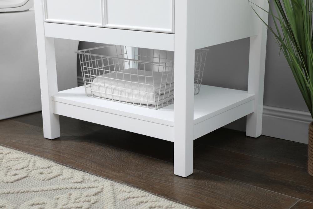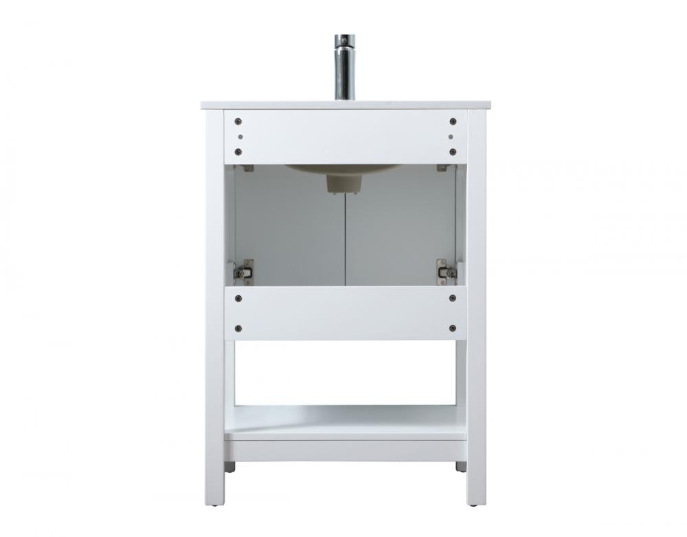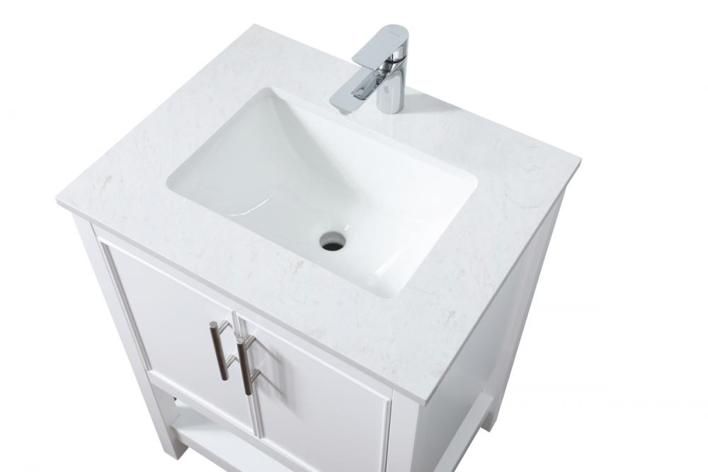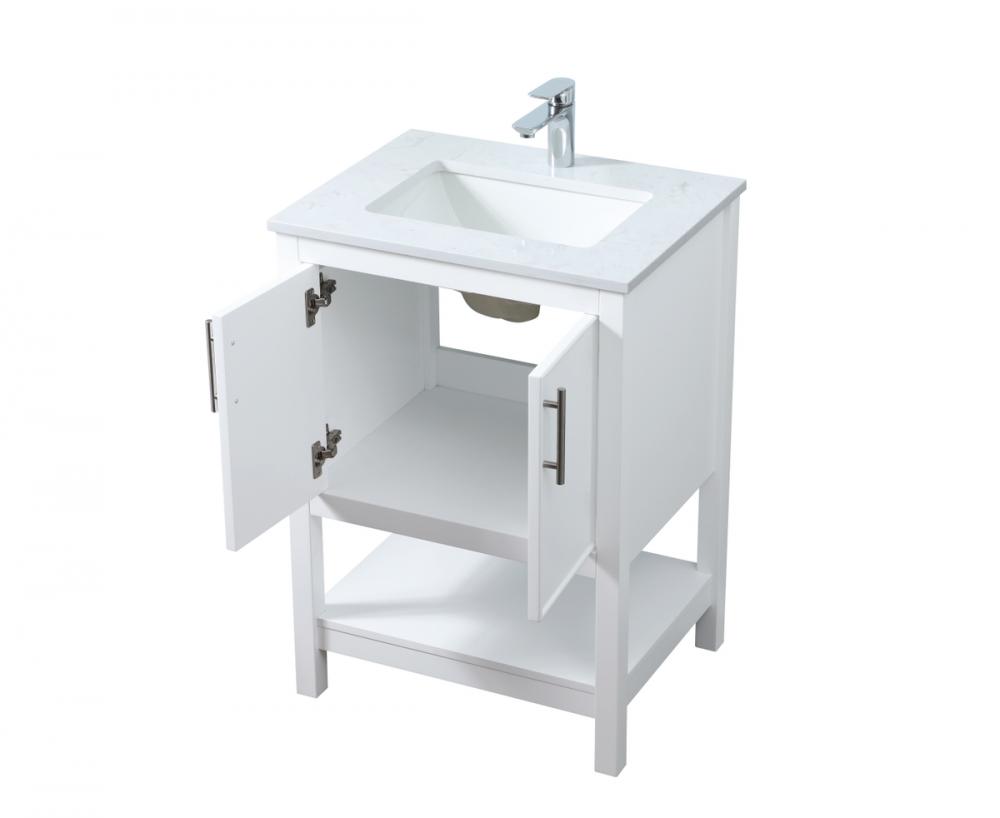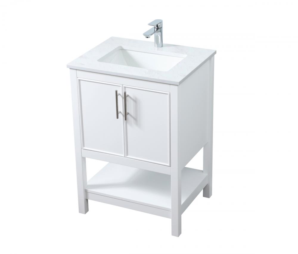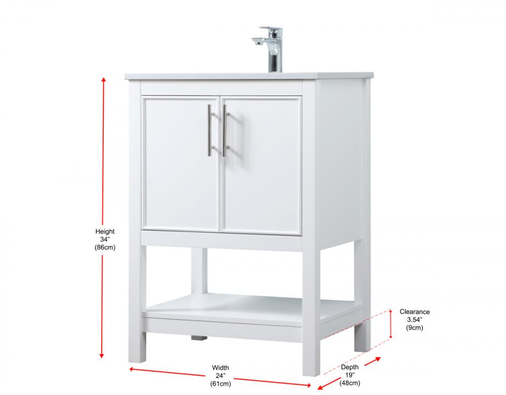 Experience the epitome of modern elegance with our meticulously crafted 24-inch vanity. Boasting a chic straight edge cut and an engineered marble top, this design features one functional cabinet with two soft-close doors, ensuring seamless and stylish access to ample storage. The vanity is complemented by a sophisticated undermount porcelain sink, merging style with practicality for an elevated bathroom experience. Adorned with two sleek pulls and featuring a lower open shelf, it seamlessly combines contemporary aesthetics with functional design. Additionally, the single pre-drilled hole allows for easy faucet personalization, adding a final touch of elegance to your unique bathroom. Redefine your space with this versatile and stylish addition.