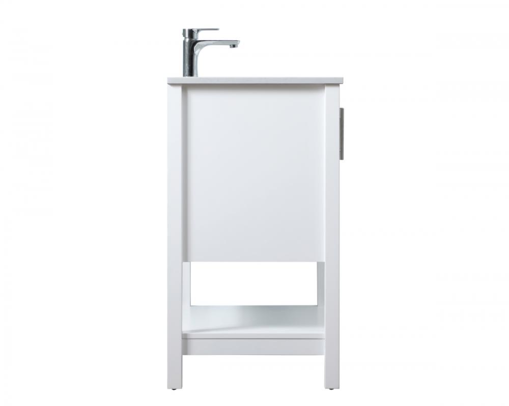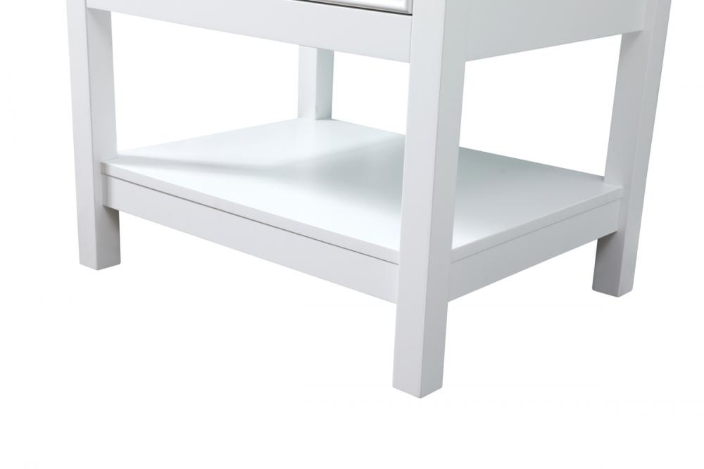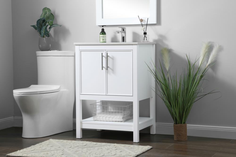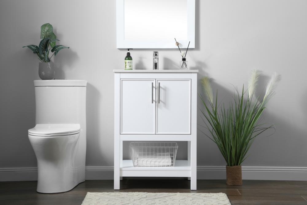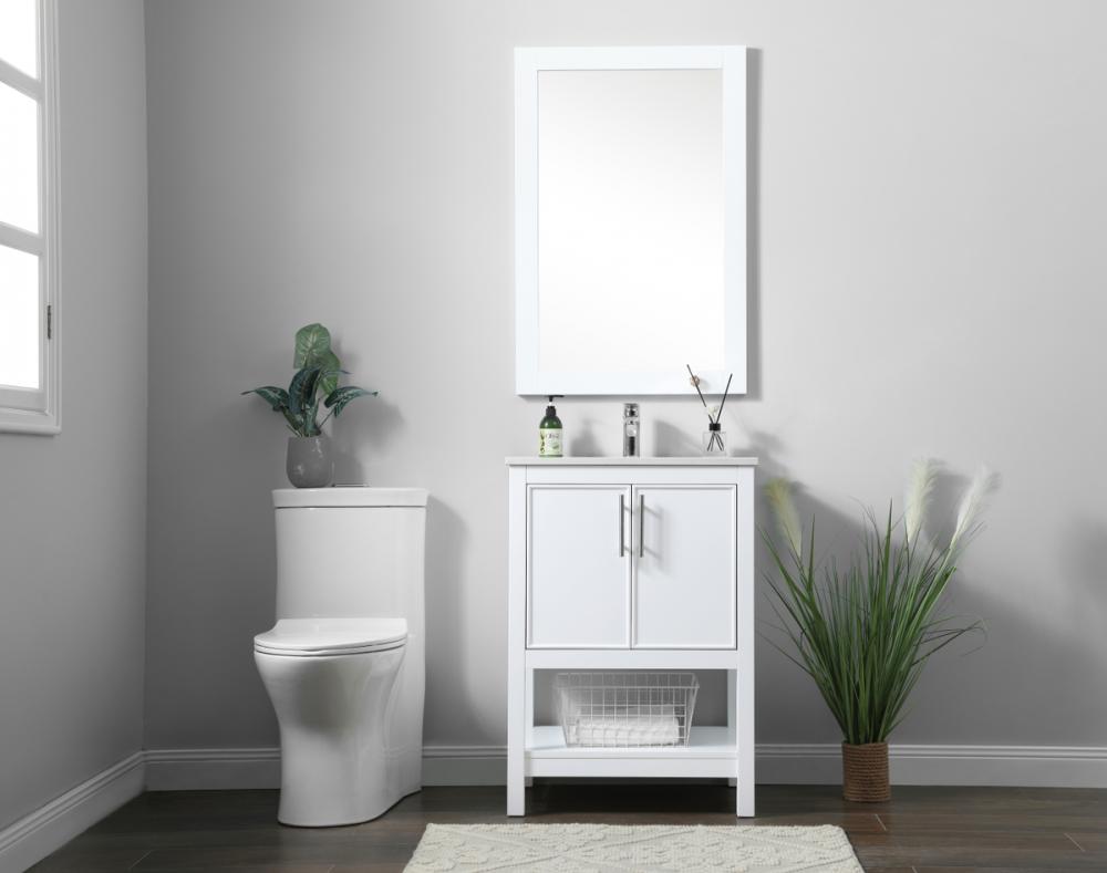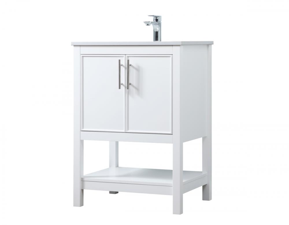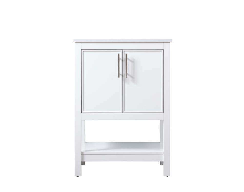 Experience the epitome of modern elegance with our meticulously crafted 24-inch vanity. Boasting a chic straight edge cut and an engineered marble top, this design features one functional cabinet with two soft-close doors, ensuring seamless and stylish access to ample storage. The vanity is complemented by a sophisticated undermount porcelain sink, merging style with practicality for an elevated bathroom experience. Adorned with two sleek pulls and featuring a lower open shelf, it seamlessly combines contemporary aesthetics with functional design. Additionally, the single pre-drilled hole allows for easy faucet personalization, adding a final touch of elegance to your unique bathroom. Redefine your space with this versatile and stylish addition.