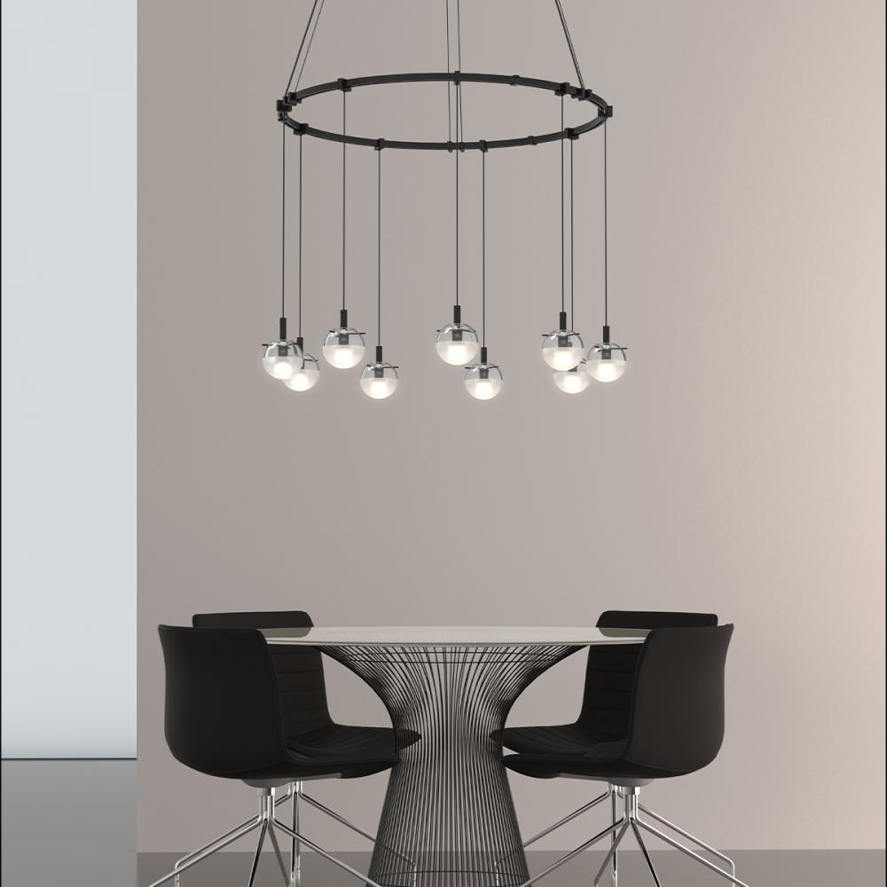 Dropped from a single round cord, the lightness of air is captured within the thin glass forms that surround an omnidirectional lensed LED light source. Available in two fixed lengths of 9" and 18", the cord can be snapped in place into a whimsical loop to further adjust to the desired height.