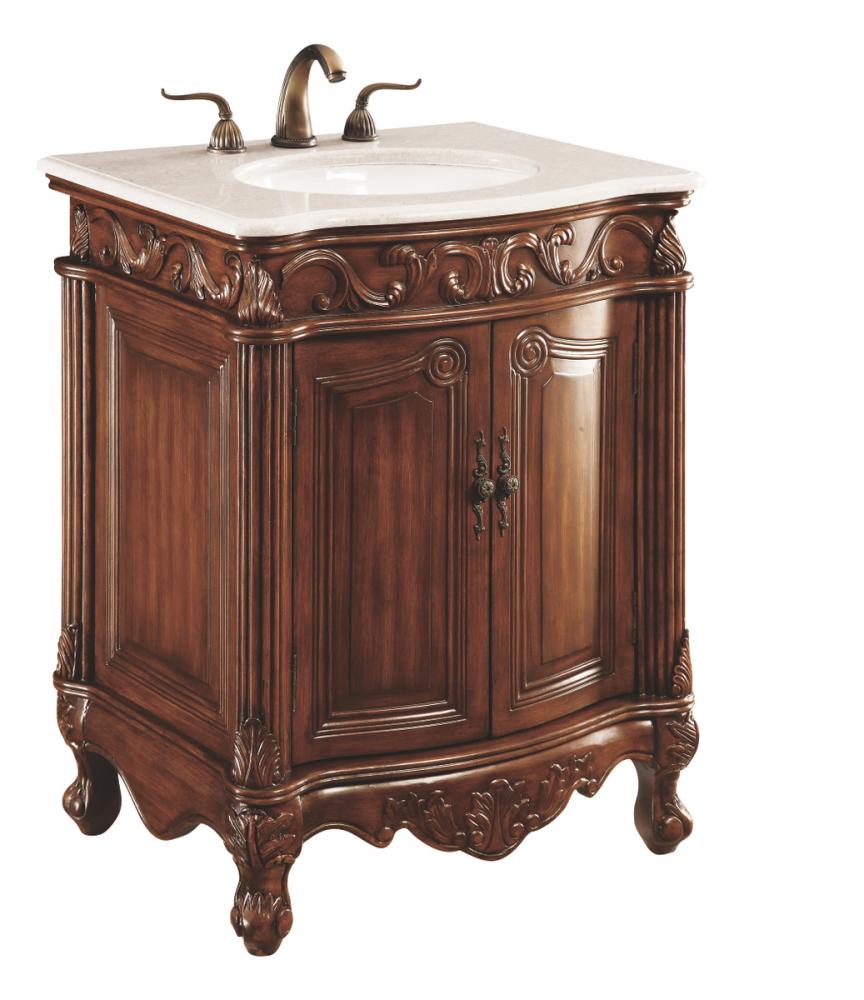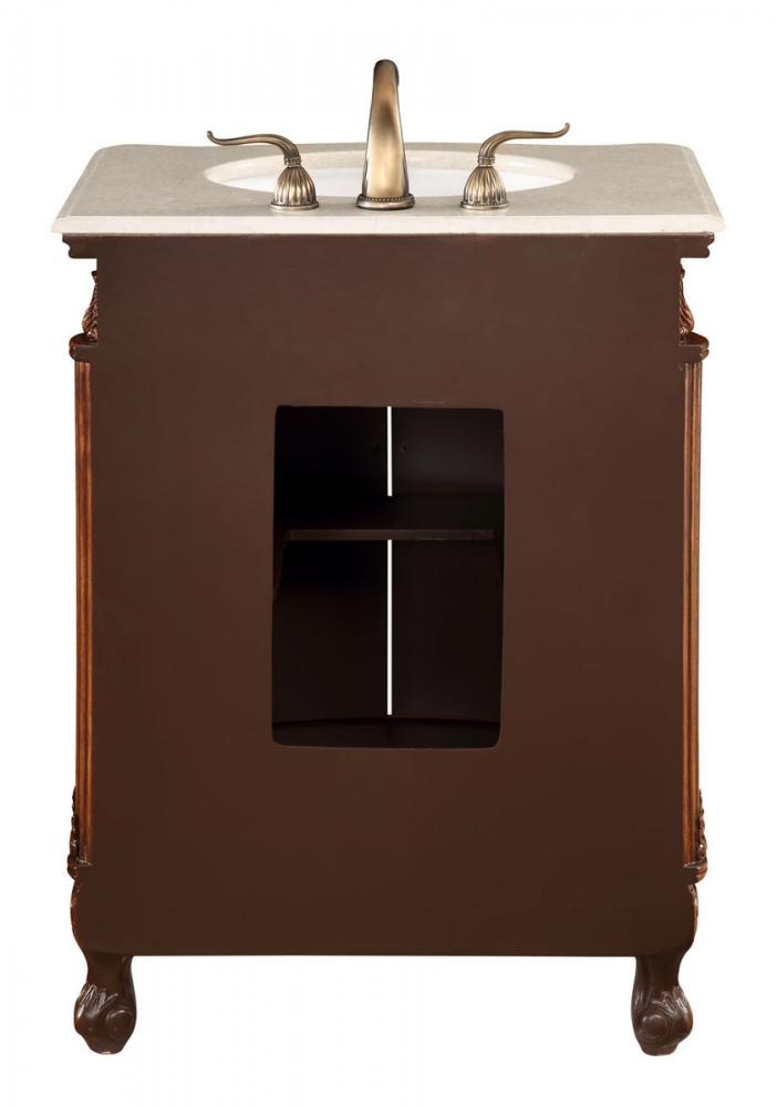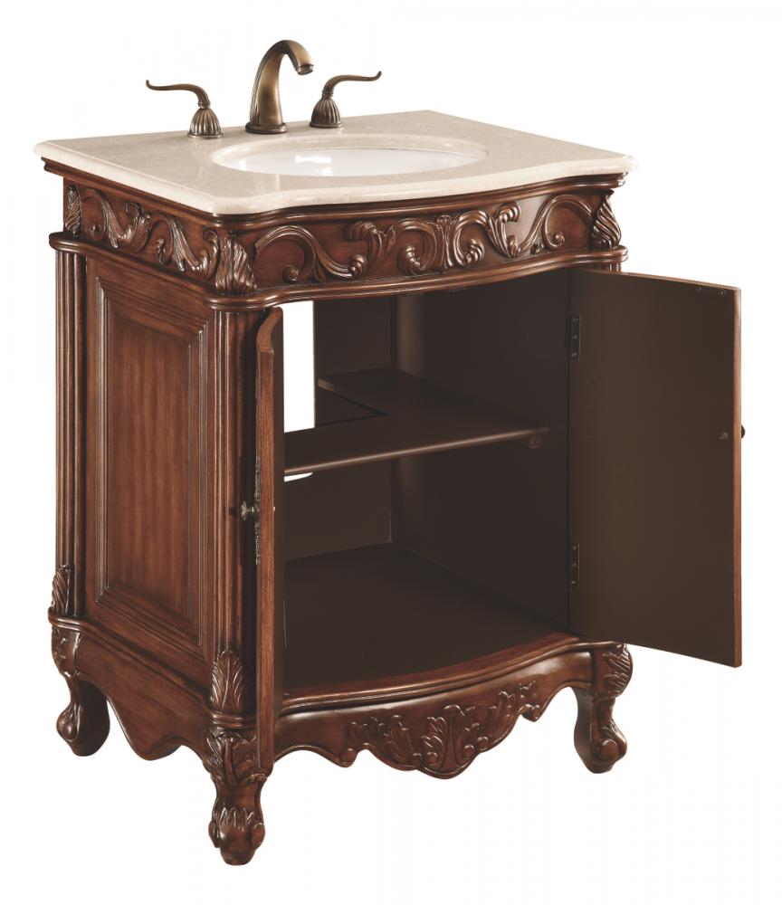 Measurements: W27” x D21” x H36” · Authentic cream marble countertop · Pre-drilled faucet holes, 8” spread · white porcelain under mount sink · Antique bronze finish door knobs · 2 doors, 1 shelf inside ·