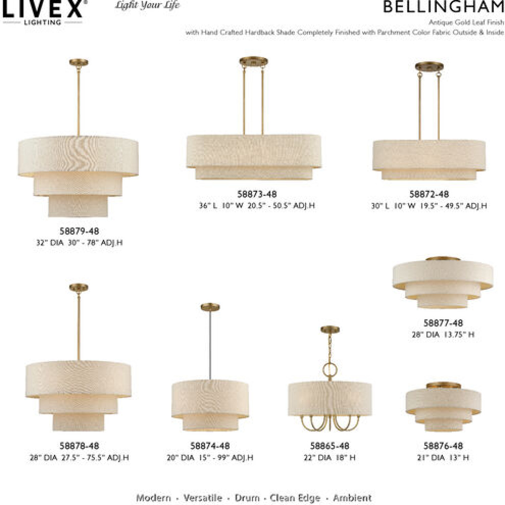 If you love the minimalist, natural aesthetic of mid-century modern design, you’ll adore the organic colors and the phenomenal illumination of the timeless Bellingham lighting collection. Stacked in double- and triple-tiered “wedding cake” style, the handcrafted hardback drum shades are completely finished with a soothing parchment color fabric, radiating warm, earthy ambient lighting. This versatile collection features an array of linear and pendant chandeliers, semi-flush mounts, ADA wall sconces and even a delightful little swing-arm wall lamp.