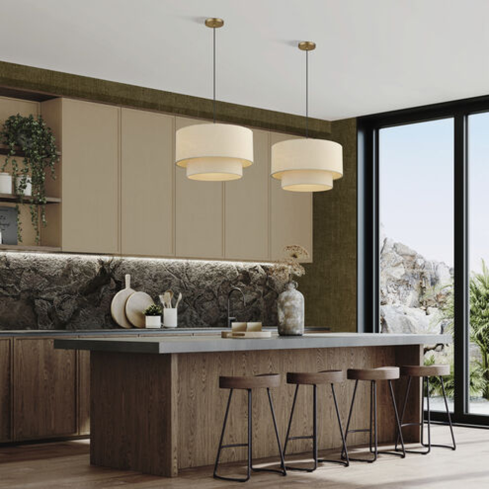 If you love the minimalist, natural aesthetic of mid-century modern design, you’ll adore the organic colors and the phenomenal illumination of the timeless Bellingham lighting collection. Stacked in double- and triple-tiered “wedding cake” style, the handcrafted hardback drum shades are completely finished with a soothing parchment color fabric, radiating warm, earthy ambient lighting. This versatile collection features an array of linear and pendant chandeliers, semi-flush mounts, ADA wall sconces and even a delightful little swing-arm wall lamp.