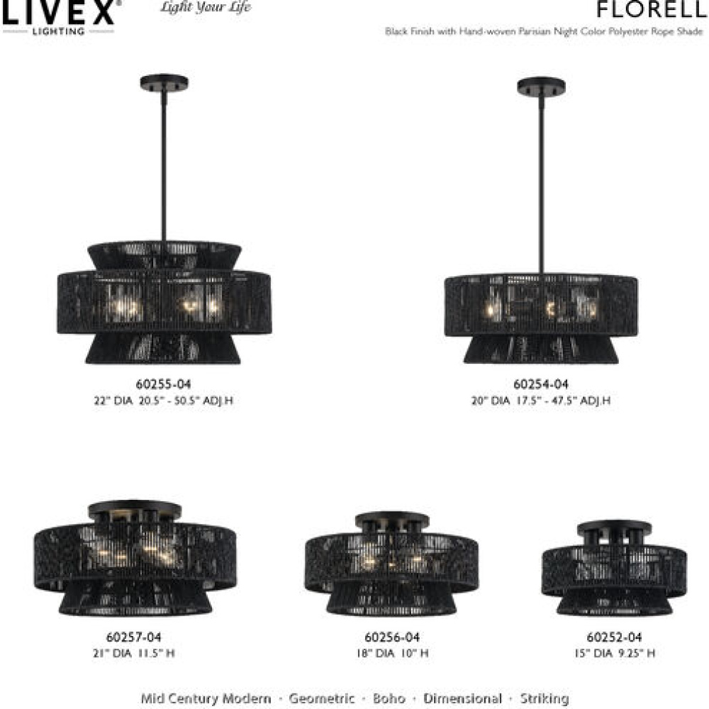 Laidback yet disciplined, the midcentury modern Florell lighting collection celebrates all versions of You: from “beach-haired weekender” to “visionary CEO”. with a vast selection in dramatic colors, this boho-inspired design features minimalist metal frames supporting drum-shaped, tapered and tiered shades – beautifully hand-threaded with sleek (fade- and fray-resistant) polyester rope. Semi-transparent texture allows for creating nuanced shadowing effects.