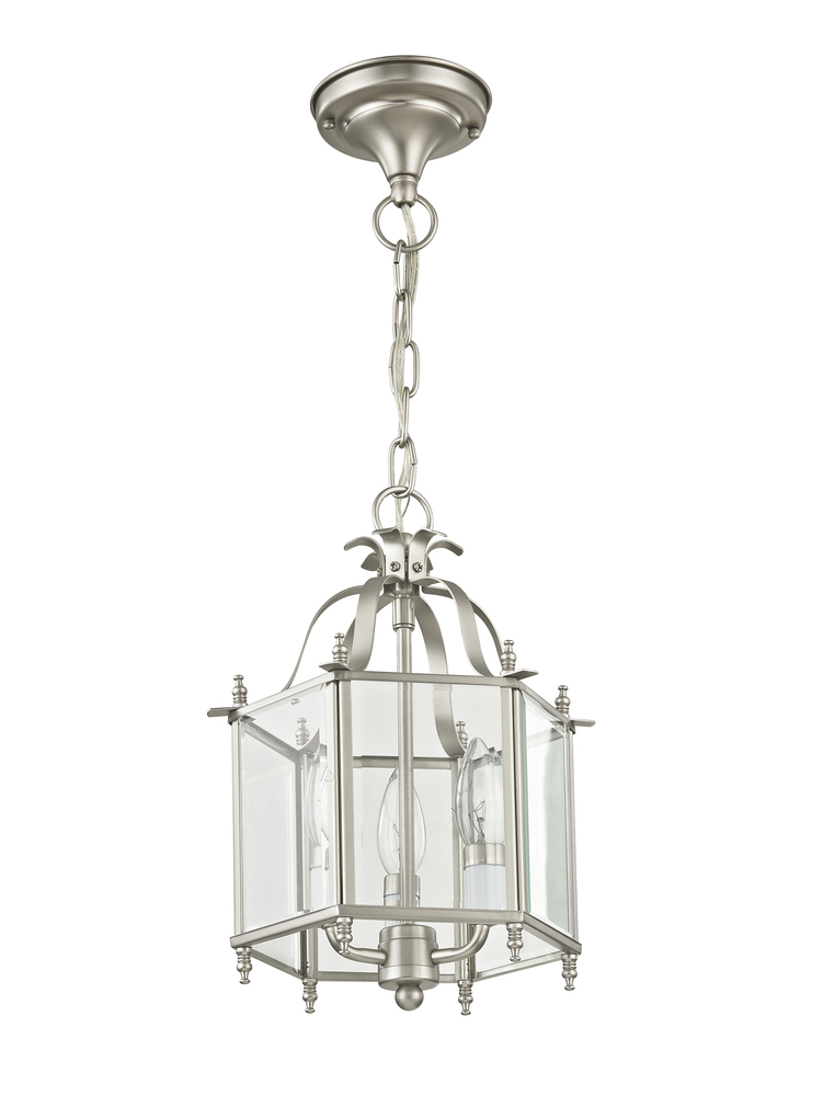 The Livingston Collection Features A Classic Six-Sided Lantern Silhouette. Brushed Nickel Finish With Clear Beveled Glass Gives The Fixture Charming Style And The Candelabra Bulbs Will Fill Your Home With Generous Amounts Of Illumination That Welcomes Your Guests. The Versatile Ixture Can Be Transformed Into Semi-Flush Ceiling Mounts.