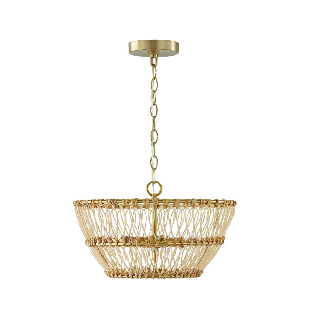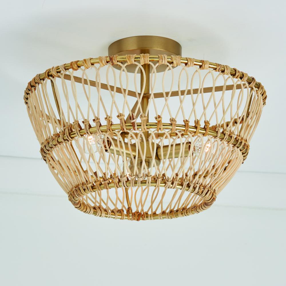 16"W x 9.75"H 3-Light Dual Mount Pendant or Semi-Flush in Matte Brass with Natural Rattan