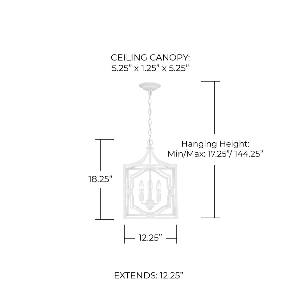DIMENSIONS: Overall: 12.25"W x 18.25"H; Adjustable Hanging Height: 30.5" - 144.25"; Includes 120" Chain; 180" Wire