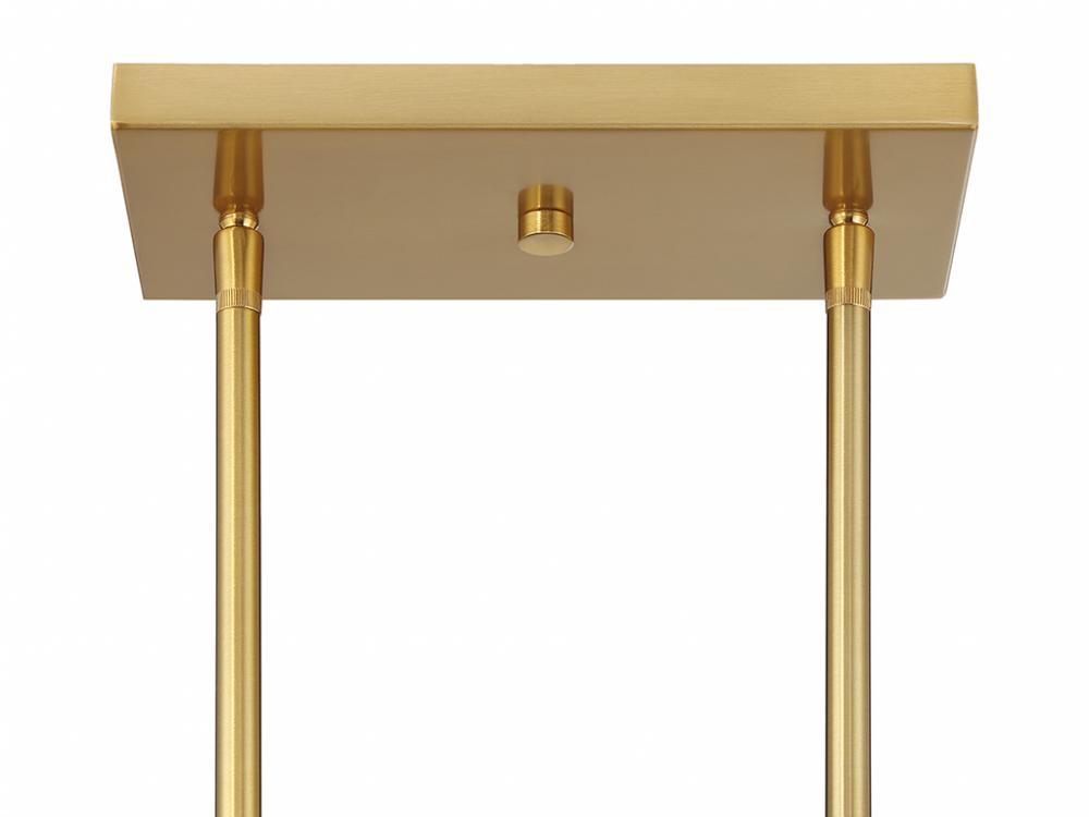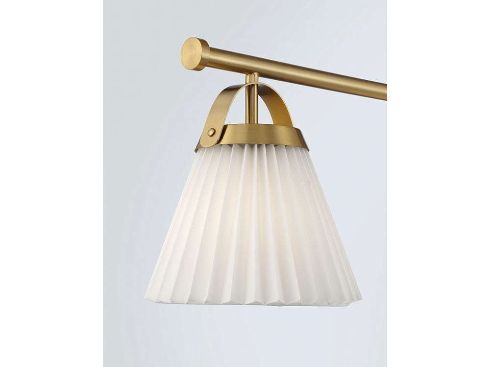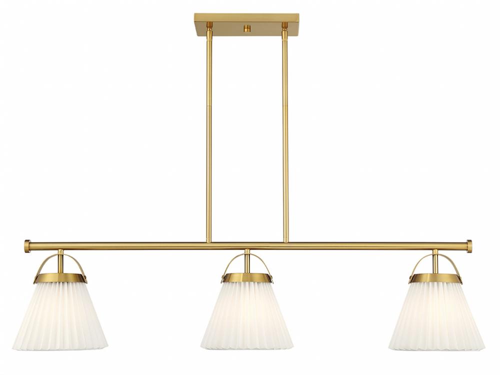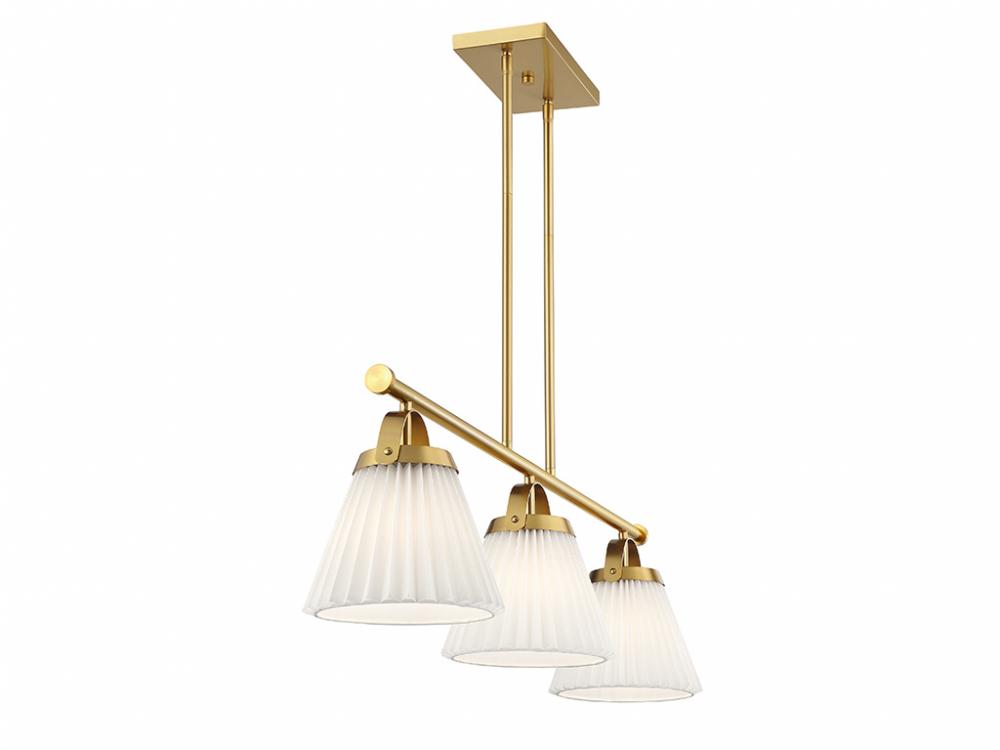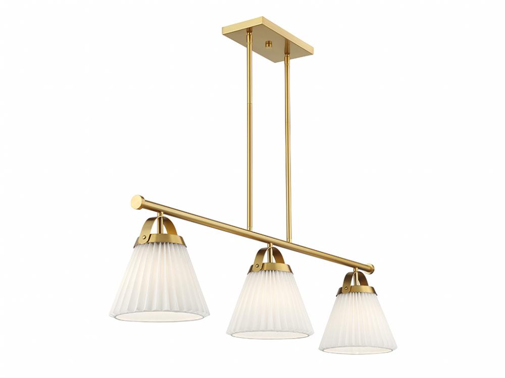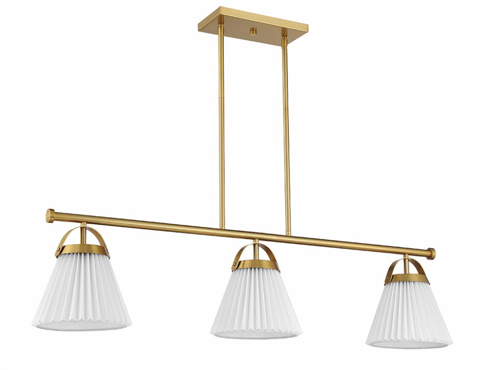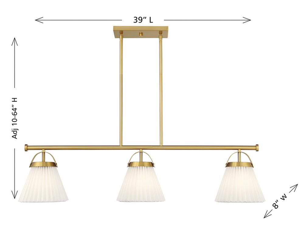 Add a prim and polished lighting look to kitchen islands, dining rooms, billiards rooms or any other stylish spaces with this 3-light linear chandelier. White knife-pleat shades pair nicely with the Natural Brass finish and look sharp whether the lights are on or off. This linear chandelier is 39" in length, 8" in width and has an adjustable height ranging from 10" to 64". It comes with eight 12" downrods and two 6" downrods. Uses 3 standard size bulbs of up to 60 watts per bulb. Bulbs not included.