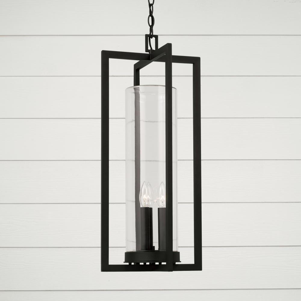 12"W x 27.25"H 3-Light Outdoor Hanging Lantern in Black with Clear Glass Cylinder