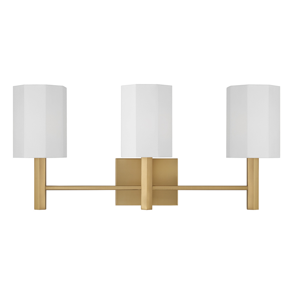 Geometrically inspired, the Adrian 3-Light Vanity brings a structural silhouette with high style. White fabric octagonal shades and faceted candle sleeves create striking dimension, while the Aged Brass finish adds a classic touch.