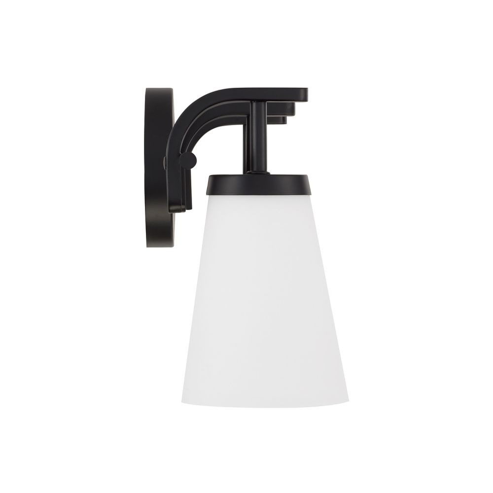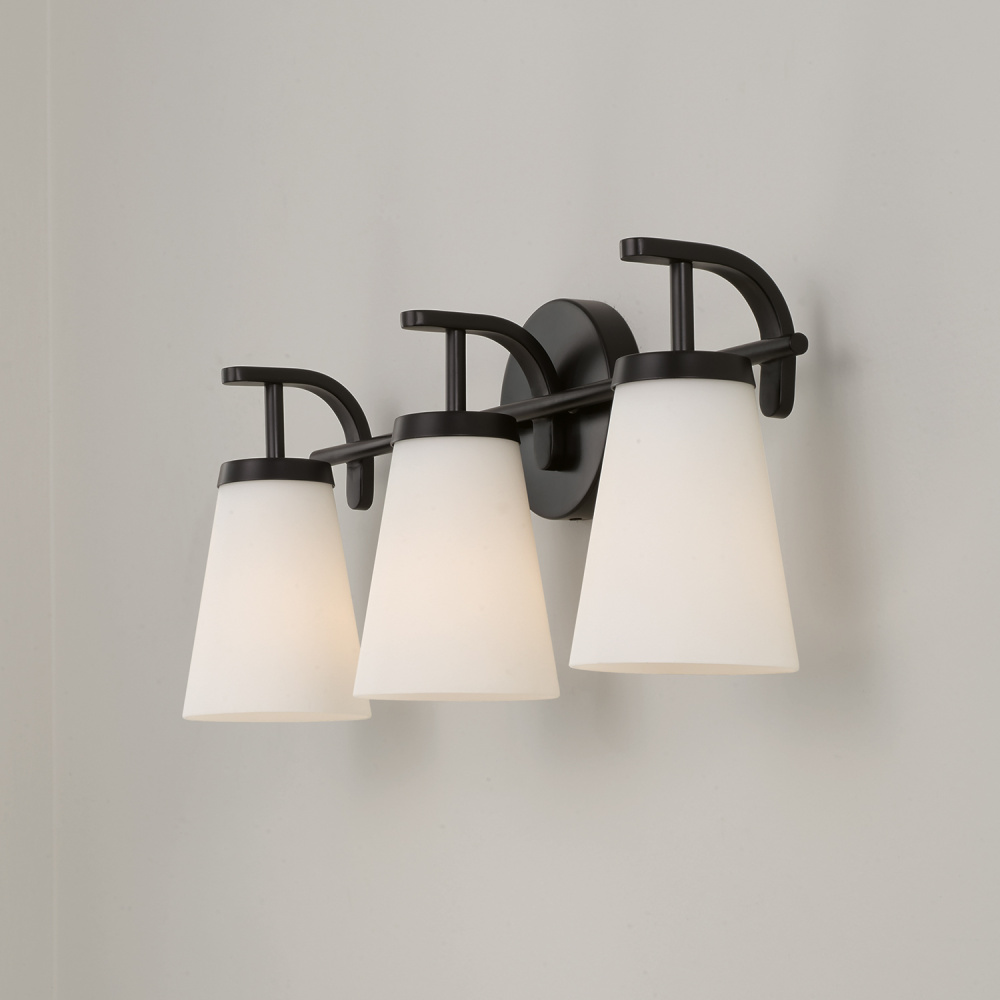 The Drake 3-Light Vanity for HomePlace brings clean and classic style to any space. Paired with sleek, intersecting arms, the tapered Soft White glass shades create an ambient glow, finished in Matte Black for contemporary style.