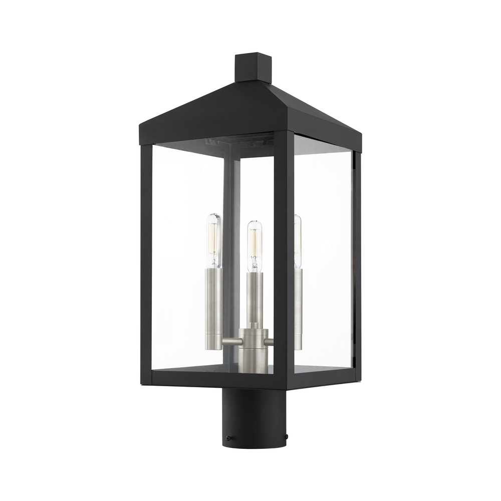 Multi Head Black Outdoor Post Light with Brushed Nickel Accents and Clear Glass