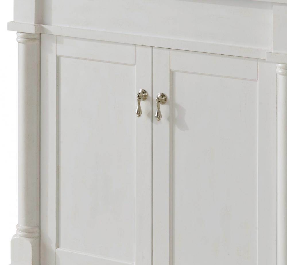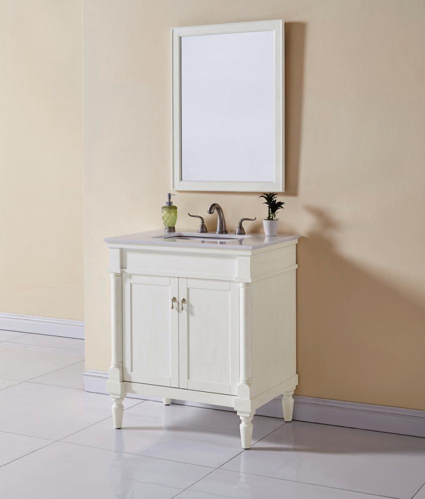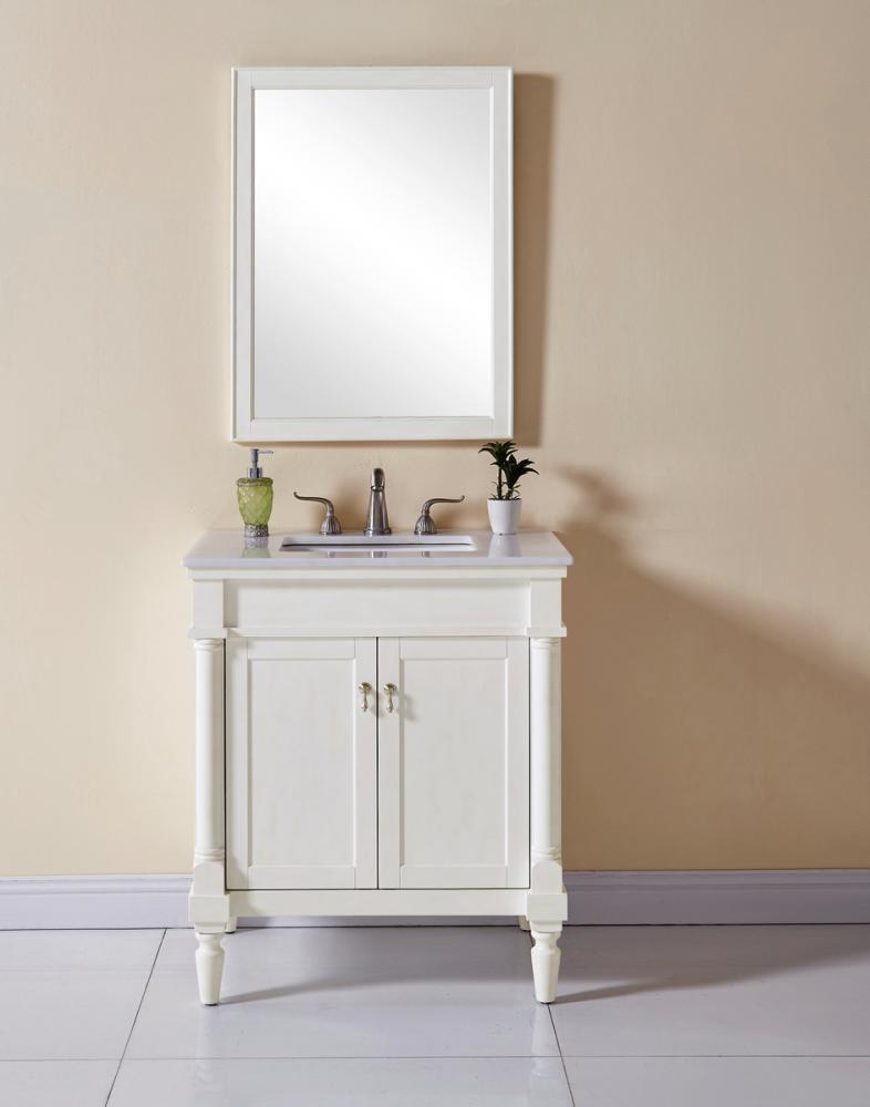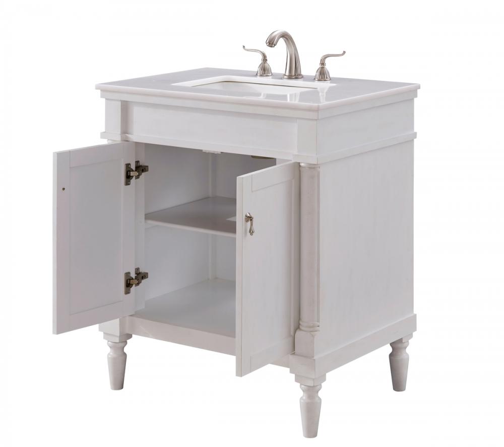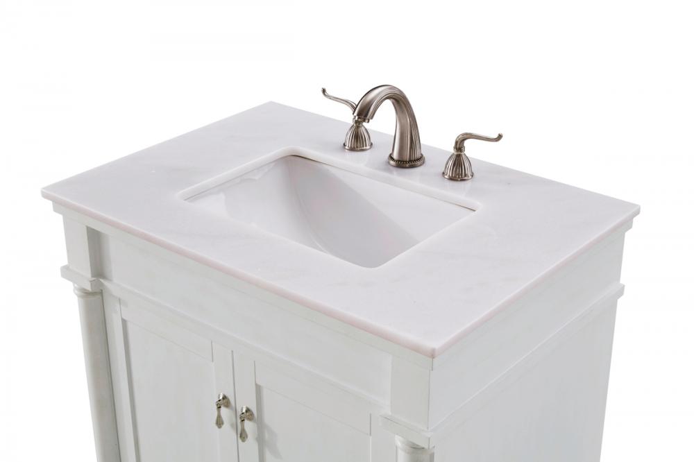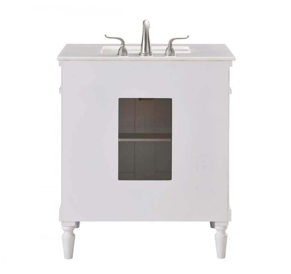 This Traditionally styled, yet fashionably designed vanity can add distinction and grace to your home or office bathroom. Beautifully combining a lustrous natural white marble countertop with a large rectangular white porcelain under mount sink, and a hand painted antique white 2-door cabinet with a shelf inside, brushed steel door pulls, standing on turned, tapering legs. You’ll enjoy its charming allure for many years to come. Measurements: W30” x D21” x H35”