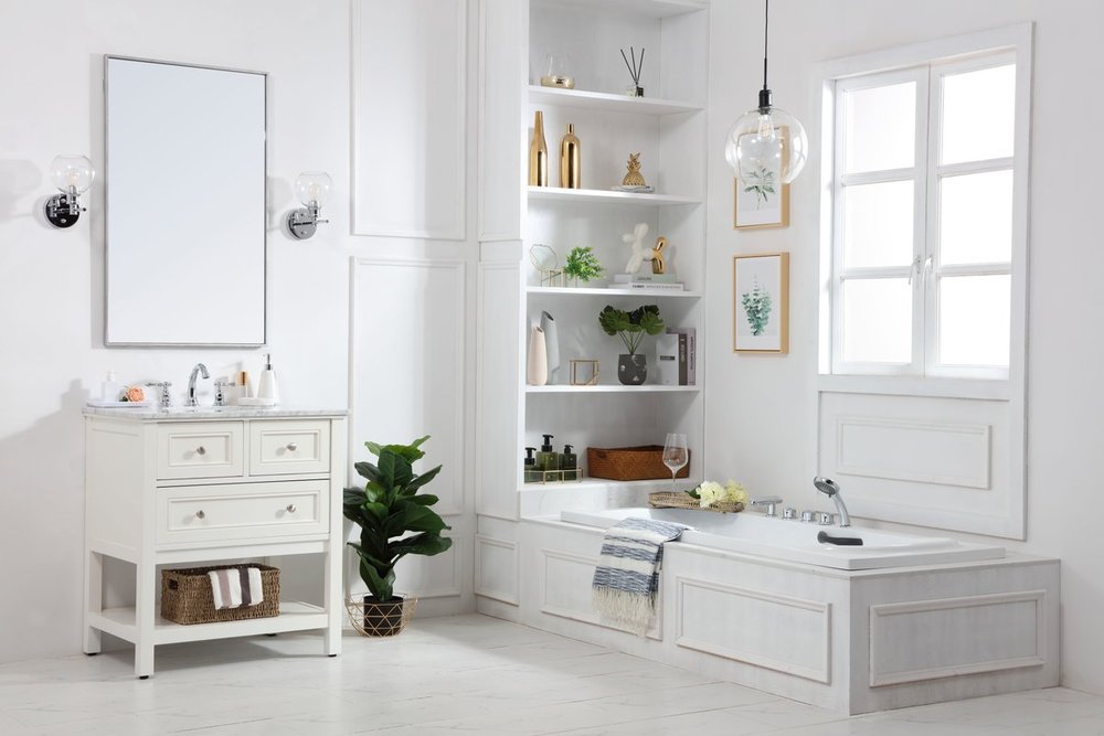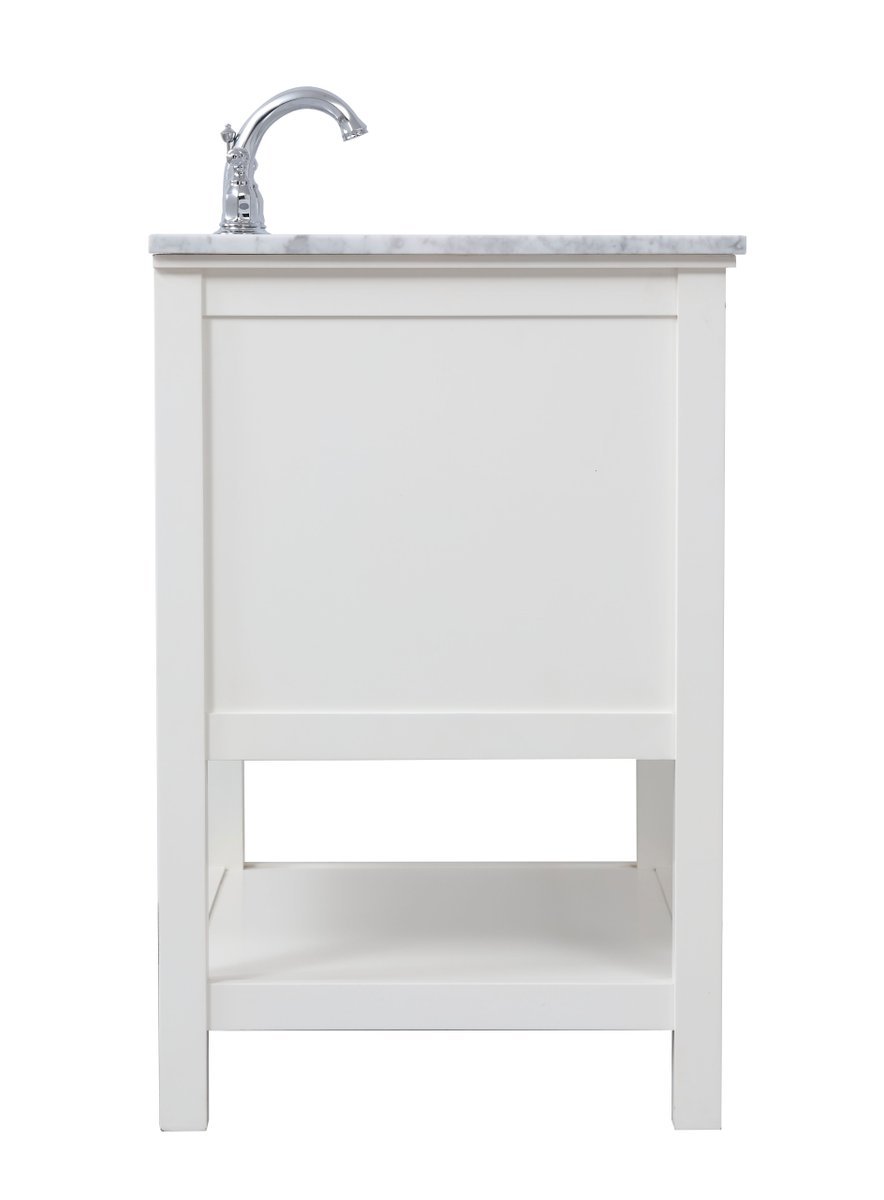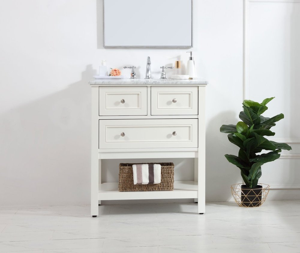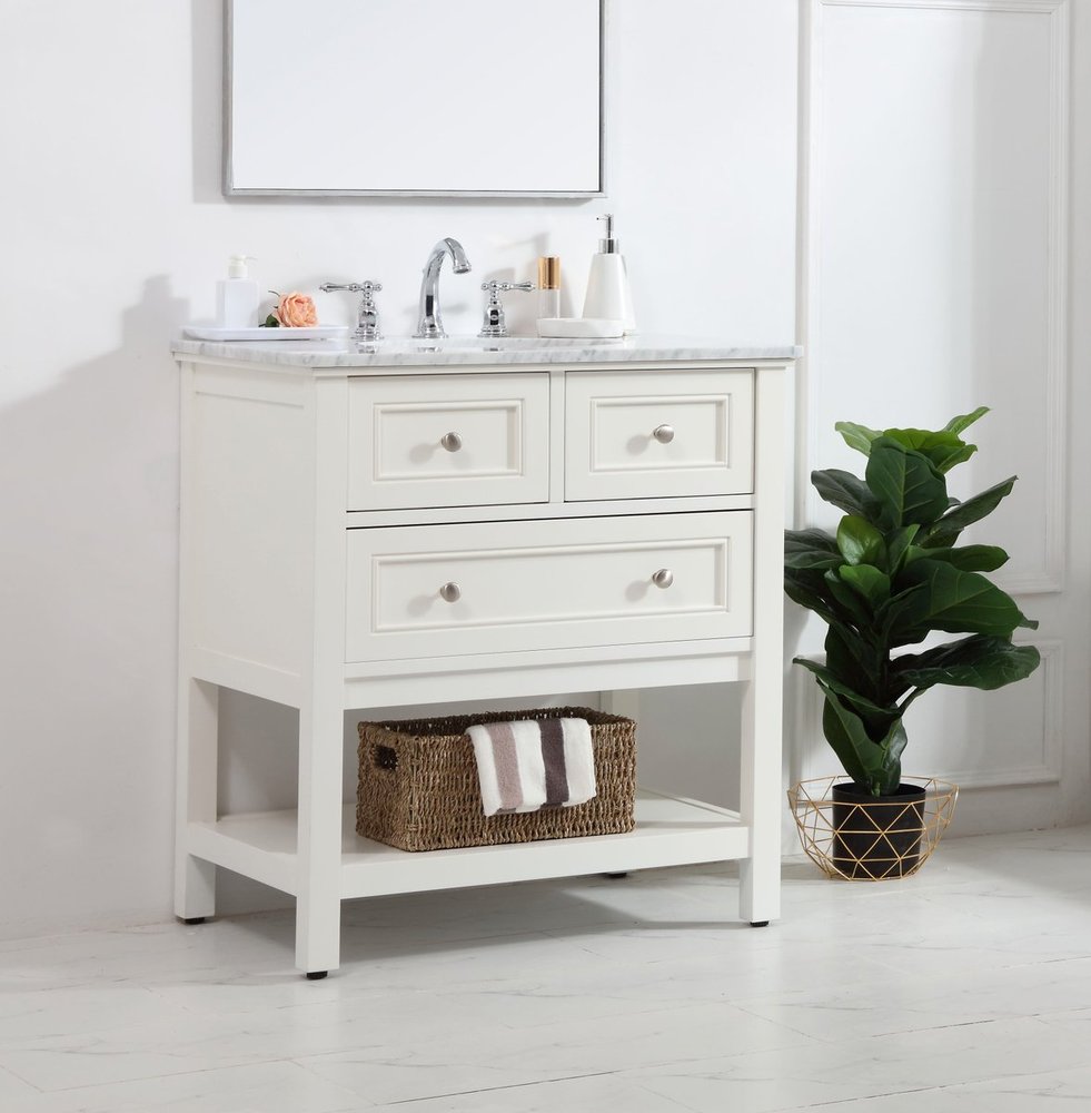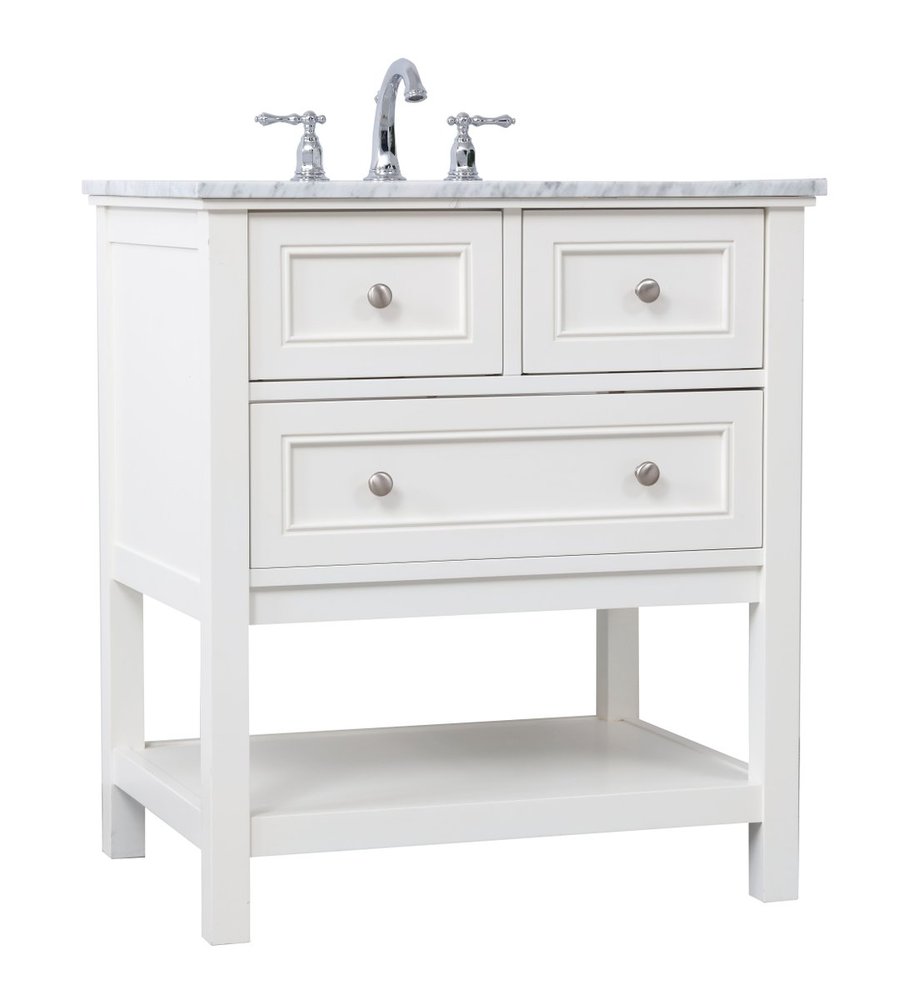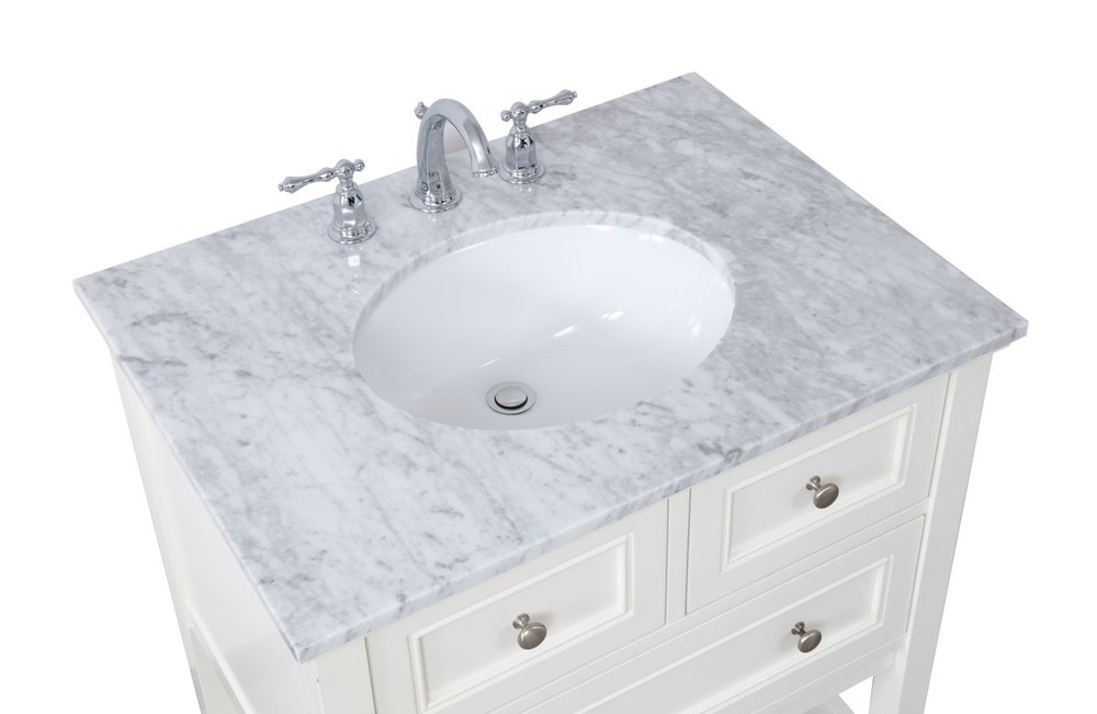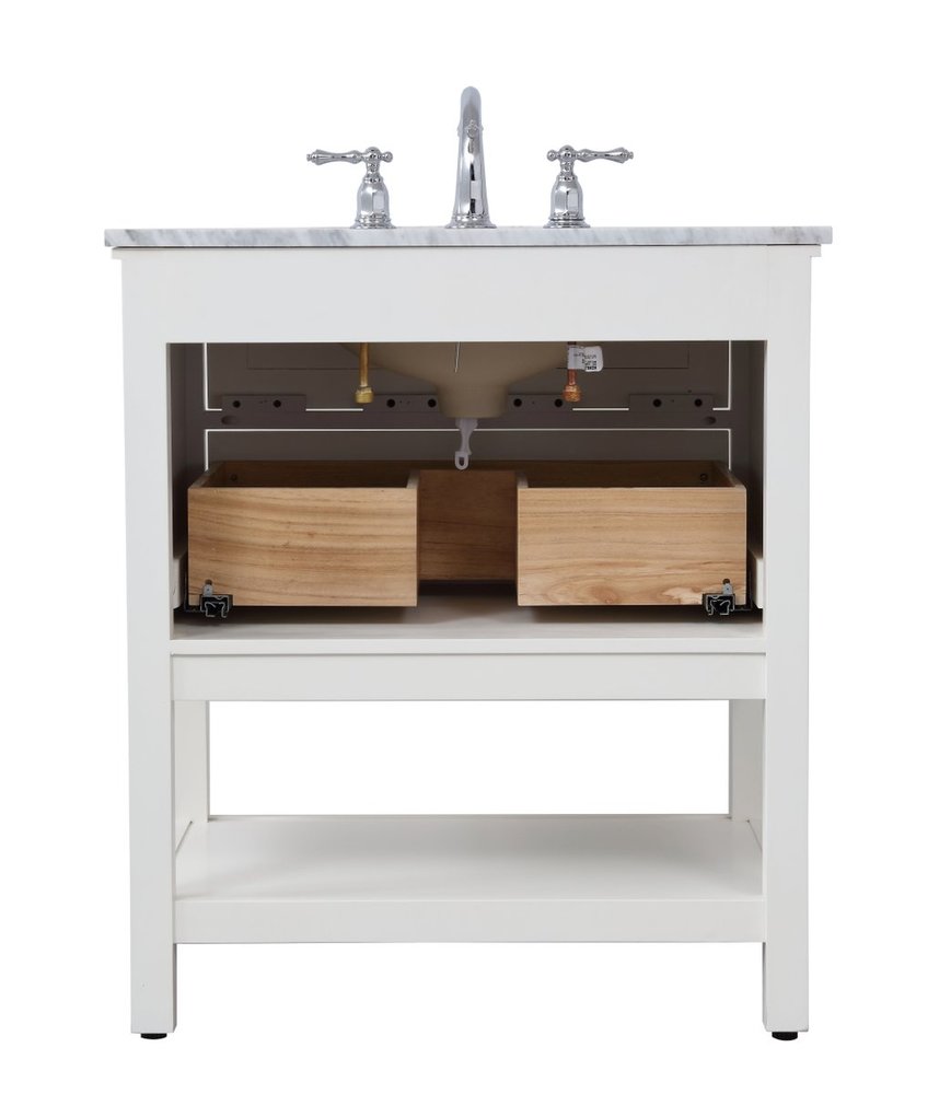 Create a refined and relaxing bath space with this contemporary design vanity, presenting its simplicity and clean straight lines in a minimalist appeal. The 30" white vanity, crafted of solid poplar wood, provides ample storage within its soft-close drawer and open shelf base, accentuated with chrome hardware. Rounding out the design is a luxurious Itallian Carrara white marble with a white porcelain under-mount oval sink.