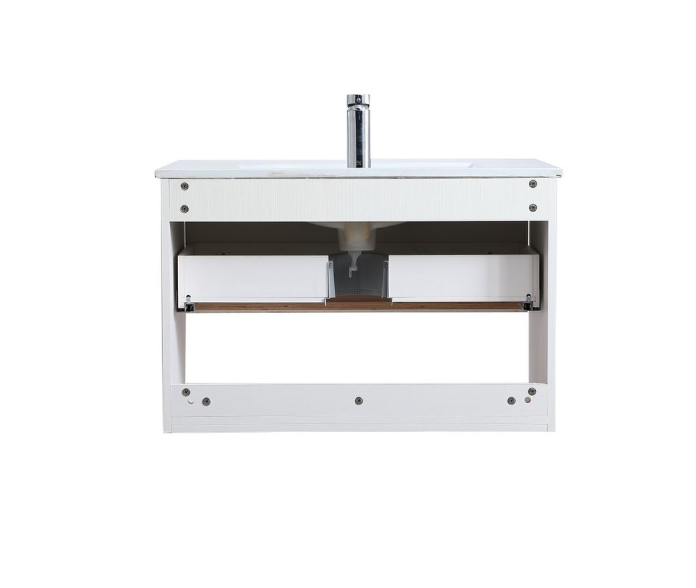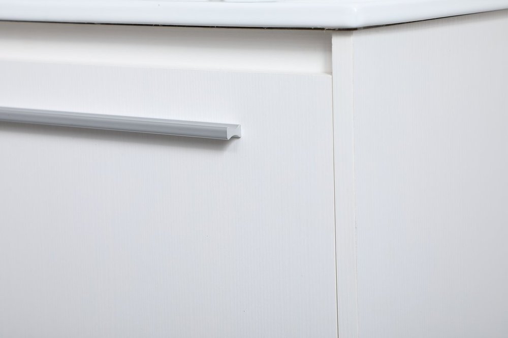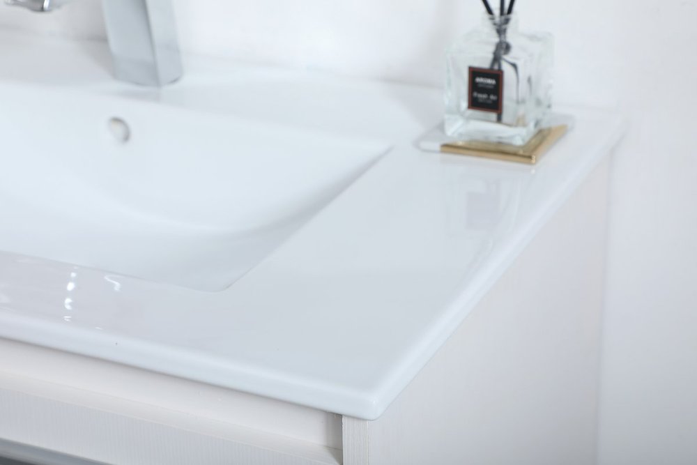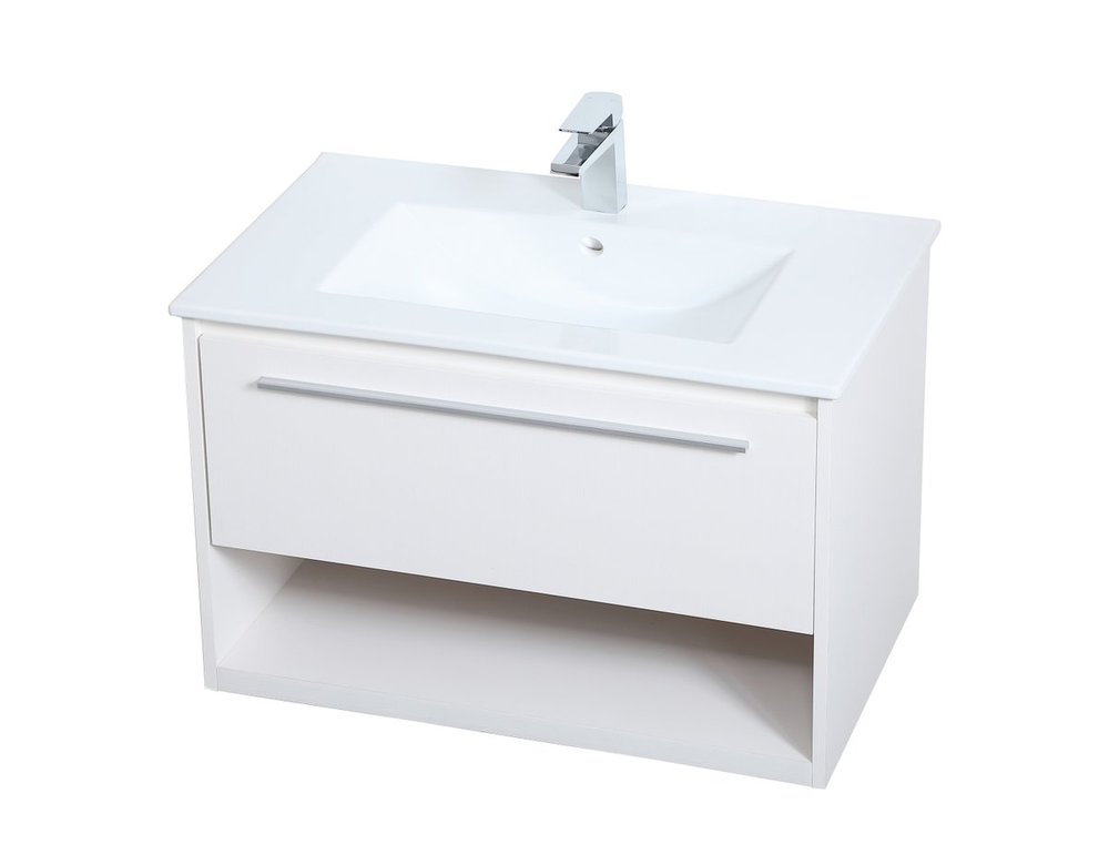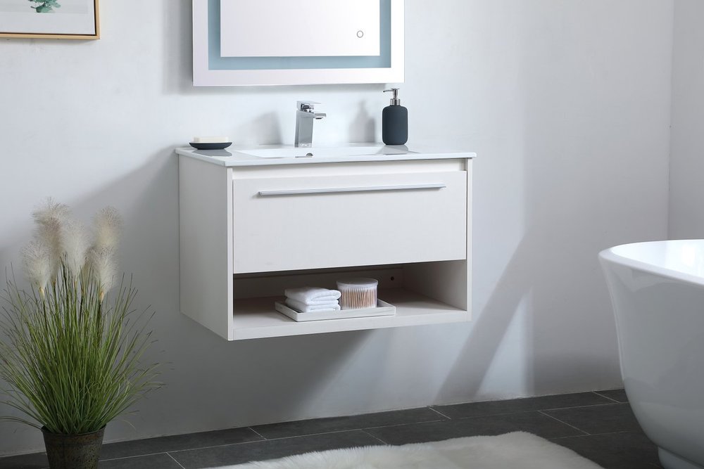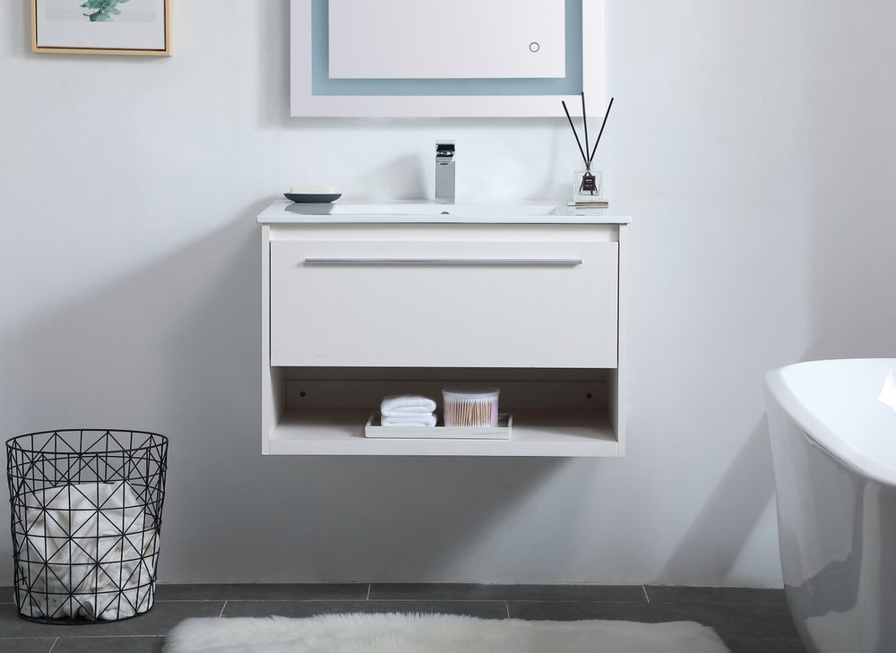 Save space and make your bathroom appear bigger with this 30" floating vanity in a white finish. Its minimal design will have you in awe, while its clean lines will leave your room feeling fresh and uncluttered. The Single u-drawer pulls out for storage while the open space below allows you to place extra towels or various other essentials.