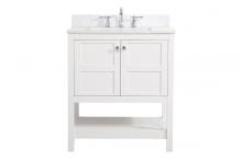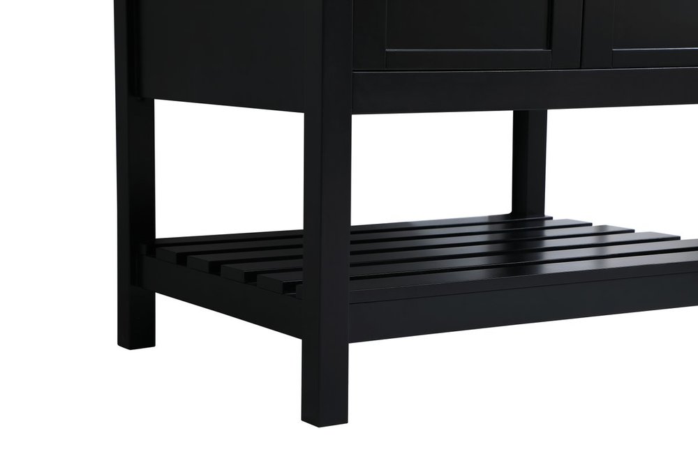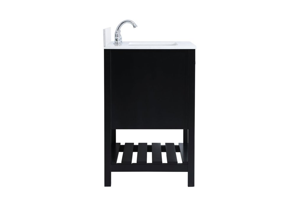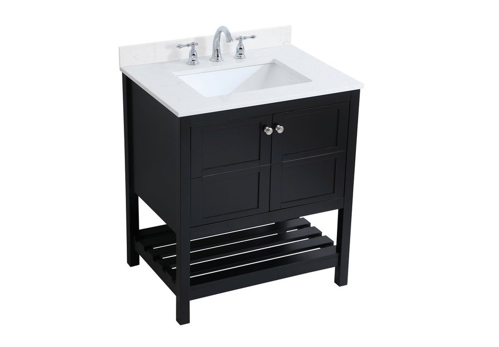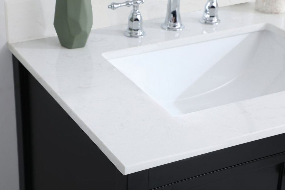 The subtle beauty of the Theo collection 30" vanity in a black finish exudes comfortable luxury. Its modern, yet traditional beauty will surely dress up your bathroom or powder room without any fuss. The white stone countertop and porcelain undermount sink shows quiet opulence, and the legs support upright without fail. Brushed Nickel hardware complements the trendy black finish, with pulls adorning the two cabinet doors, showcasing ample storage space within. Slated shelf allows for additional space to organize your towels. Whether this vanity is in your bathroom or for guests, its presence will surely elevate the aesthetics of your room. Comes with a matching backsplash to complete the look and protects your wall.