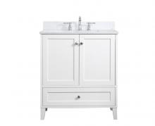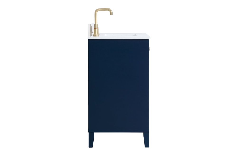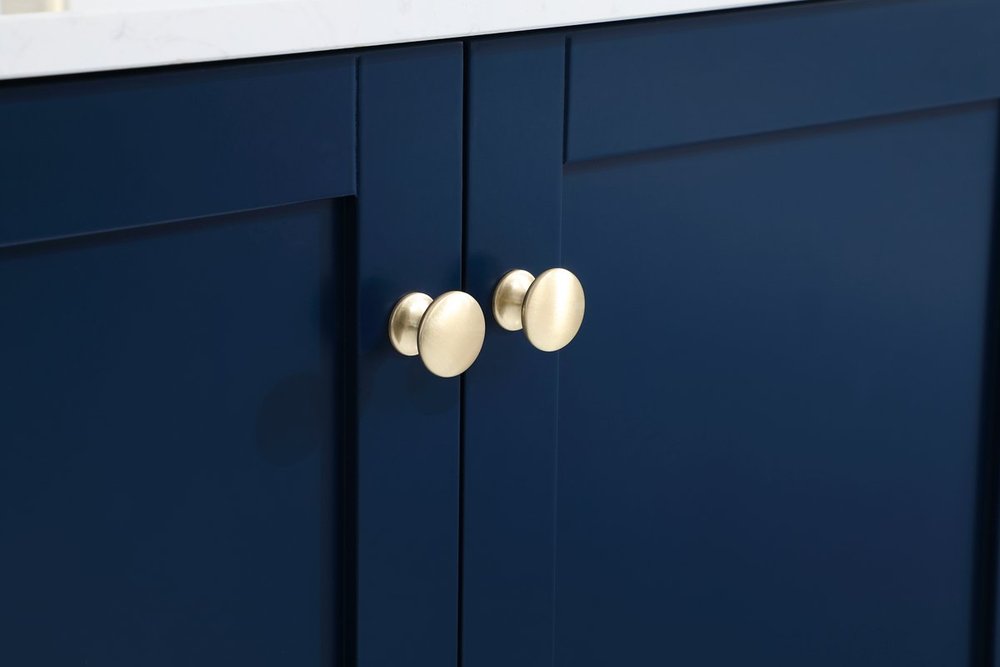While unassuming, this 30" vanity in a Blue finish sure knows how to redefine luxury. The sleek gold knobs adorn the two cabinet doors and base drawer which allows you to store your bathroom toiletries and necessities. Standing strong on oblique legs and dressed with a calacatta engineered marble countertop, this vanity will surely create beauty and casual elegance in your bathroom or powder room. Comes with a matching backsplash to complete the look and protects your wall.