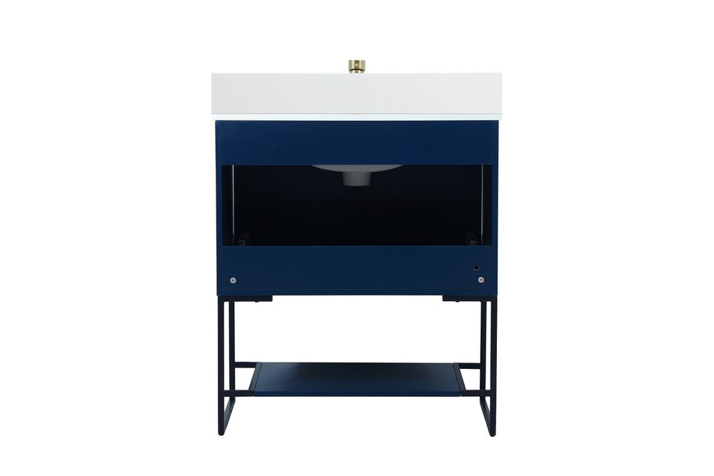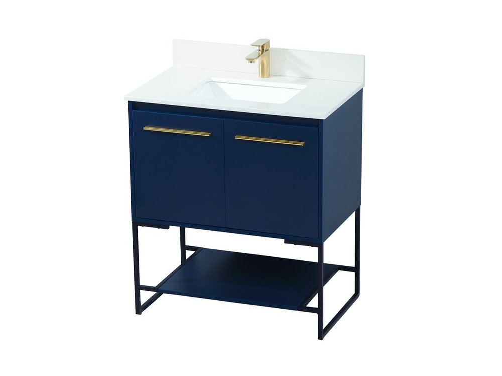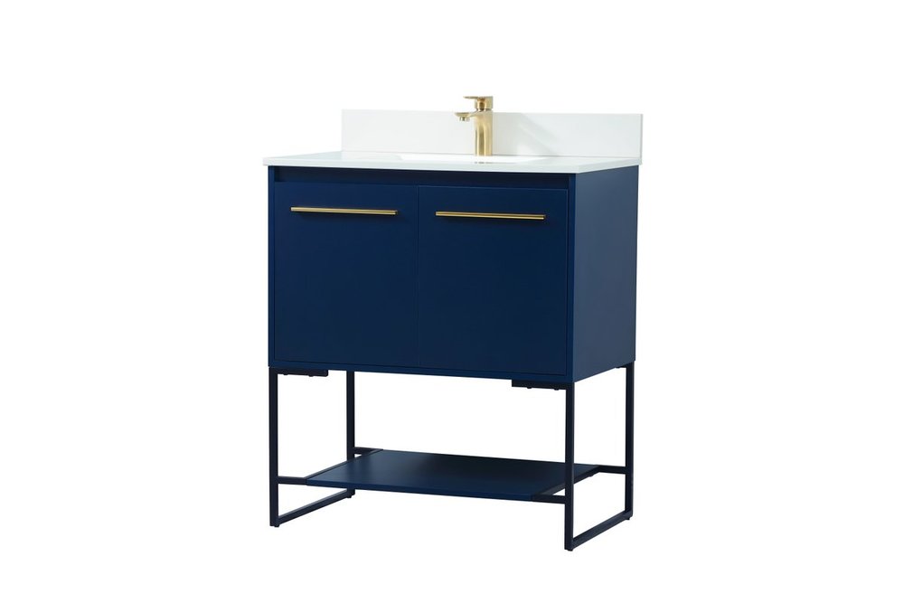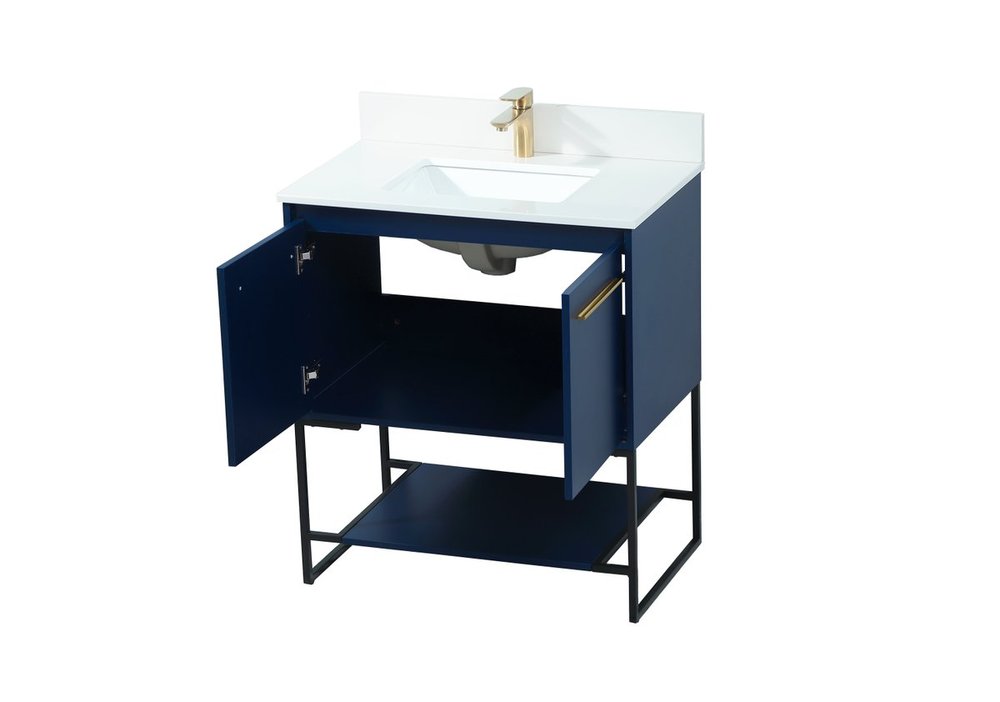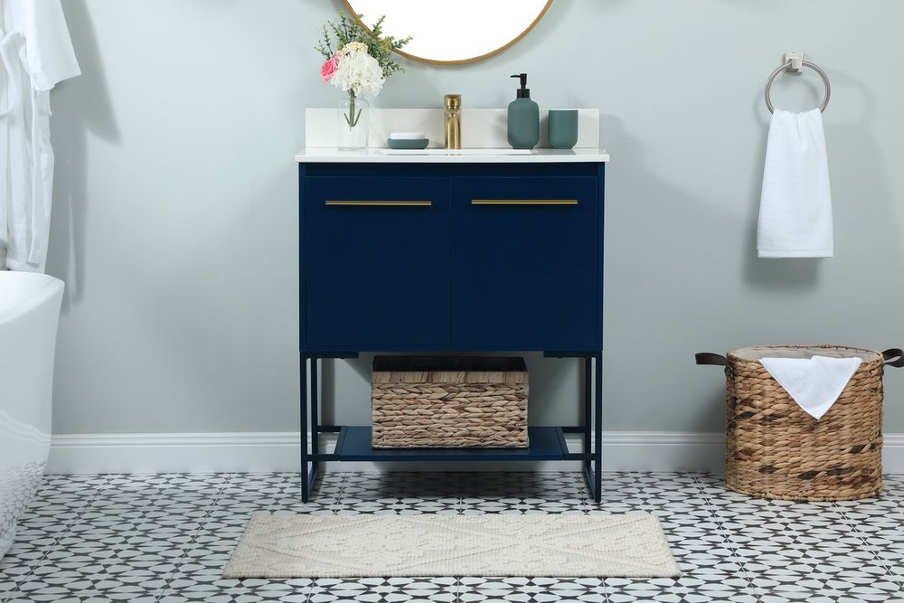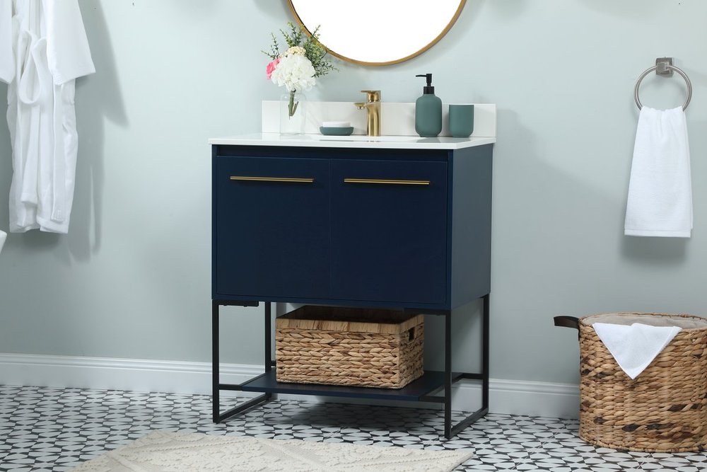 Live in modern comfort with this 30" blue finish vanity. Dressed in a blue and sleek gold metal hardware, its contemporary style will have your bathroom or powder room elevated in industrial sophistication. The open shelf at the base and two doors reveal ample storage space for your bathroom essentials and miscellany. Clean lines create its own visual interest, adding trendy looks to your already chic room. Comes with a matching backsplash to complete the look and protects your wall.