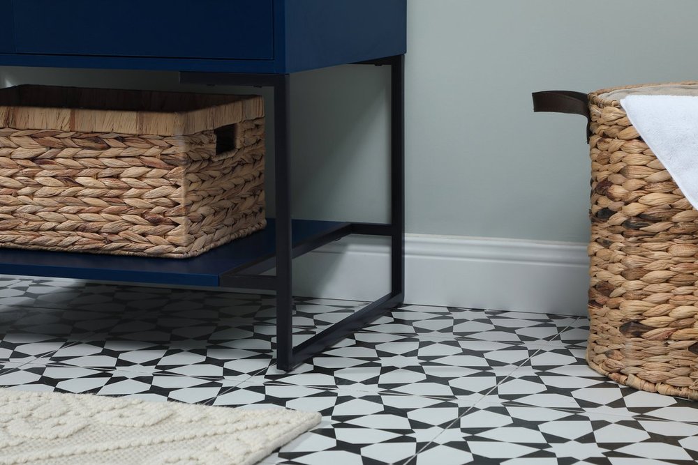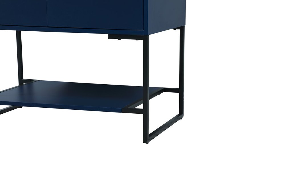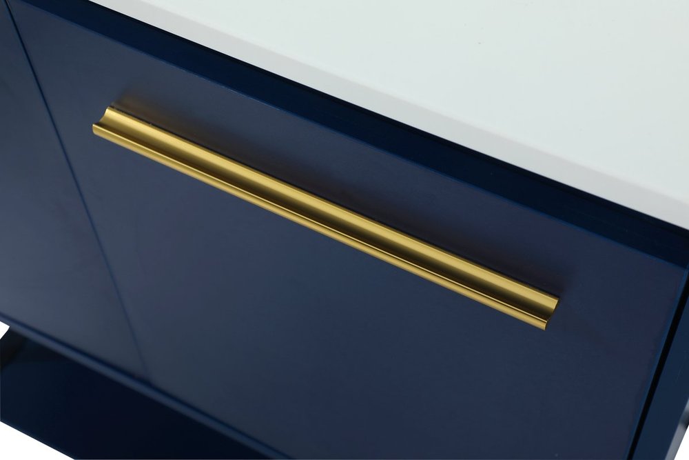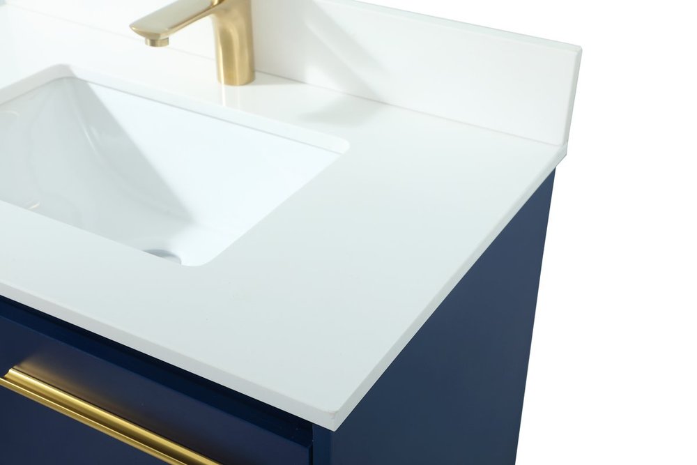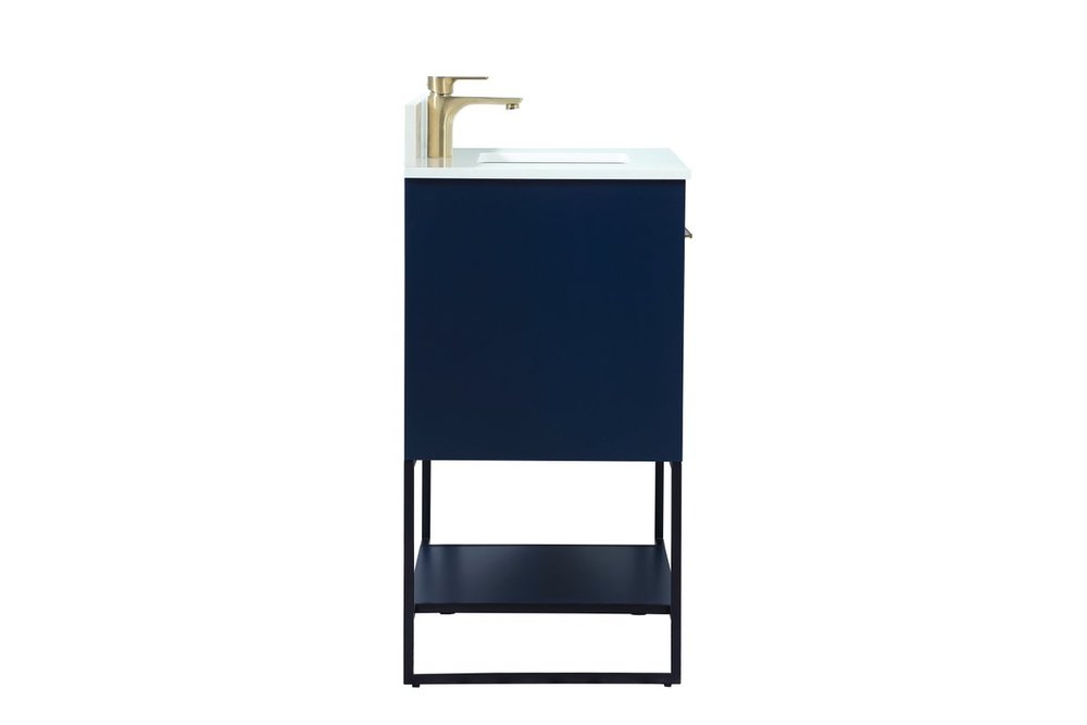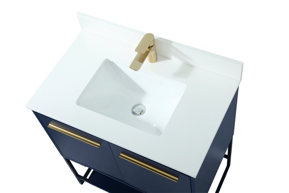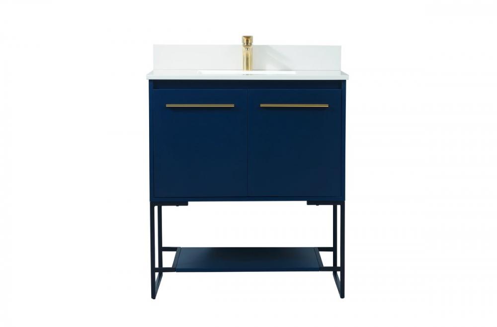 Live in modern comfort with this 30" blue finish vanity. Dressed in a blue and sleek gold metal hardware, its contemporary style will have your bathroom or powder room elevated in industrial sophistication. The open shelf at the base and two doors reveal ample storage space for your bathroom essentials and miscellany. Clean lines create its own visual interest, adding trendy looks to your already chic room. Comes with a matching backsplash to complete the look and protects your wall.