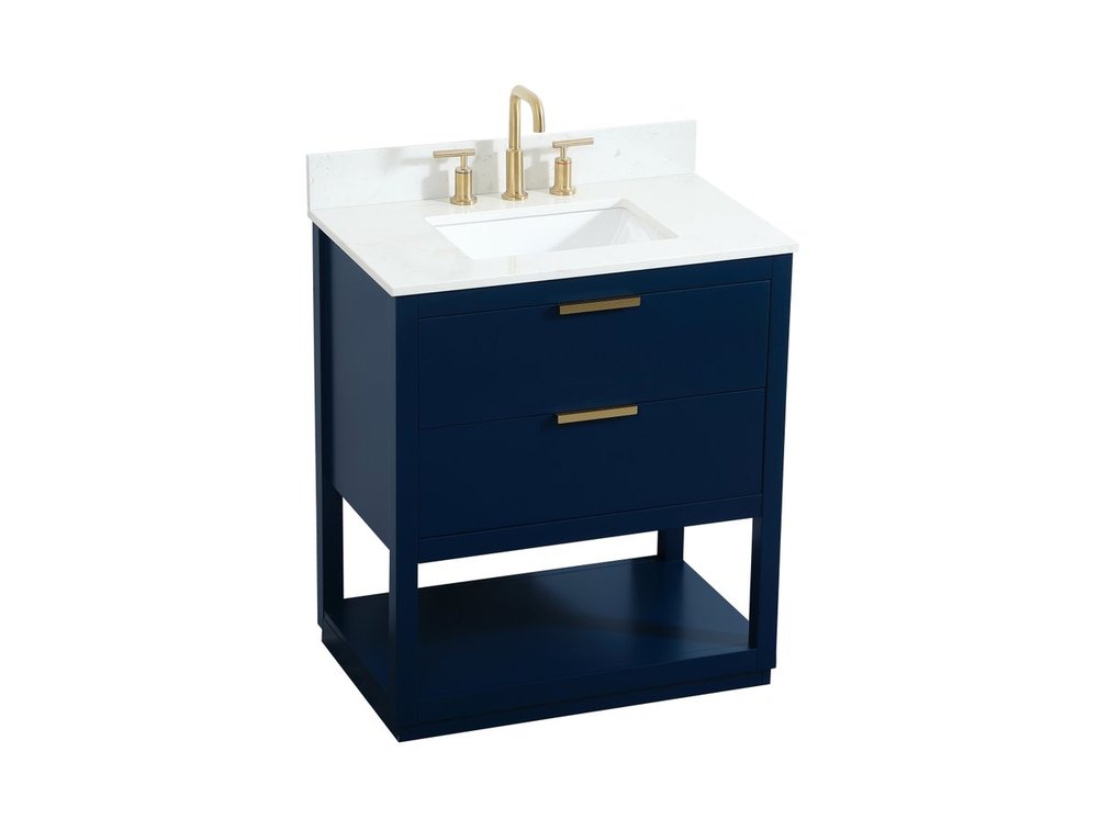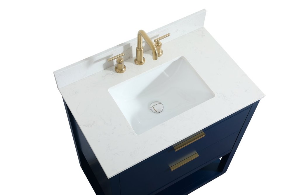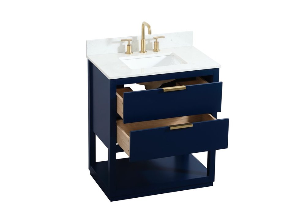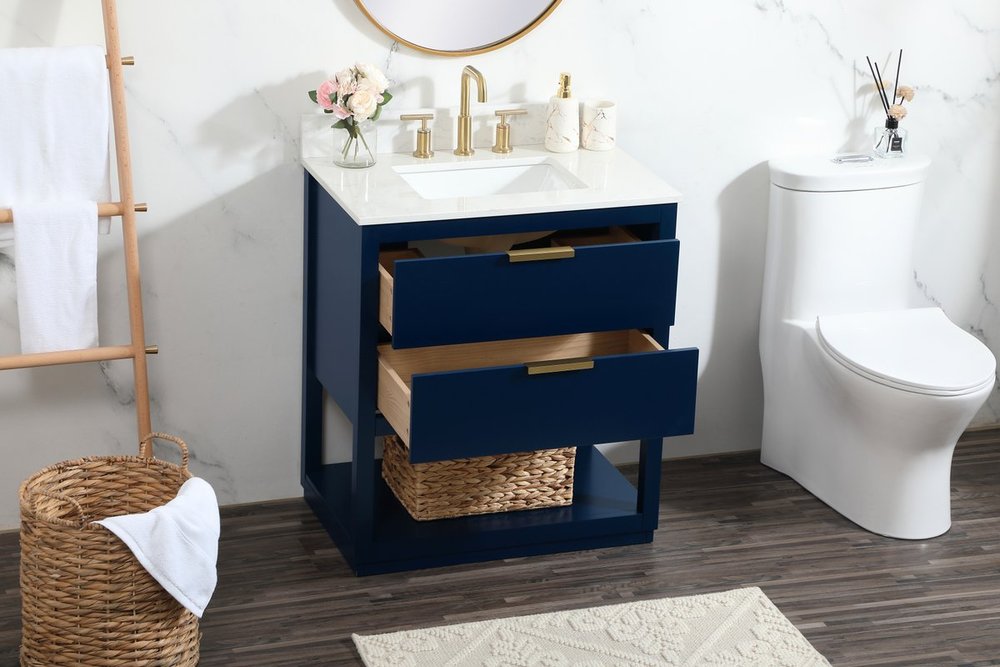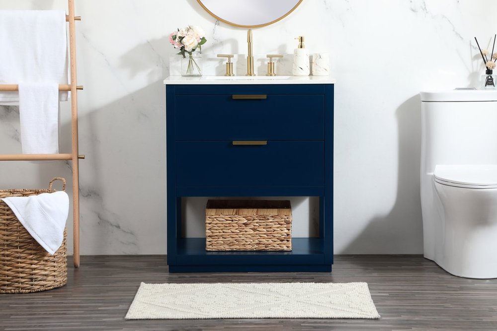 Live in modern comfort with this 30" blue finish vanity. Dressed in a blue and sleek gold metal hardware, its contemporary style will have your bathroom or powder room elevated in modern sophistication. The open shelf at the base and two drawers reveal ample storage space for your bathroom essentials and miscellany. Clean lines create its own visual interest, adding trendy looks to your already chic room. Comes with a matching backsplash to protect your walls.