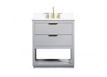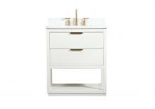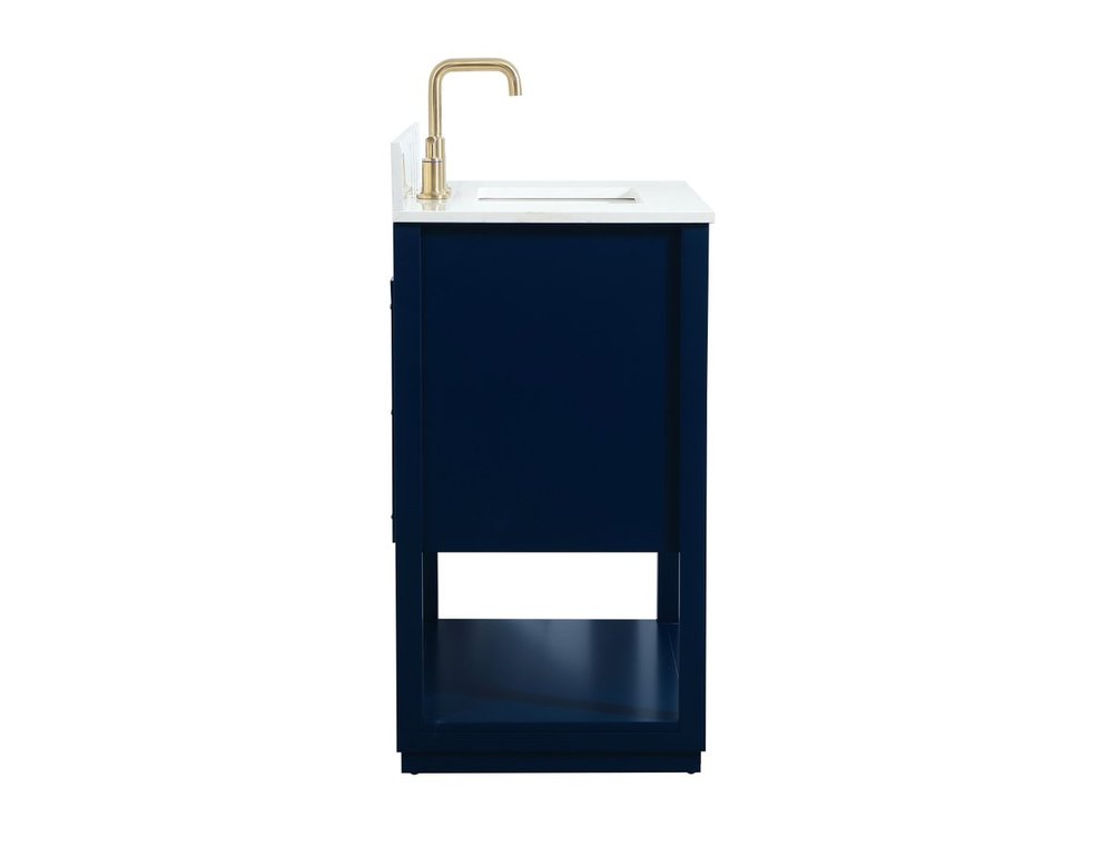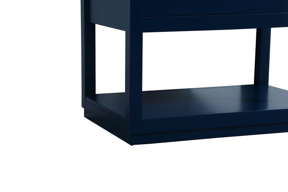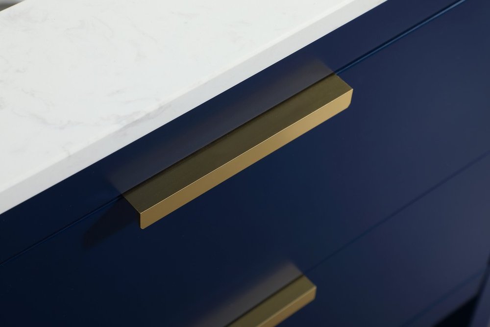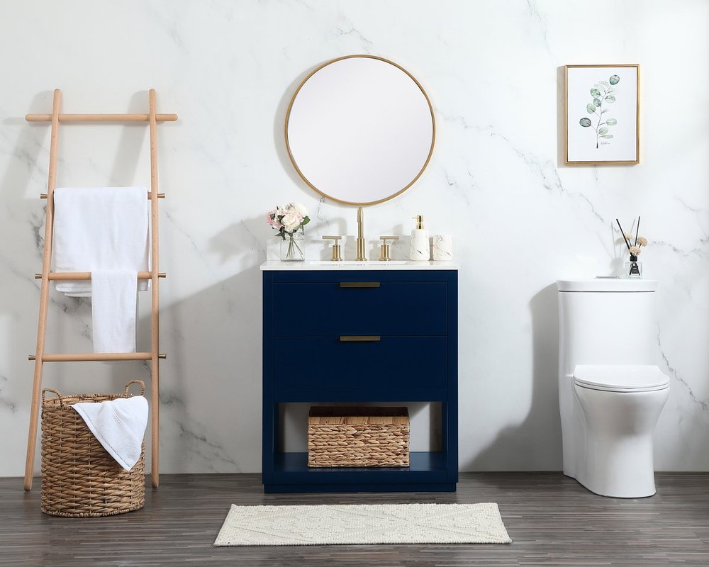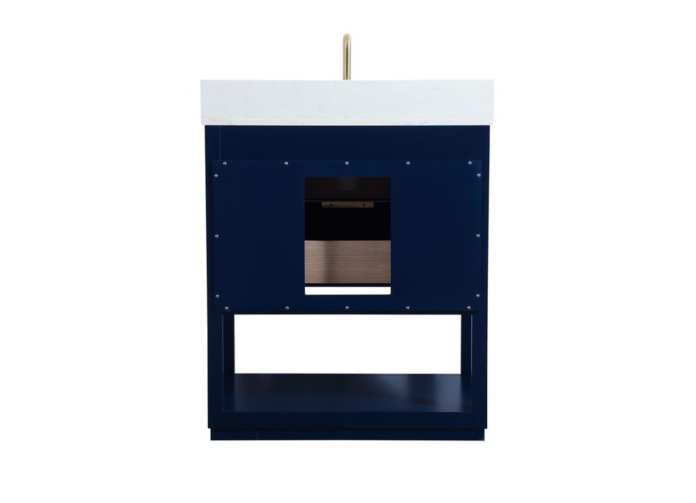 Live in modern comfort with this 30" blue finish vanity. Dressed in a blue and sleek gold metal hardware, its contemporary style will have your bathroom or powder room elevated in modern sophistication. The open shelf at the base and two drawers reveal ample storage space for your bathroom essentials and miscellany. Clean lines create its own visual interest, adding trendy looks to your already chic room. Comes with a matching backsplash to protect your walls.