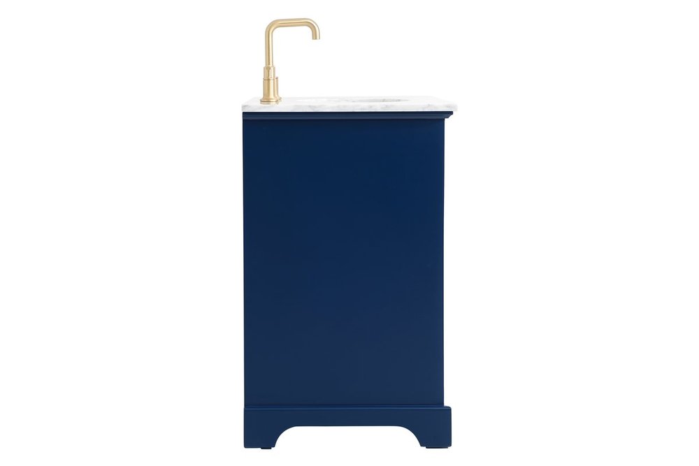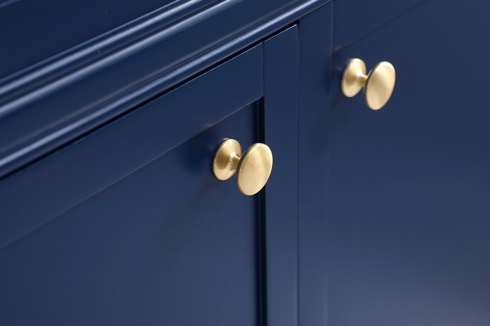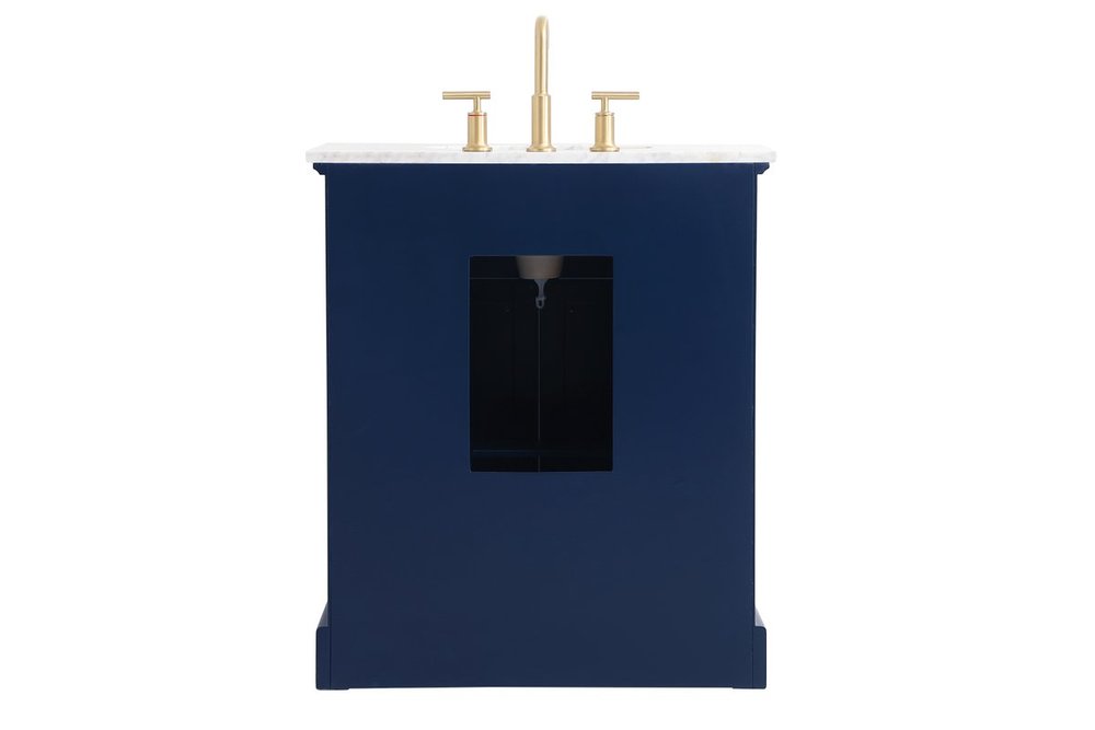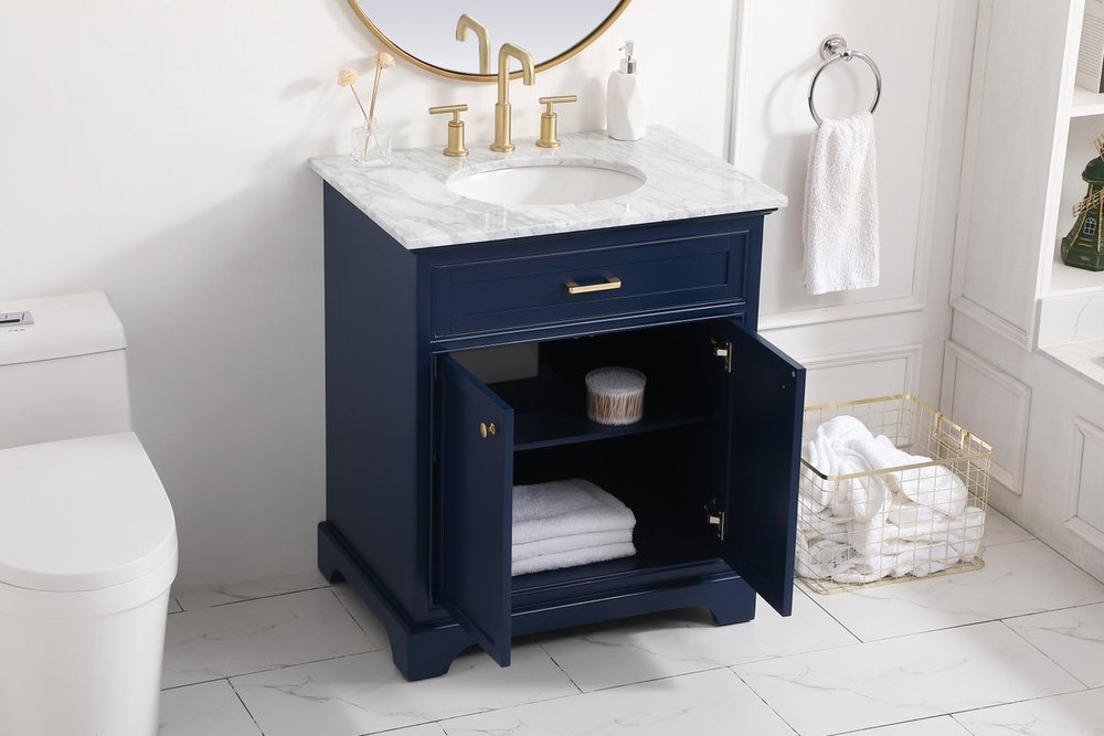 From its Italian Carrara white marble top to its contemporary-styled hand painted blue cabinet, this member of our “Americana” vanity collection is sure to enhance either your home or office bathroom. Beneath its lustrous, natural marble top and an oval, white porcelain under mount sink, a handsome 2-door cabinet with a Single shelf for all your bathroom essentials, highlighted with recessed panel doors, brushed gold bar handle and knobs, stands on strong solid pedestal feet. A wonderful balance of simplicity and practical function! Measurements: W30”xD21.5”xH35”