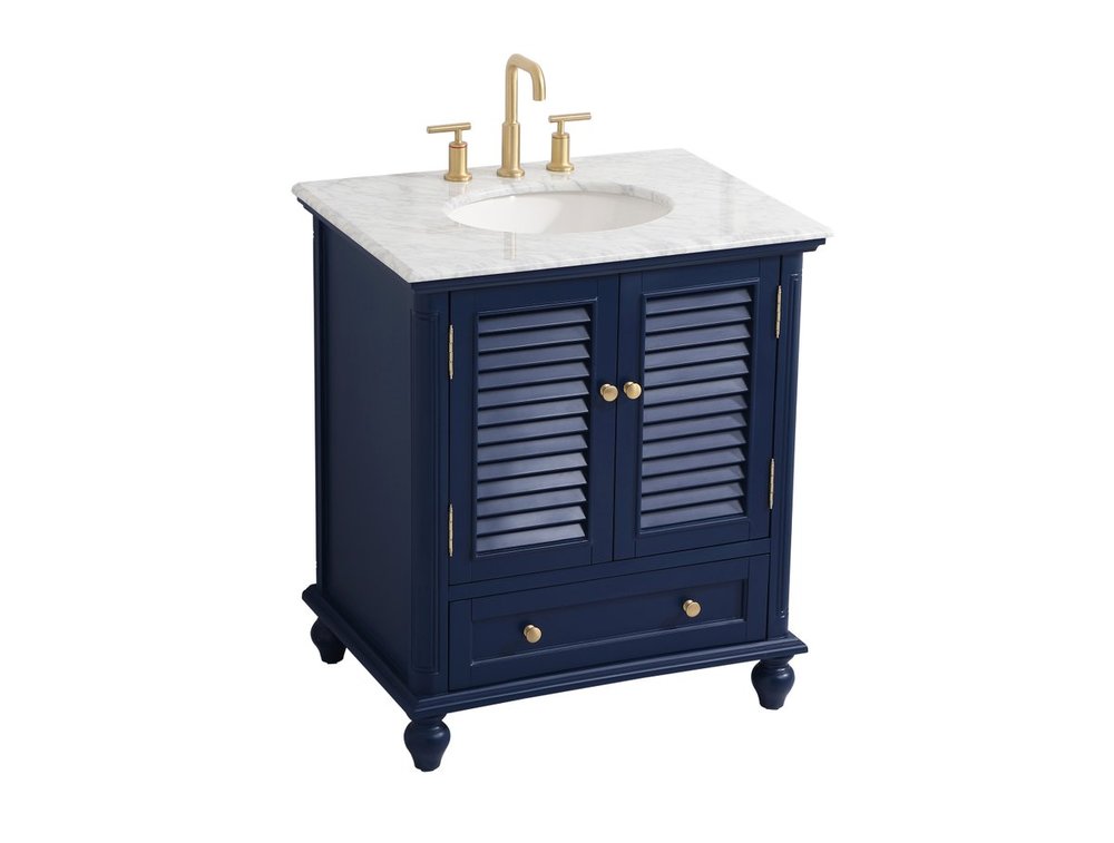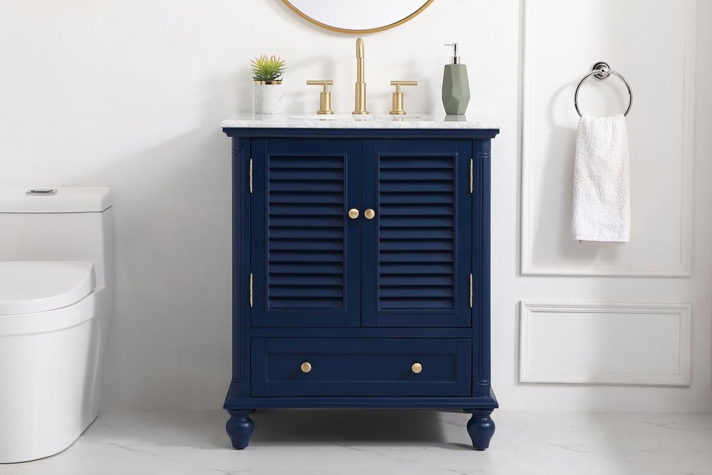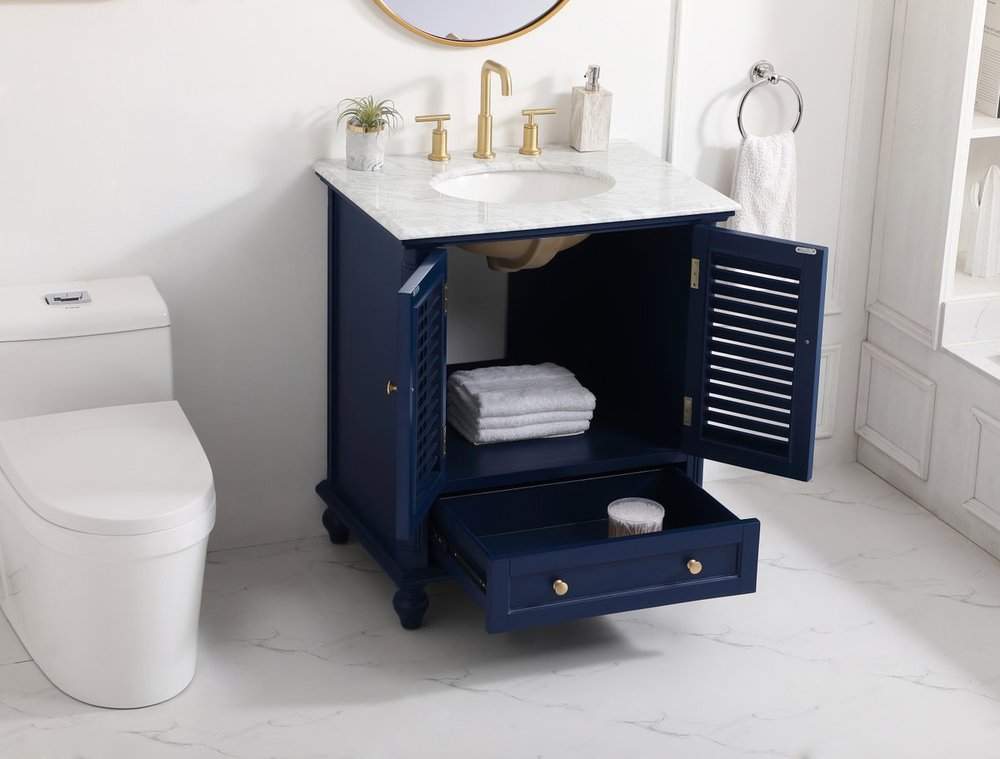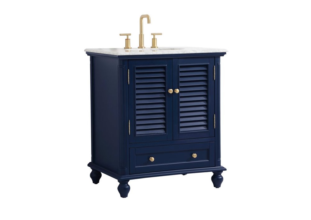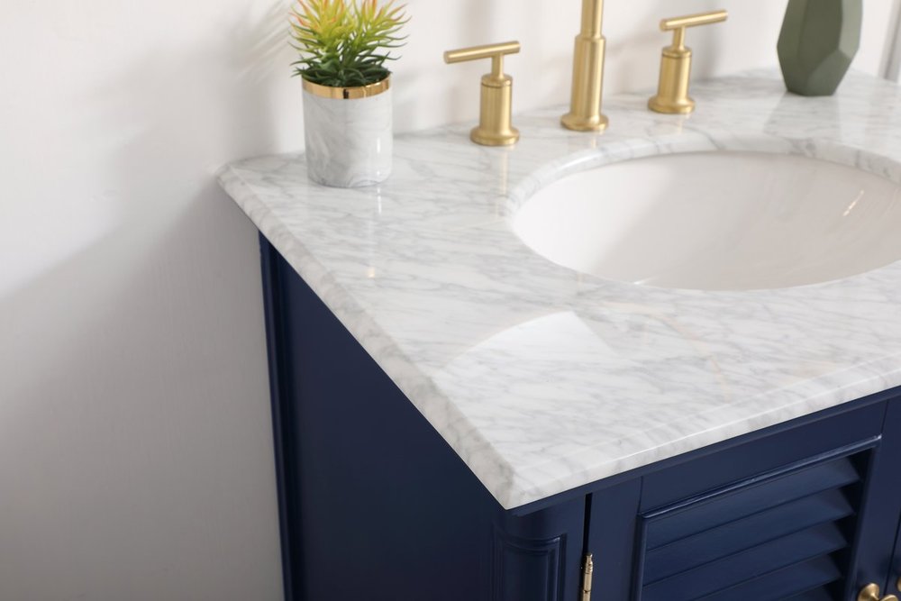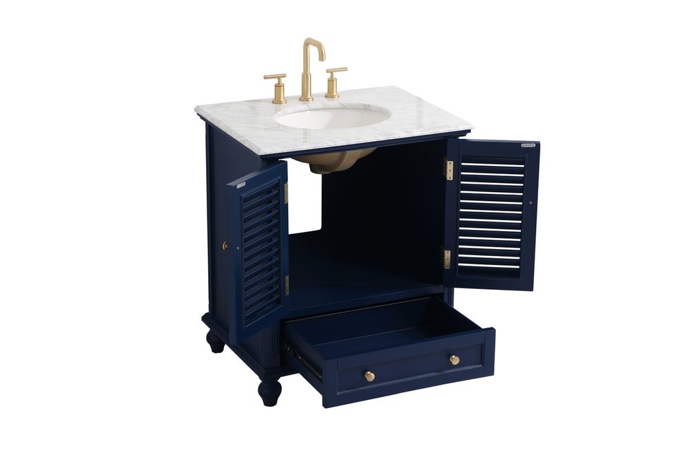 A small space doesn't mean you have to settle for less. The Rhodes collection compact vanity will add lovely sophistication and complement any small bathroom or powder room, while utilizing its charm and function to provide you with ample storage spaces. Metal round knobs gently adorn the shuttered cabinet door and drawer at the base, allowing for you to store away your bathroom essentials. The Carrara white marble countertop, porcelain undermount sink, dignified subtle engravings on the side edges, and rounded legs all come together to create contemporary beauty. Work with your space, and design a beautiful room, no matter the size.