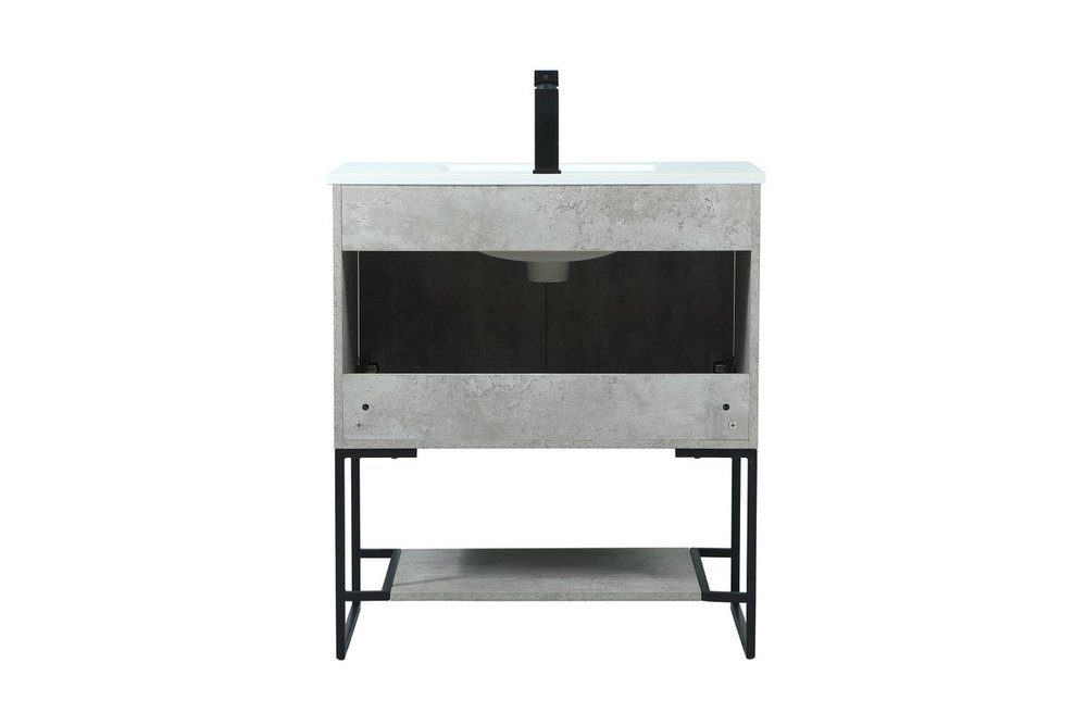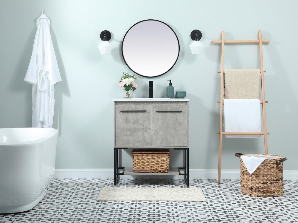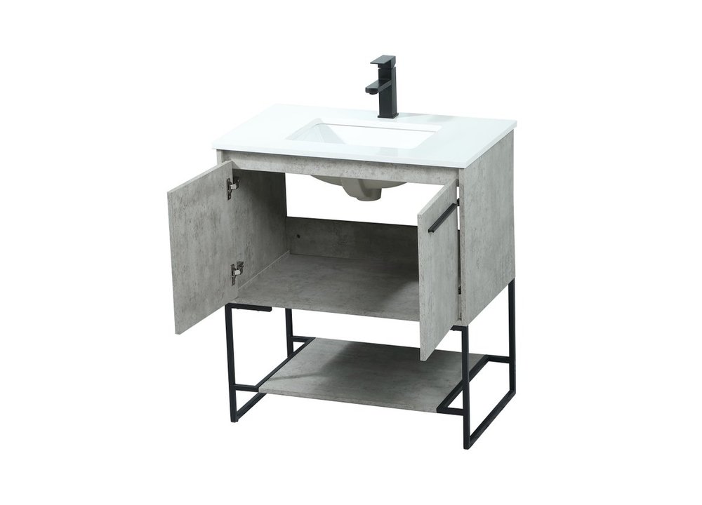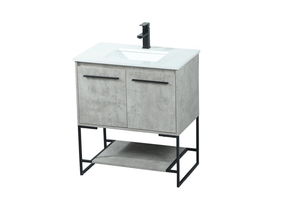 Live in modern comfort with this 30" concrete grey finish vanity. Dressed in a concrete grey and sleek black metal hardware, its contemporary style will have your bathroom or powder room elevated in industrial sophistication. The open shelf at the base and two doors reveal ample storage space for your bathroom essentials and miscellany. Clean lines create its own visual interest, adding trendy looks to your already chic room.