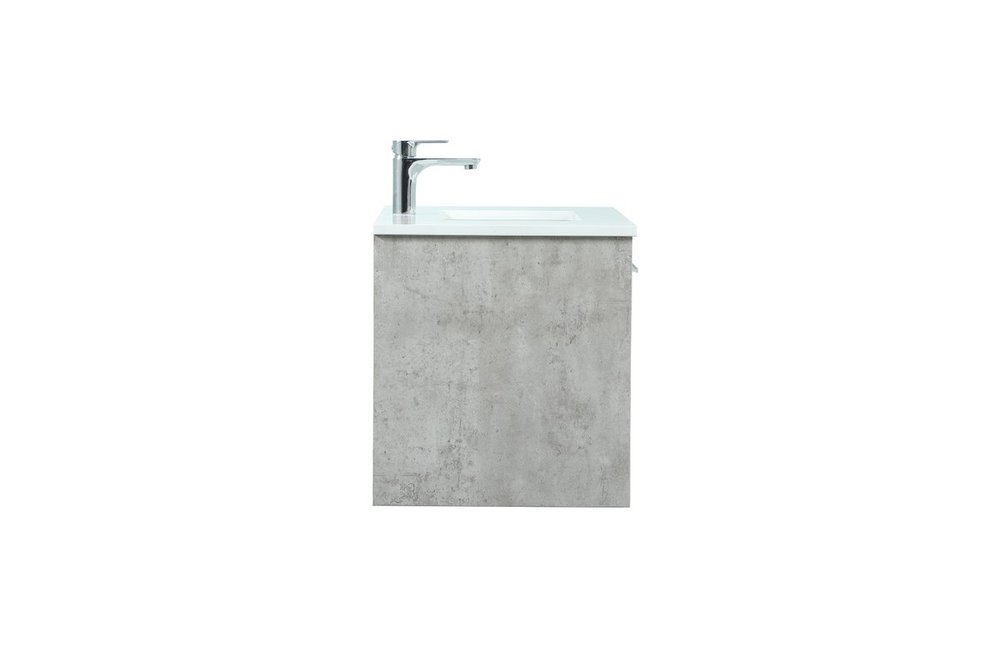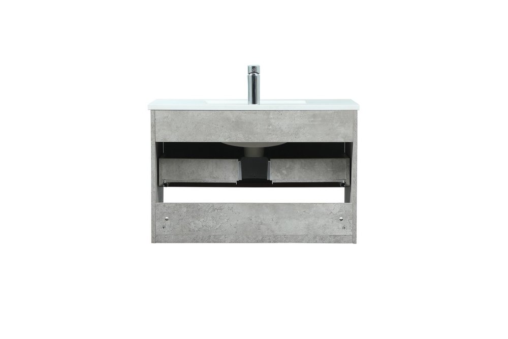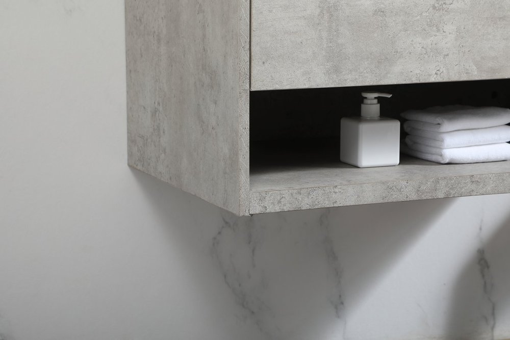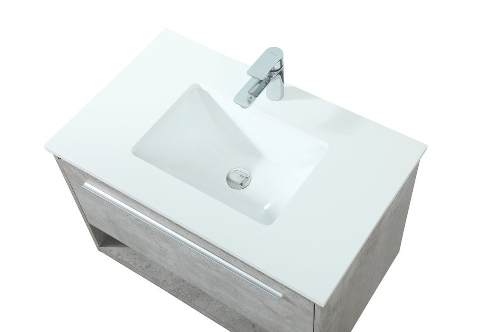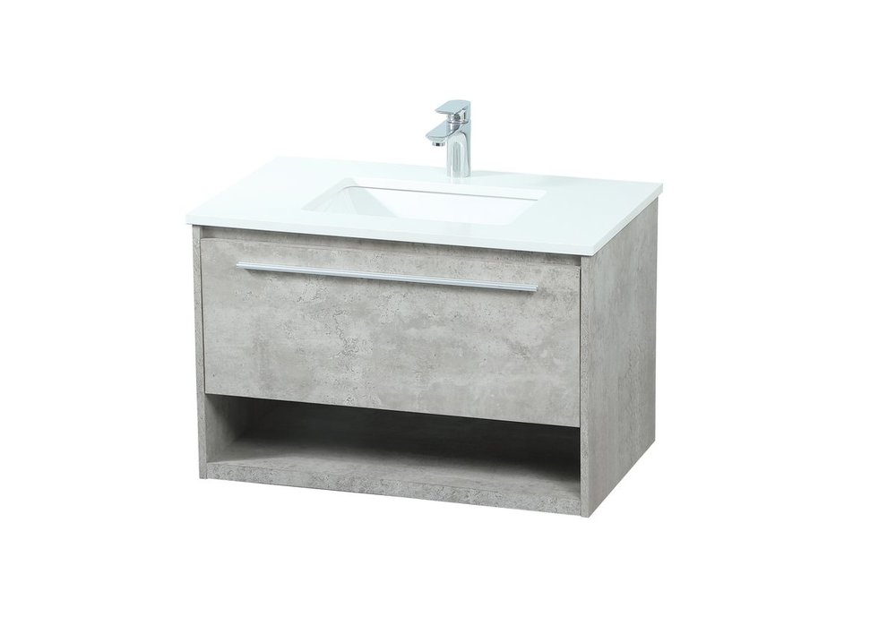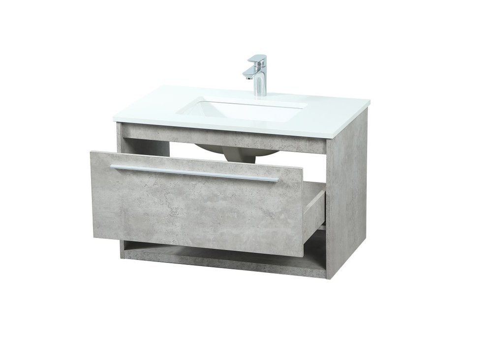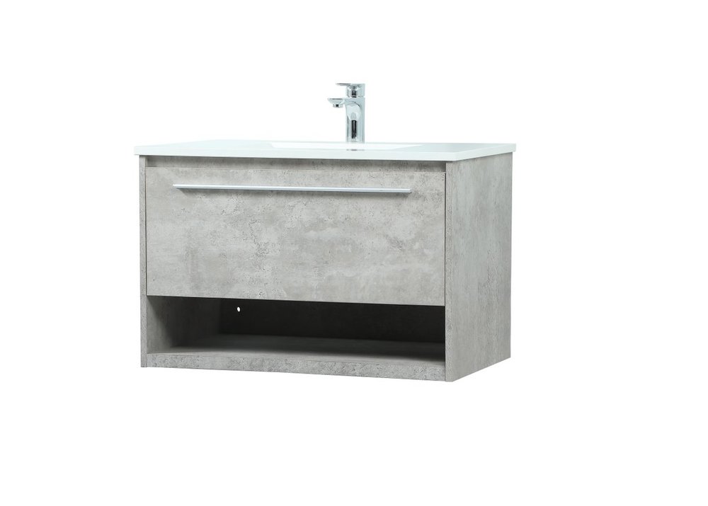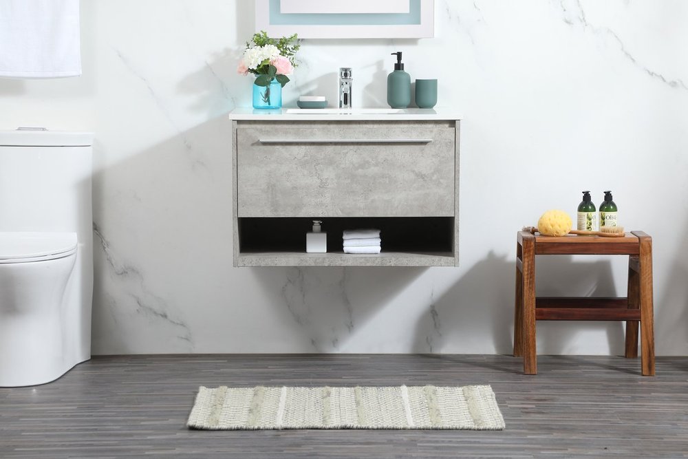 Save space and make your bathroom appear bigger with this floating vanity. Its minimal design will have you in awe, while its clean lines will leave your room feeling fresh and uncluttered. The Single u-drawer pulls out for storage while the open space below allows you to place extra towels or various other essentials. The ivory white engineered marble counter top with porcelain sink adds refined luxe while the aluminum barpull style handle adorn the vanity face.