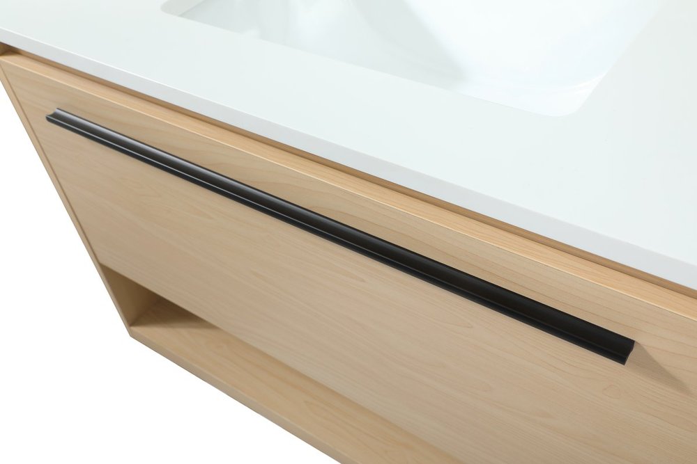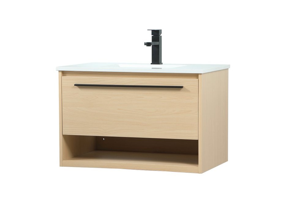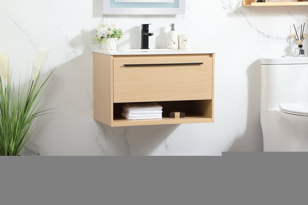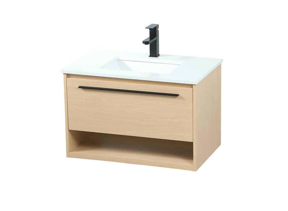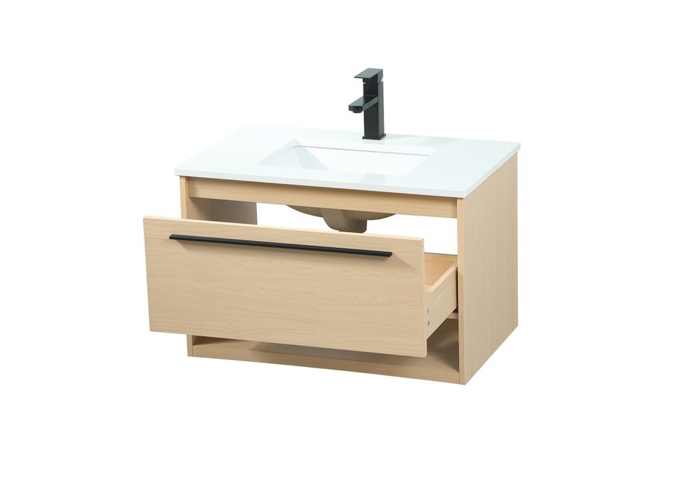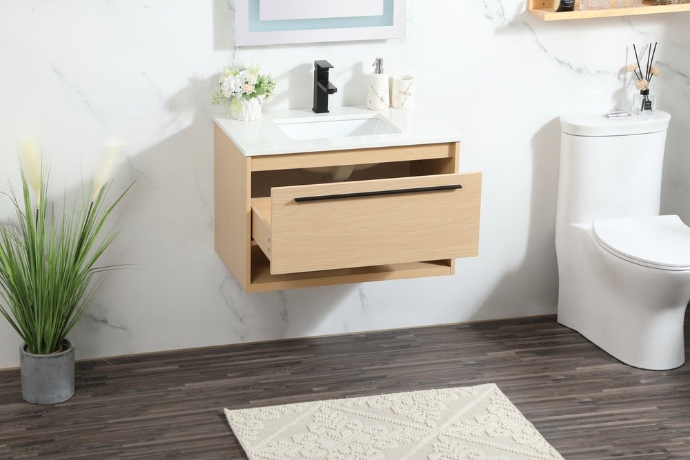 Save space and make your bathroom appear bigger with this floating vanity. Its minimal design will have you in awe, while its clean lines will leave your room feeling fresh and uncluttered. The Single u-drawer pulls out for storage while the open space below allows you to place extra towels or various other essentials. The ivory white engineered marble counter top with porcelain sink adds refined luxe while the aluminum barpull style handle adorn the vanity face.