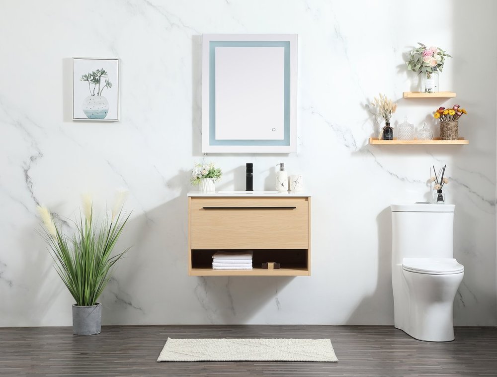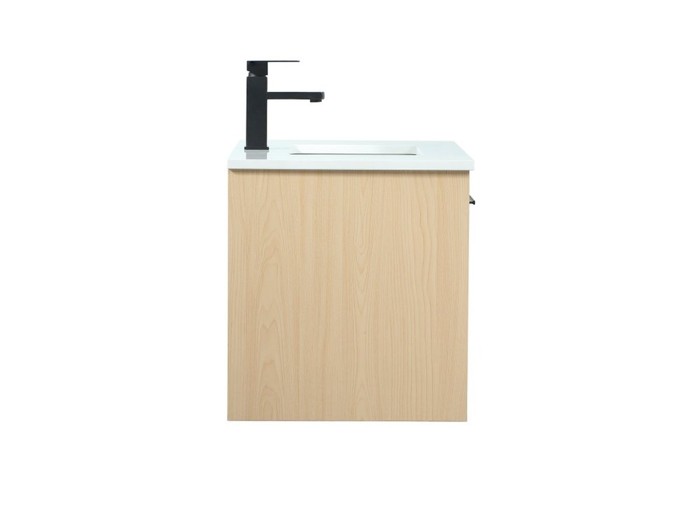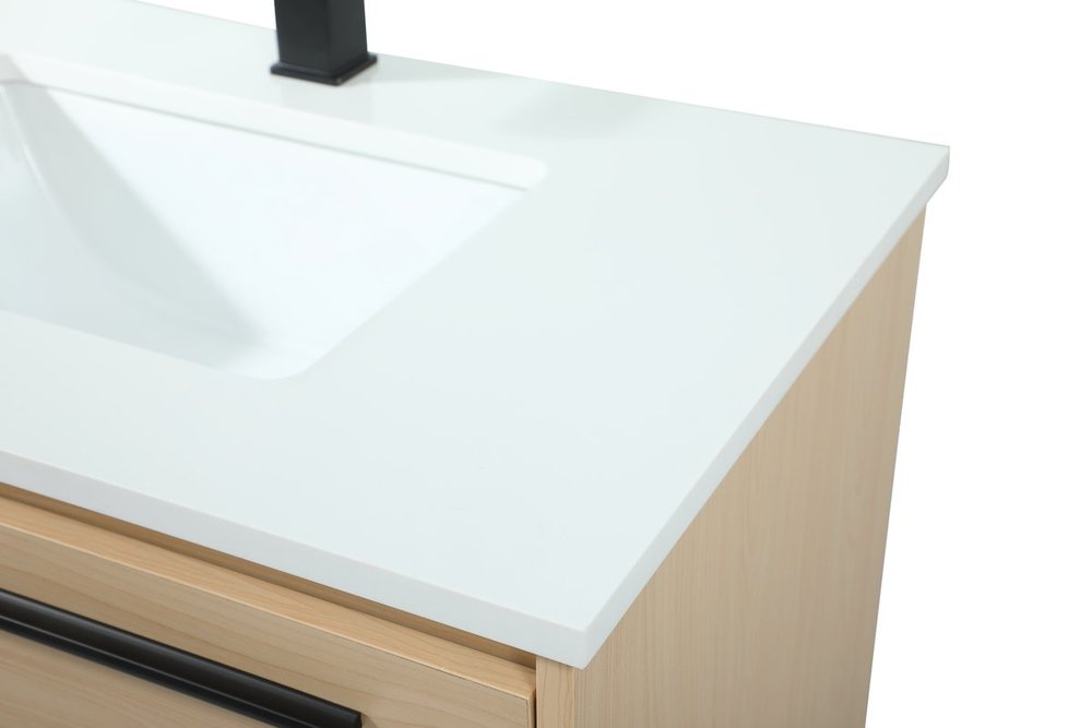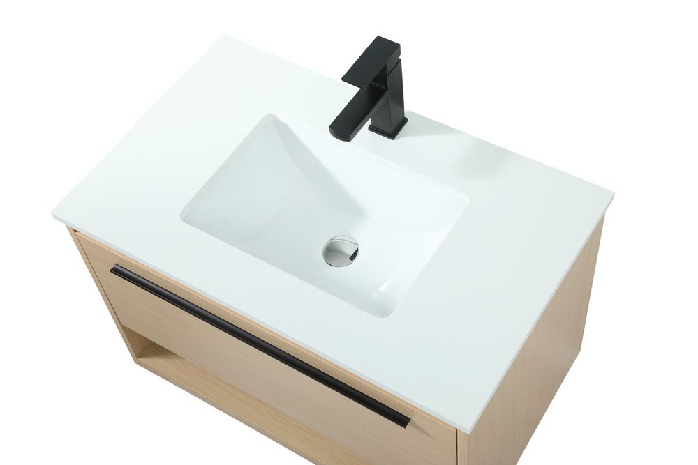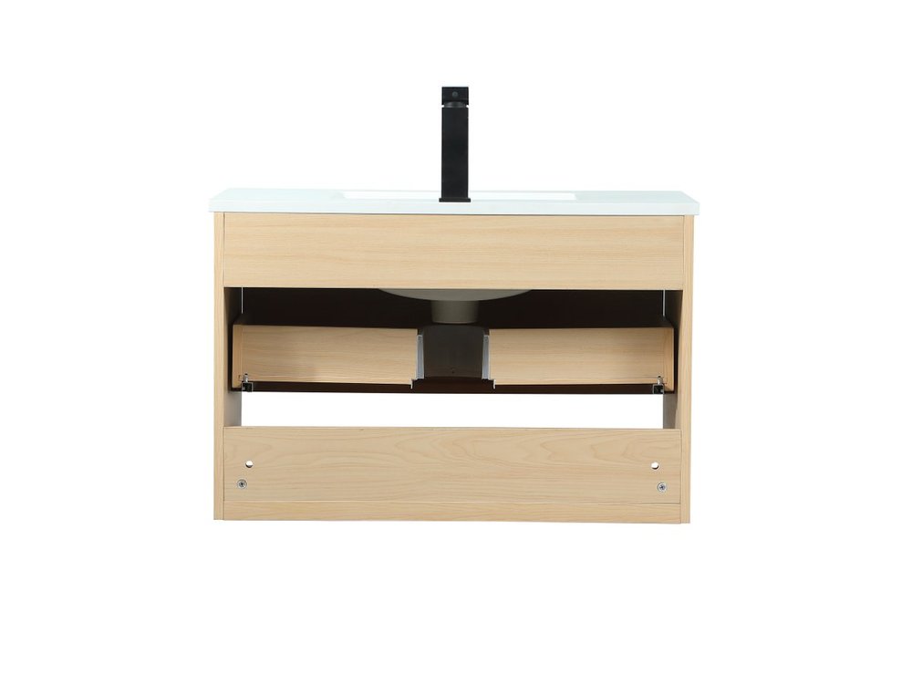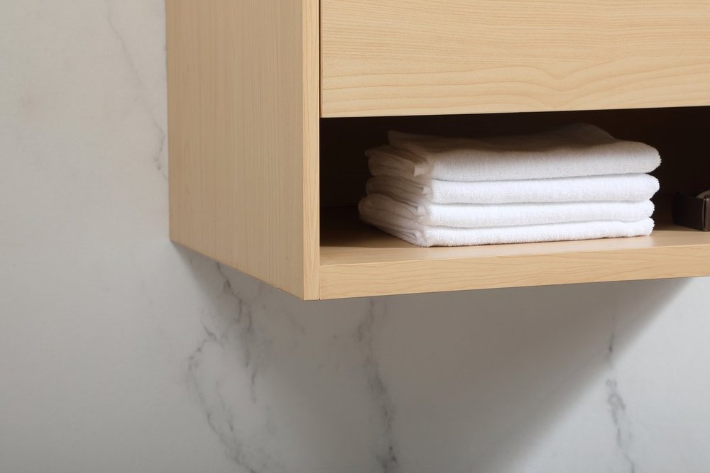 Save space and make your bathroom appear bigger with this floating vanity. Its minimal design will have you in awe, while its clean lines will leave your room feeling fresh and uncluttered. The Single u-drawer pulls out for storage while the open space below allows you to place extra towels or various other essentials. The ivory white engineered marble counter top with porcelain sink adds refined luxe while the aluminum barpull style handle adorn the vanity face.