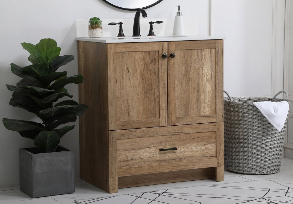 Delve into a world of minimalistic fashion and contemporary styling with this farmhouse 30" vanity. The clean faux lines anchors the weathered design. Black handle adorns the two doors hiding the base of the integrated porcelain sink while the bottom drawer allows you to store your bathroom necessities and toiletries. The compact size makes it the perfect vanity for any bathroom or powder room, regardless of size. Comes with a matching backsplash to complete the look and protects your wall.