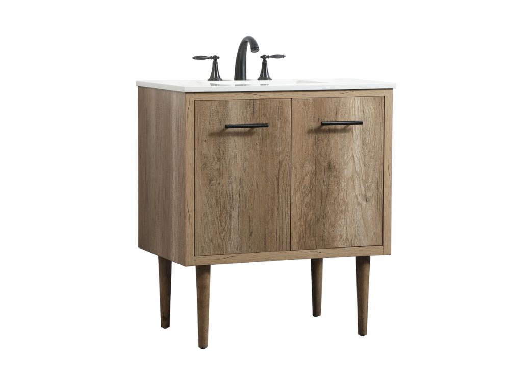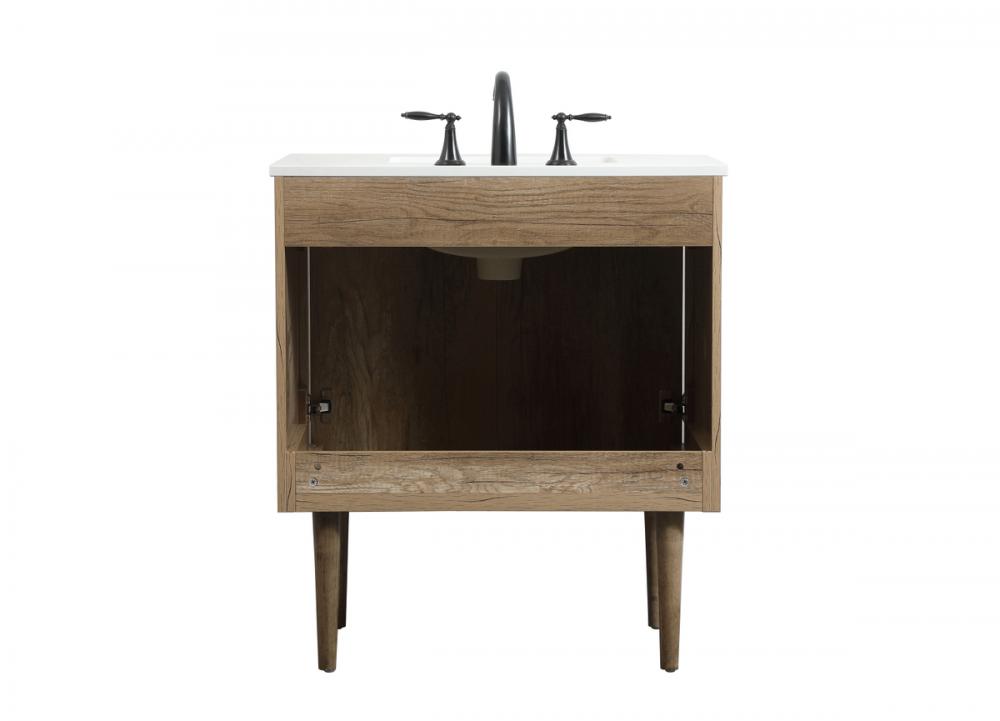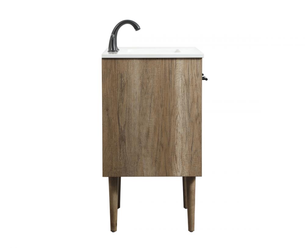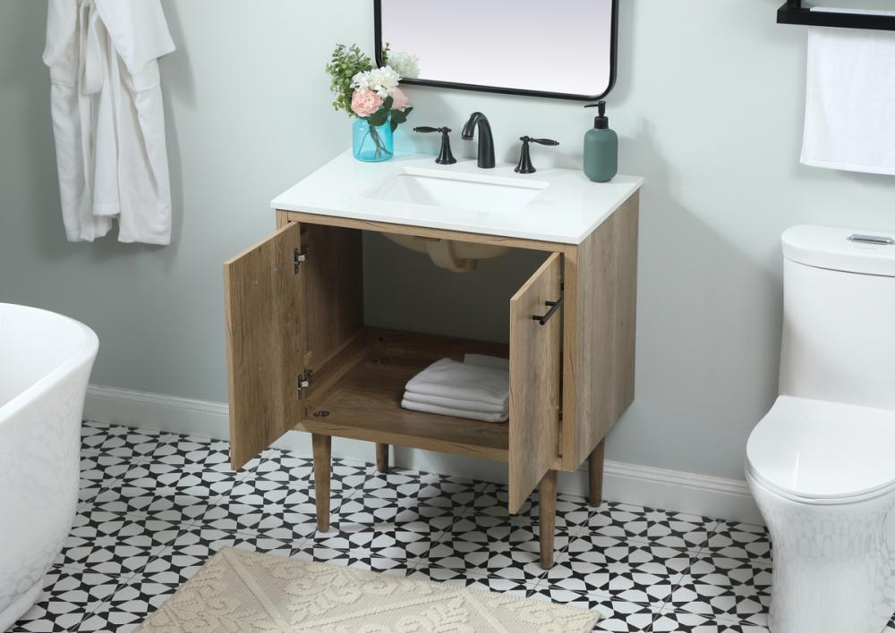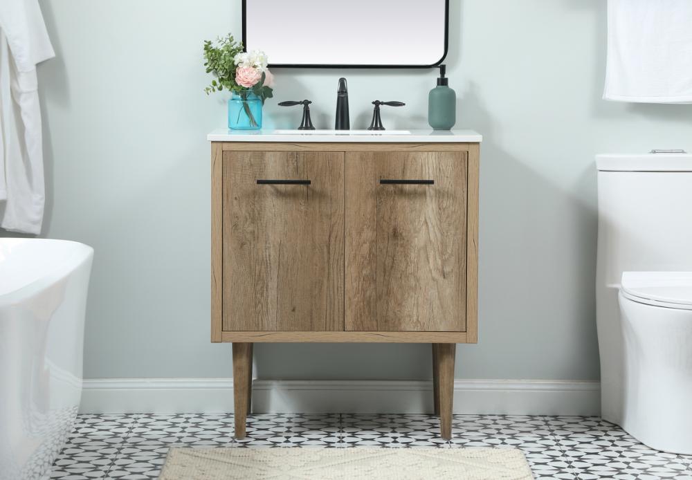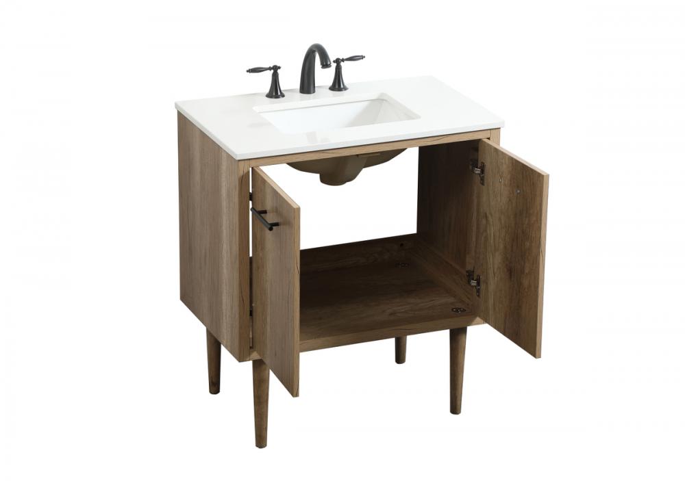 Delve into a world of minimalistic fashion and contemporary styling with this midcentury modern vanity. The clean lines anchors the design, while the straight tapered cylinder legs add subtle interest. Bar pull handle adorns the soft closing door hiding the base of the rectangular porcelain sink and letting you store your bathroom necessities and toiletries. Whether you want to use this as a floating vanity or a freestanding vanity, the choice is yours. The durable ivory white engineered marble countertop complements the manufactured wood base vanity and is built to last.