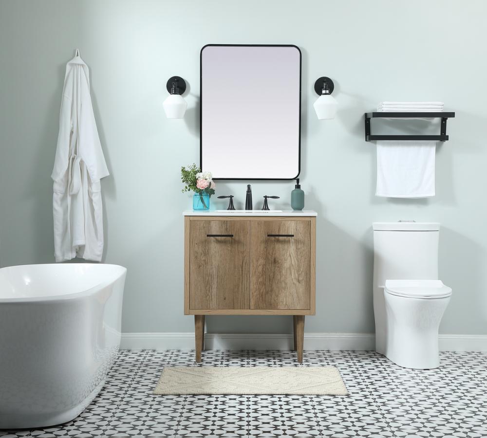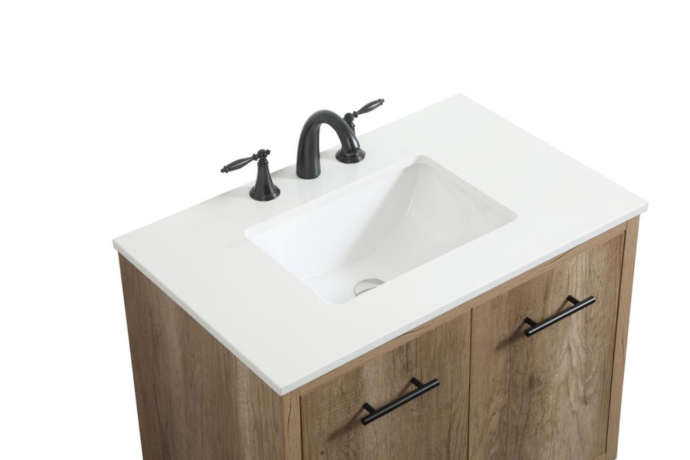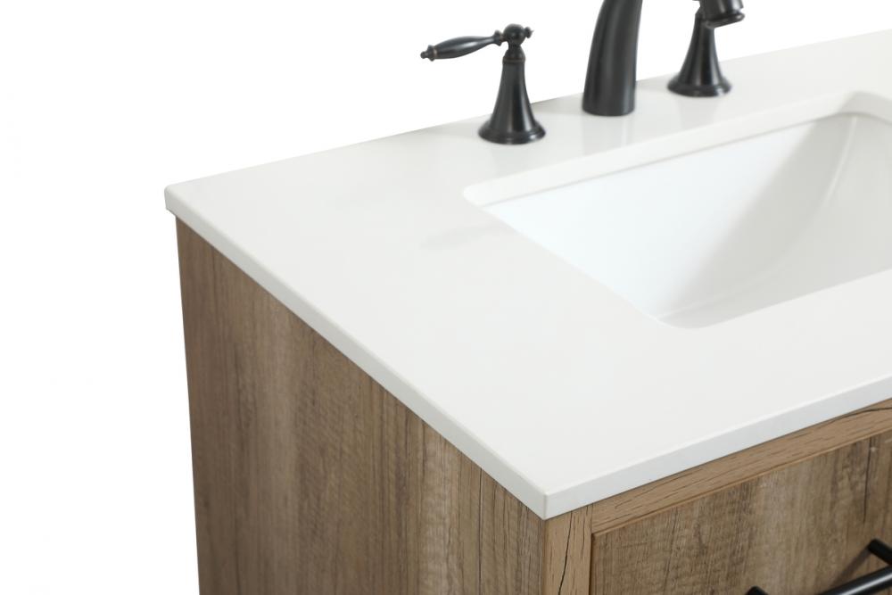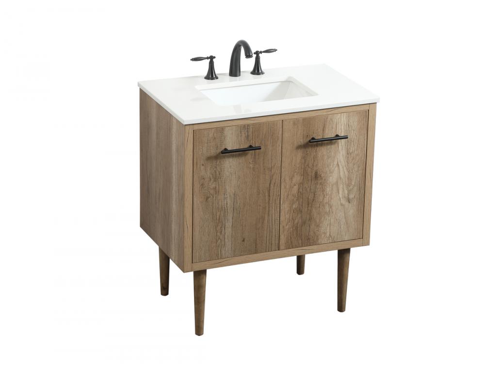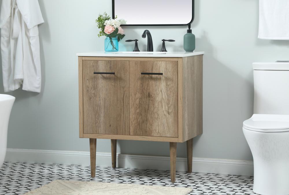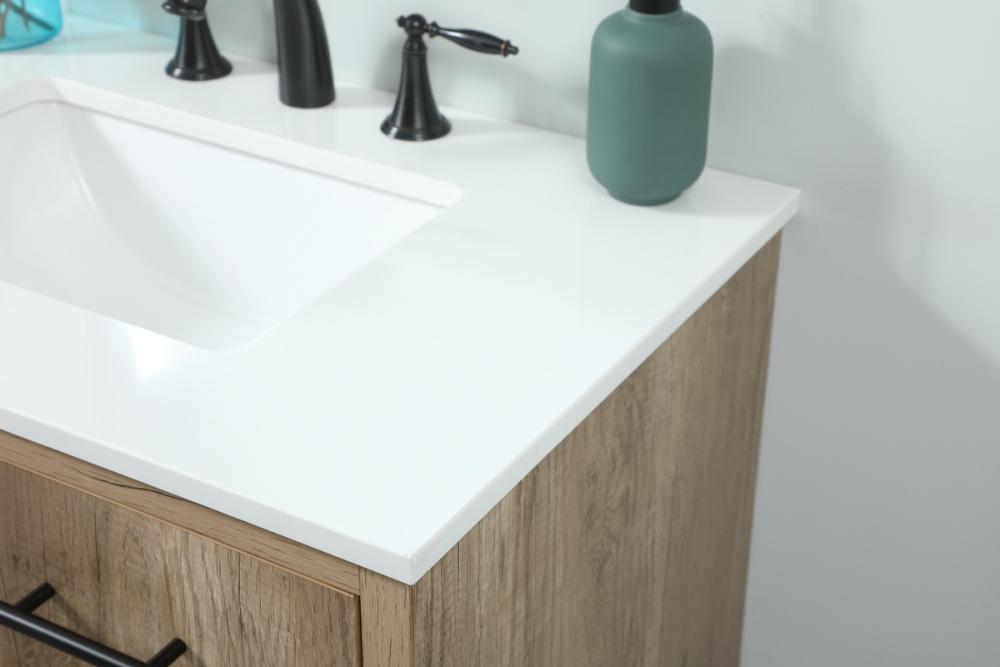Delve into a world of minimalistic fashion and contemporary styling with this midcentury modern vanity. The clean lines anchors the design, while the straight tapered cylinder legs add subtle interest. Bar pull handle adorns the soft closing door hiding the base of the rectangular porcelain sink and letting you store your bathroom necessities and toiletries. Whether you want to use this as a floating vanity or a freestanding vanity, the choice is yours. The durable ivory white engineered marble countertop complements the manufactured wood base vanity and is built to last.