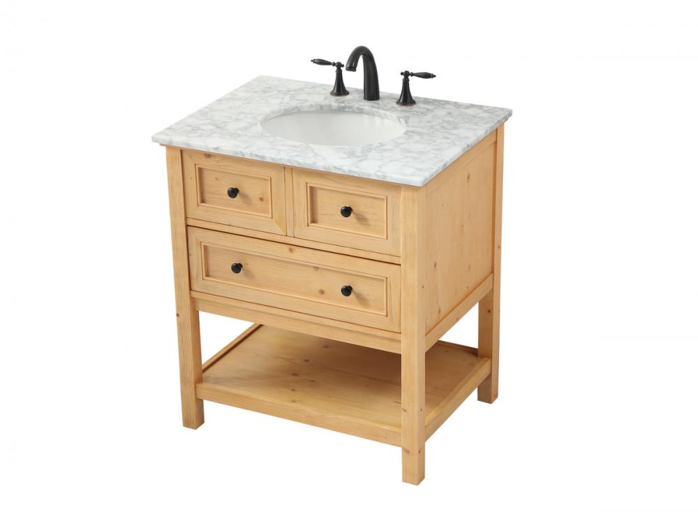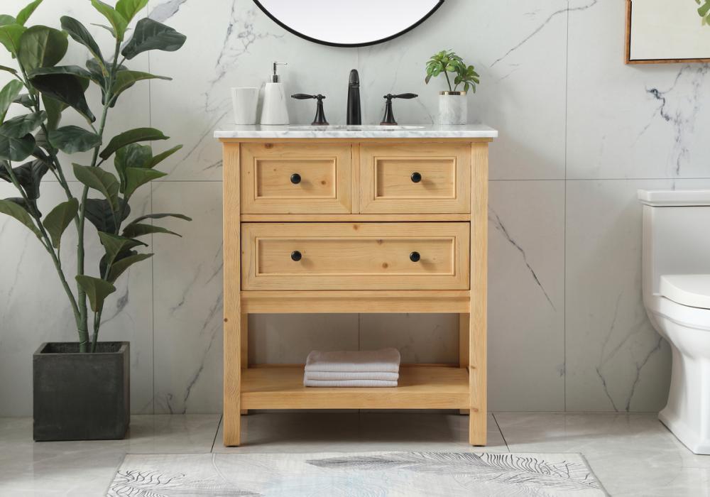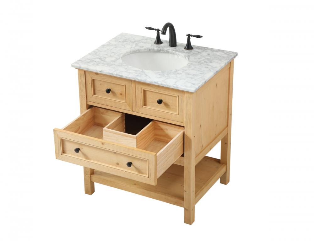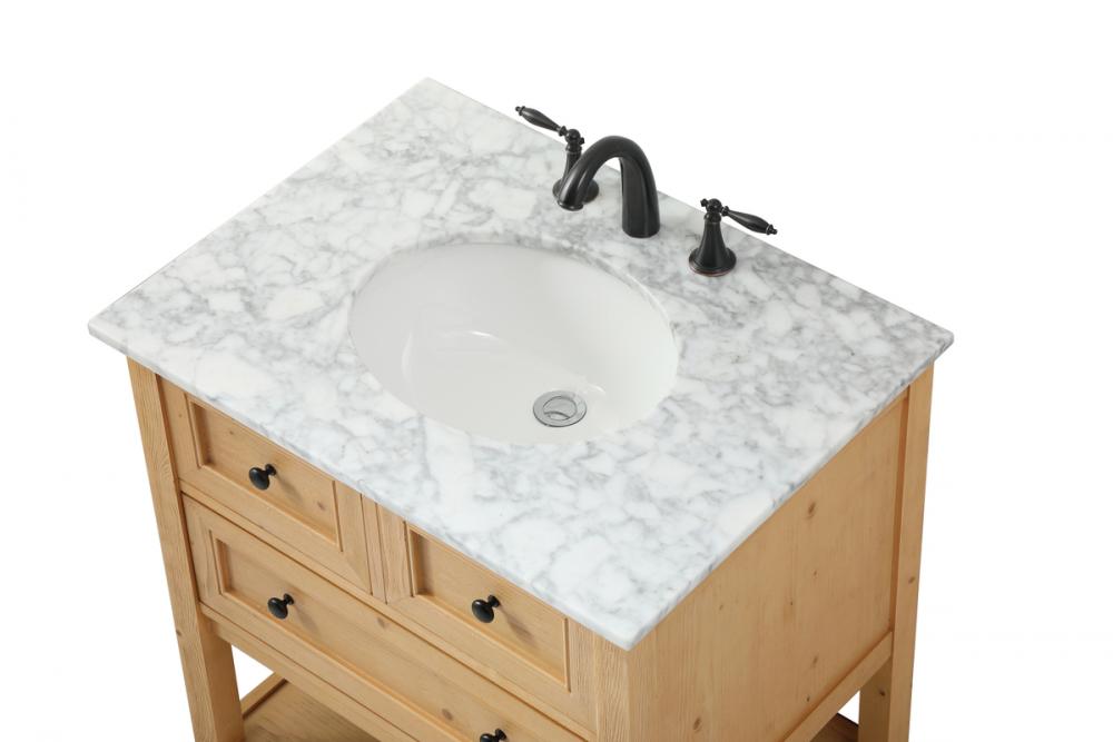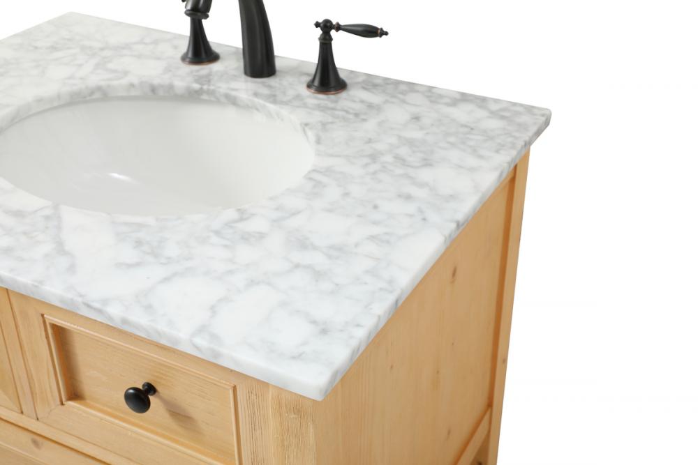 Clean lines and classic form can truly add a fresh look to your bathroom or powder room. This vanity, complemented by round hardware, will surely charm you with its confident style and subtle charisma. This vanity can store all of your bathroom toiletries, from extra towels to make up essentials. The vanity is crowned with carrara white marble and includes a porcelain undermount sink--adding both function and form that will truly amaze.