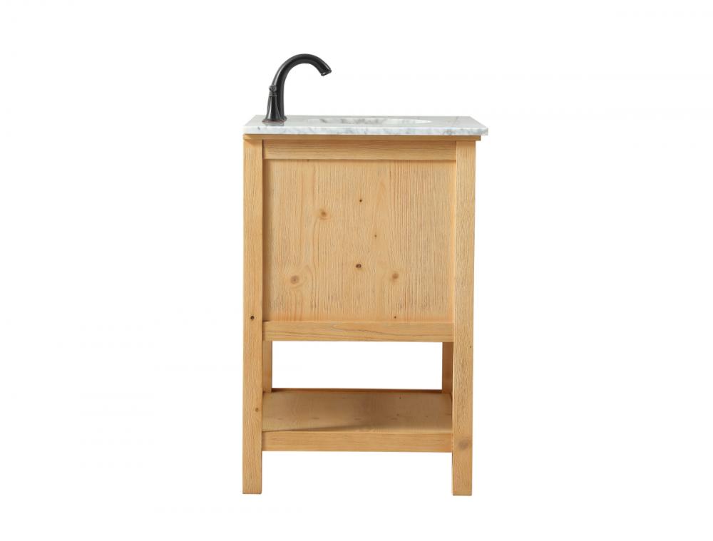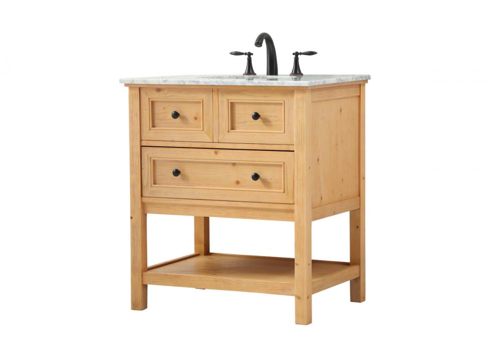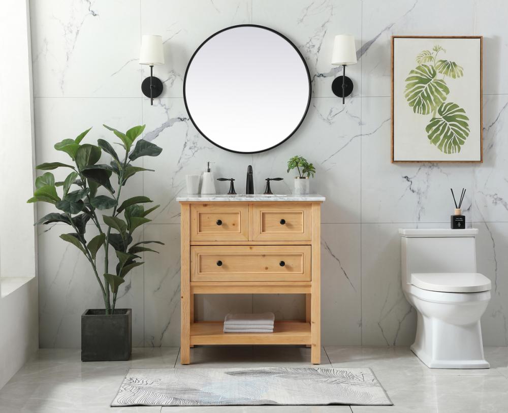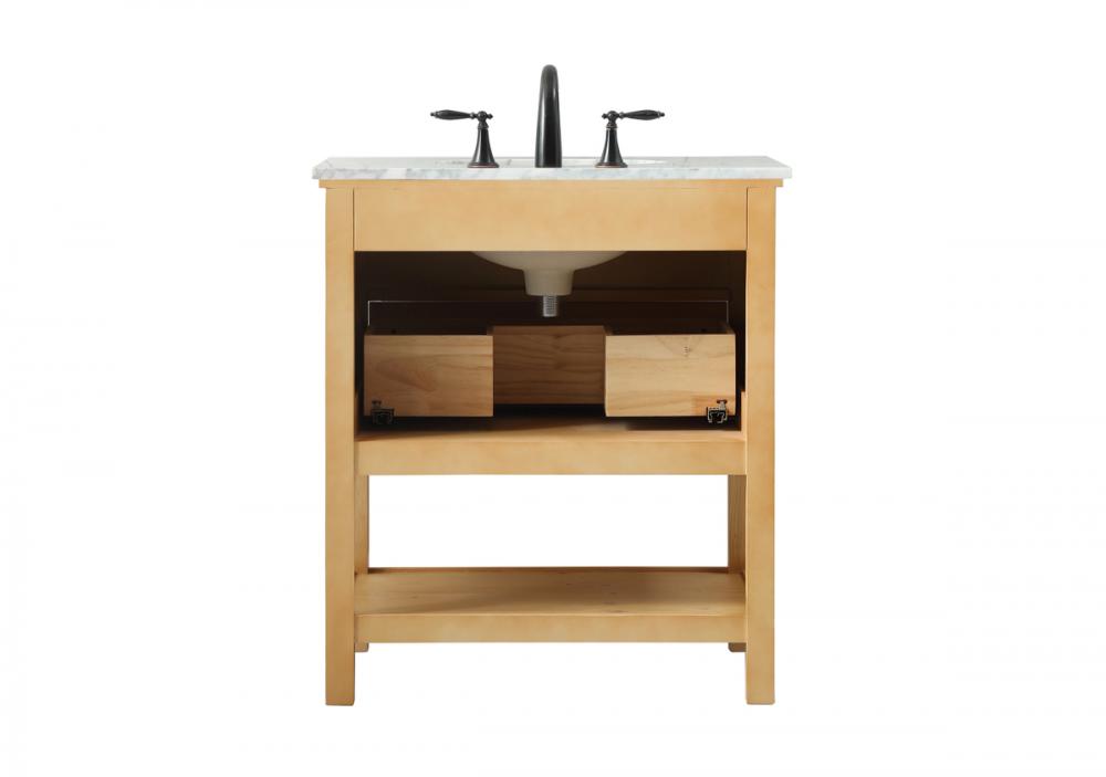 Clean lines and classic form can truly add a fresh look to your bathroom or powder room. This vanity, complemented by round hardware, will surely charm you with its confident style and subtle charisma. This vanity can store all of your bathroom toiletries, from extra towels to make up essentials. The vanity is crowned with carrara white marble and includes a porcelain undermount sink--adding both function and form that will truly amaze.