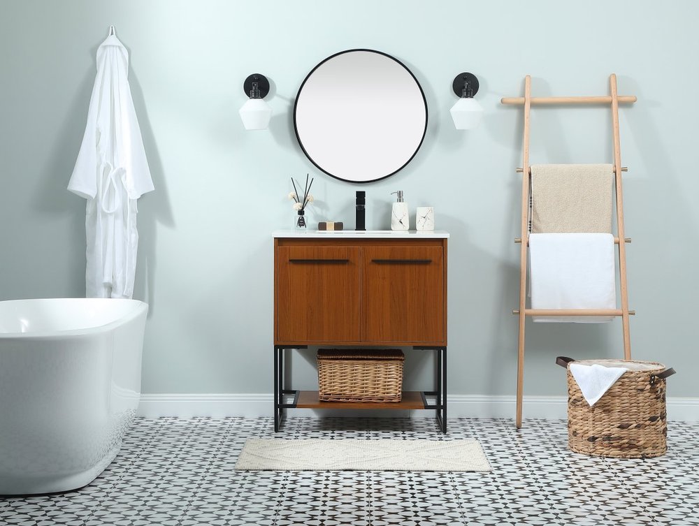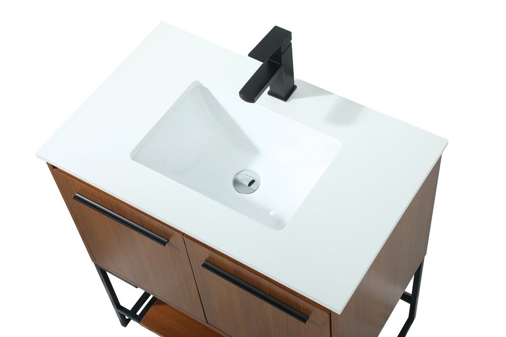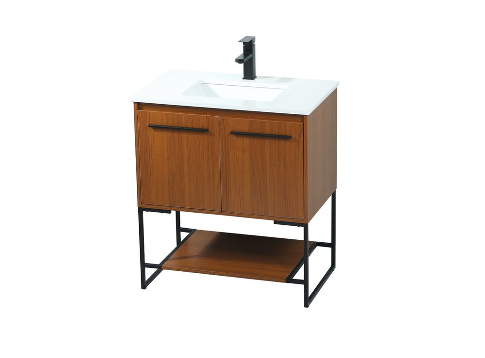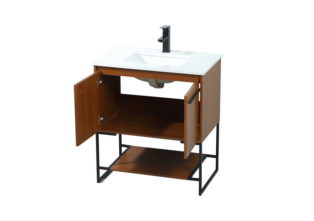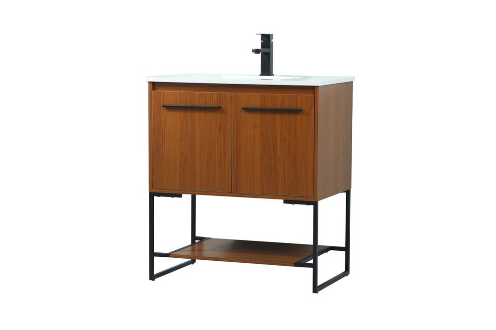 Live in modern comfort with this 30" teak finish vanity. Dressed in a teak and sleek black metal hardware, its contemporary style will have your bathroom or powder room elevated in industrial sophistication. The open shelf at the base and two doors reveal ample storage space for your bathroom essentials and miscellany. Clean lines create its own visual interest, adding trendy looks to your already chic room.