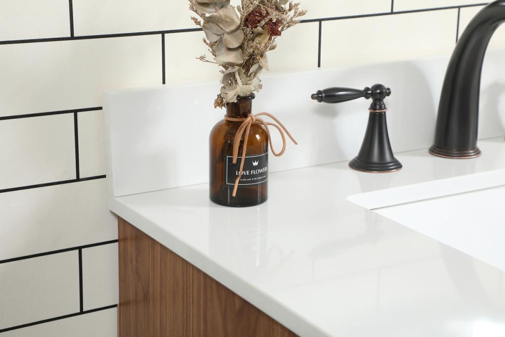 Exquisite modern sophistication is defined with the wood look and black barpulls of this vanity and slender tapered legs. Its length makes it the perfect addition to any sized home, and saves space with its storage area hidden behind the Single cabinet doors and two functional drawers. Topped with a highly durable engineered marble countertop and a porcelain undermount sink, this modern design will become your focal point of your bathroom or powder room. Equipped with soft-closing drawer and doors adds a quiet functional touch. Comes with a matching backsplash to complete the look and protects your wall.